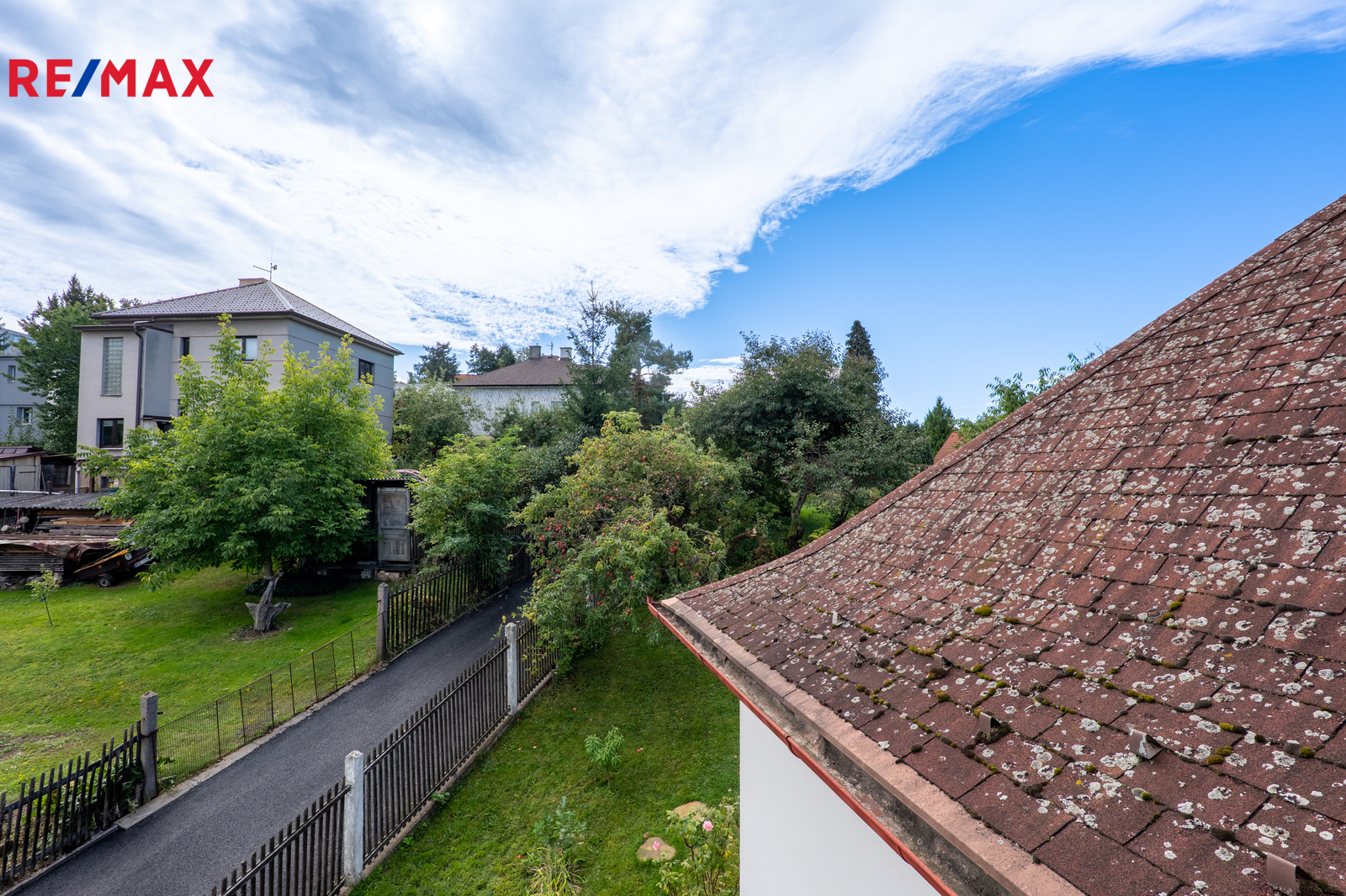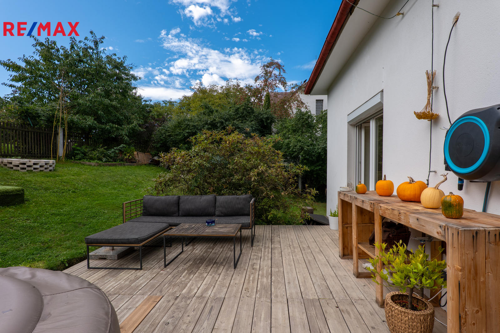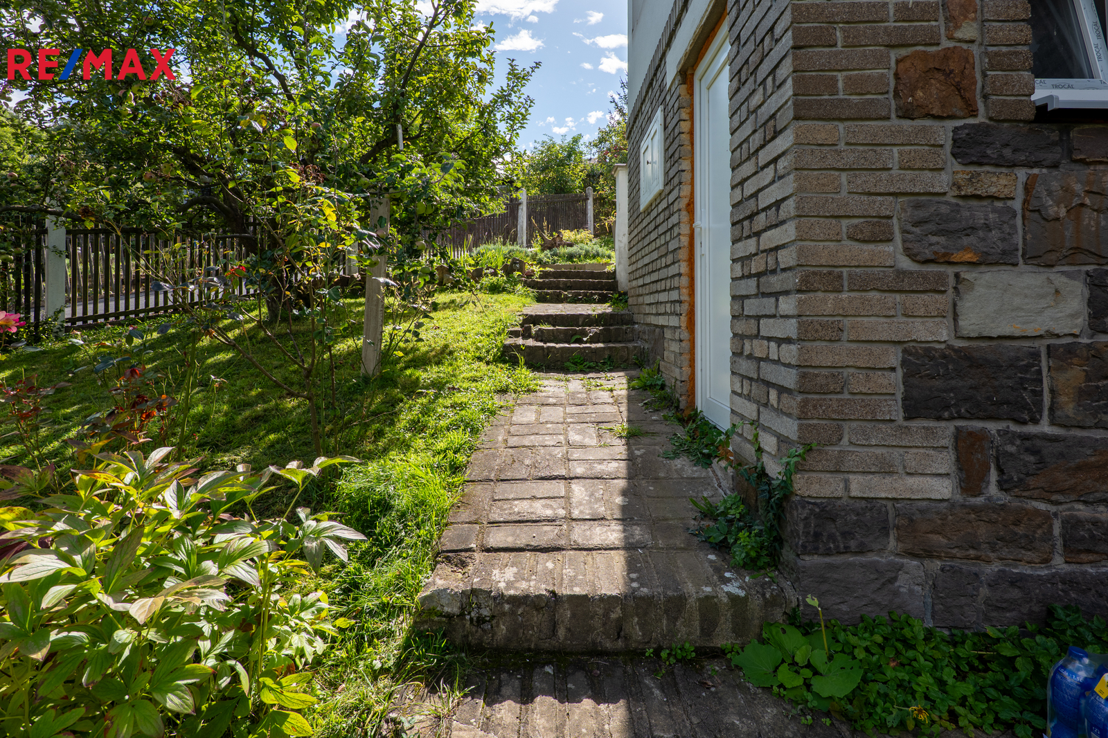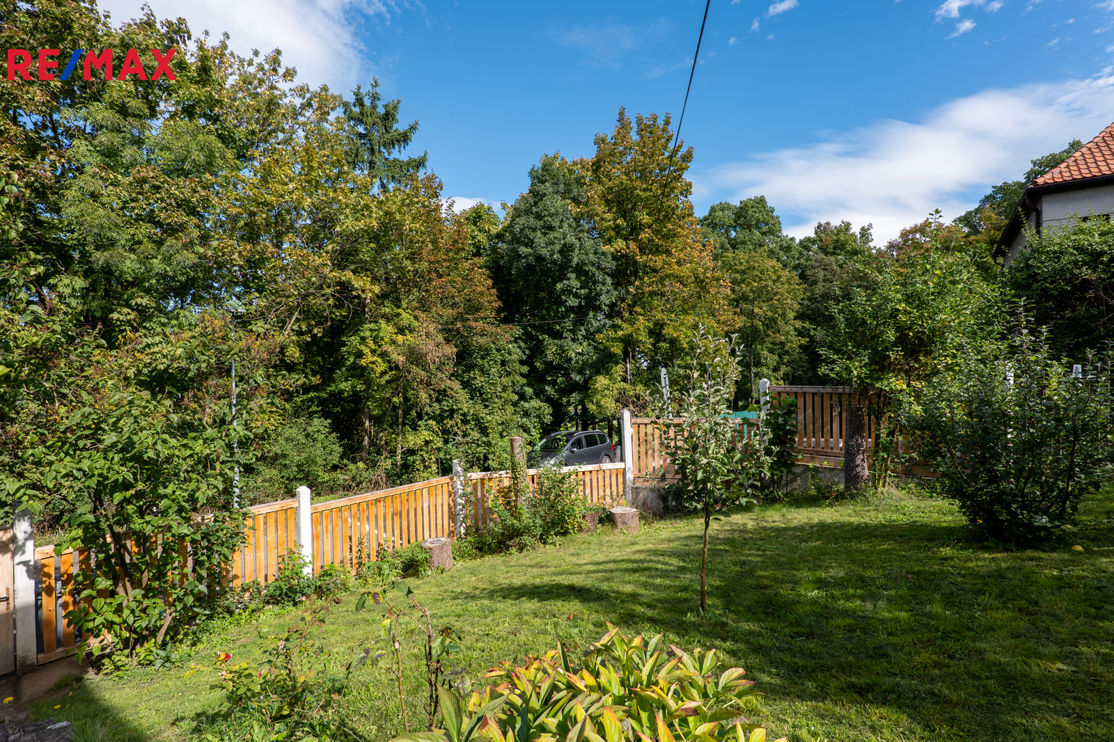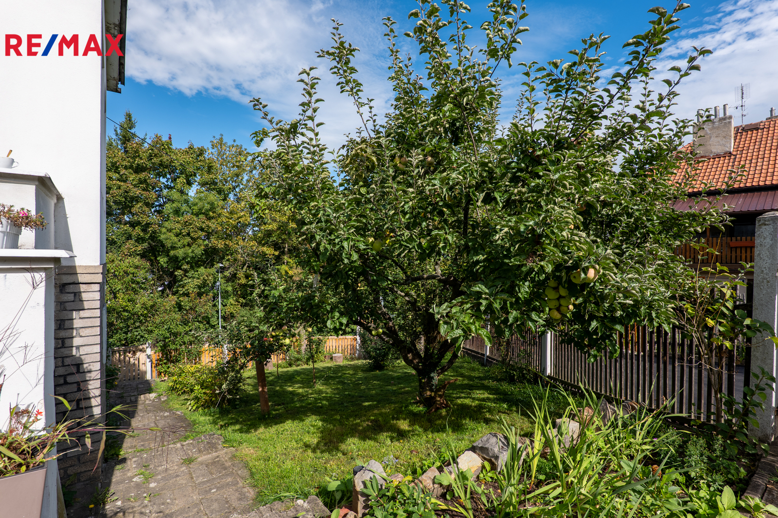 Zahrada o výměře 555 m² s mírným sklonem, samostatný vstup do malého sklepu na uchování potravin a nářadí, terasa 24 m² v 1. NP, balkon ve 2. NP. Parkování přímo před domem pro cca 3 auta.