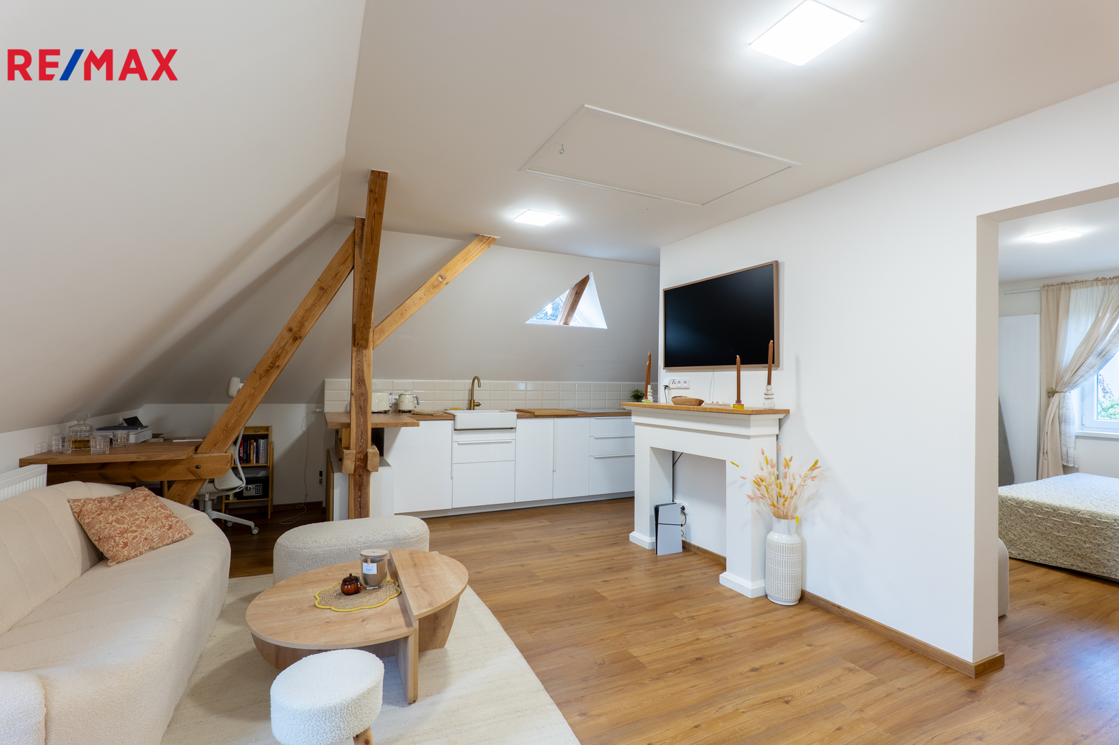 Podkroví (57 m²): jednotka 2+kk s koupelnou a balkonem. Výklopná dvířka se schůdky na půdu.