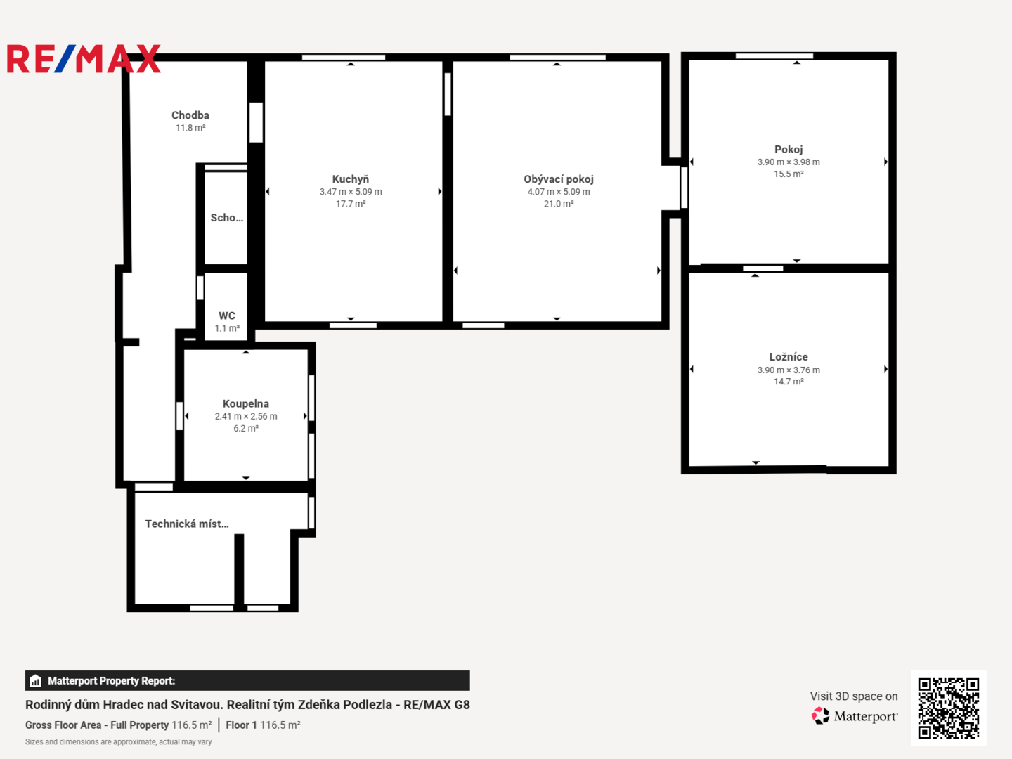 Dispozice: kuchyně s jídelním prostorem, obývací pokoj s výstupem na zastřešený dvorek, ložnice, pokoj, koupelna s vanou a sprchovým koutem, samostatné WC, technická místnost/prádelna, chodba, vstup do sklepa, vstup na půdu.