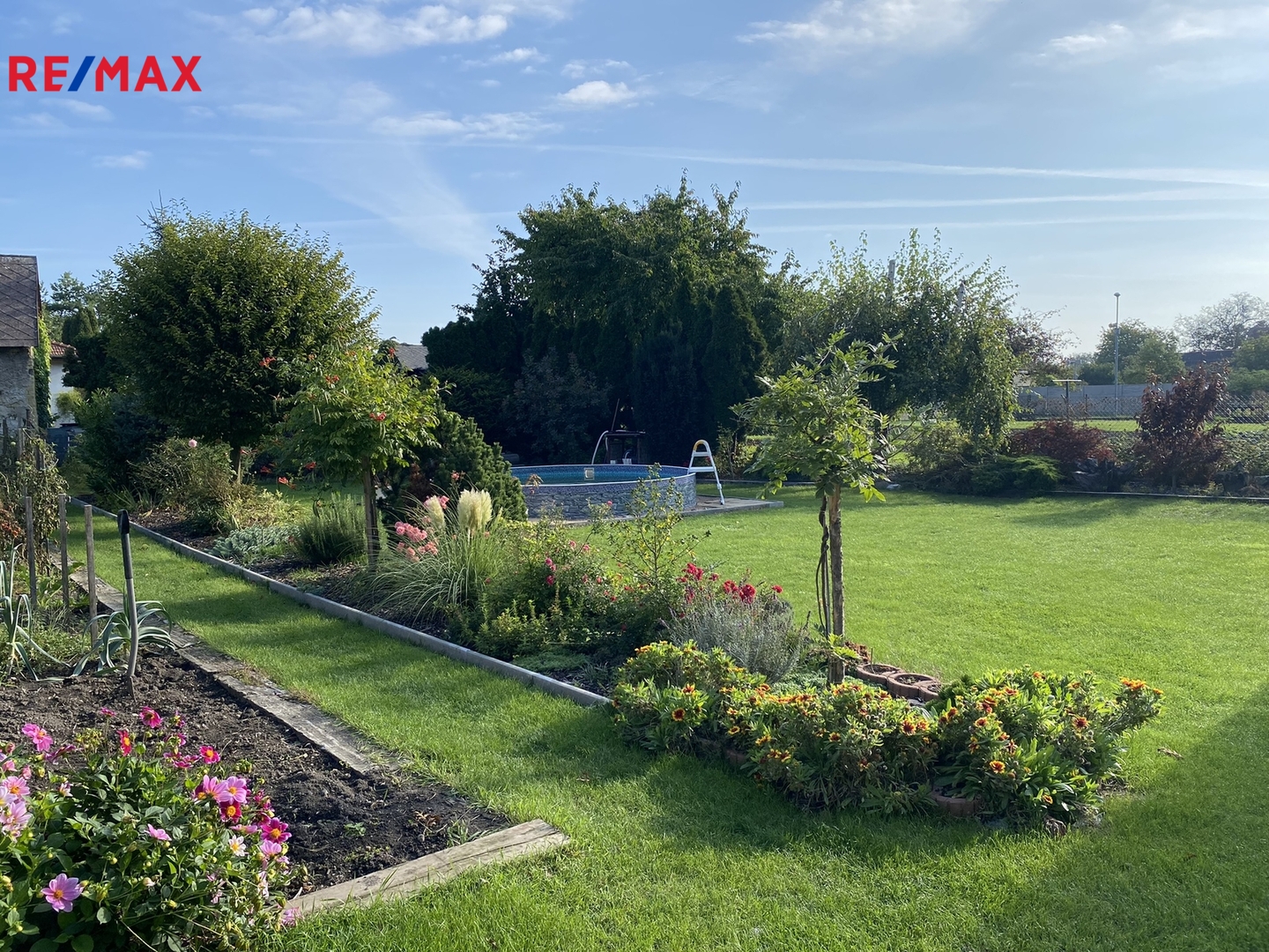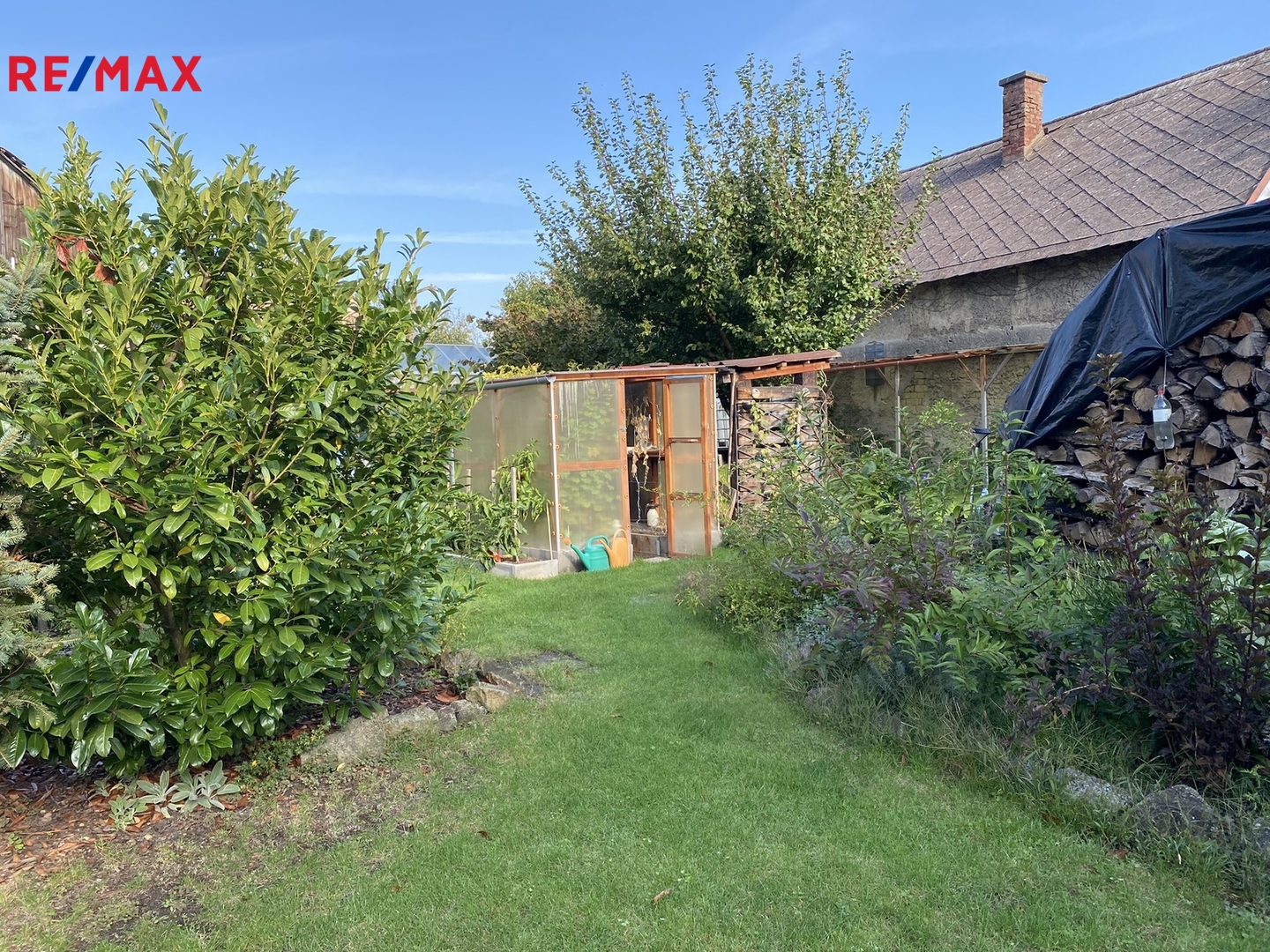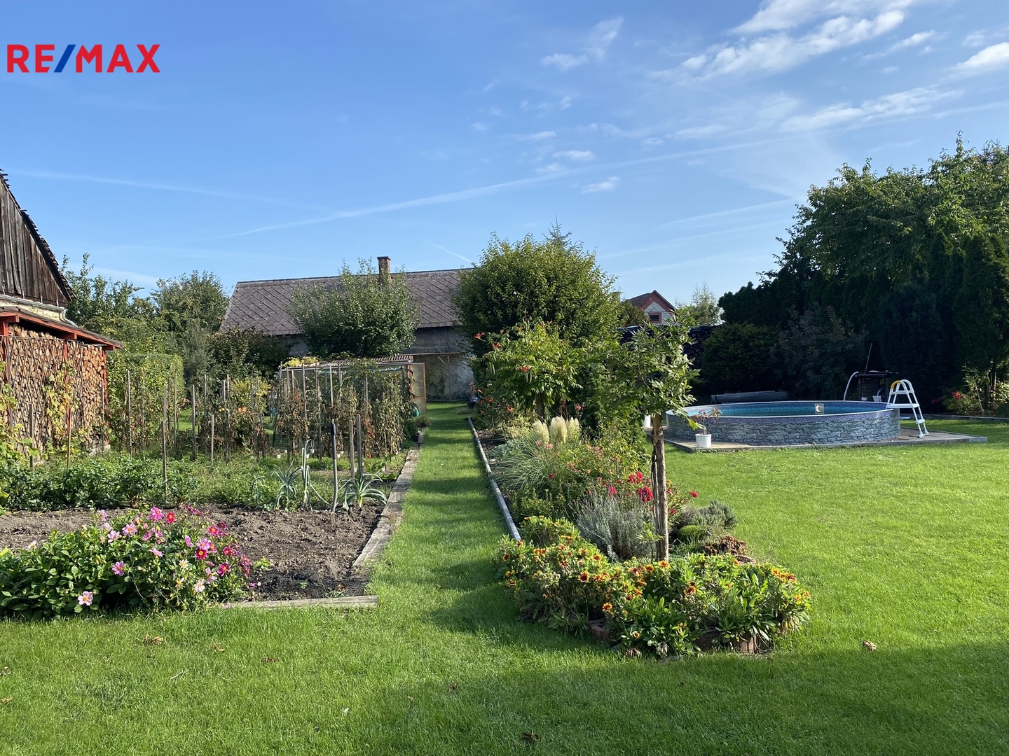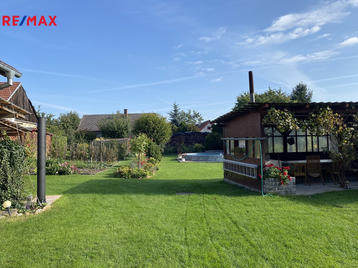 Vraty, navazujícími na pravou část domu se vchází na dvůr zakončený krytým stáním pro dva vozy a pergolou s krbem a posezením s venkovní kuchyní, která je plně vybavená a sezónně velmi využívána. Plynule navazující zahrada je rozdělena na odpočinkovou část s bazénem a část užitkovou ukončenou skleníkem. Celý pozemek, i když je obklopen dalšími parcelami, má druhý samostatný přístup vraty v zadní části, což případně umožnuje rozdělení zahrady na další stavební pozemek.