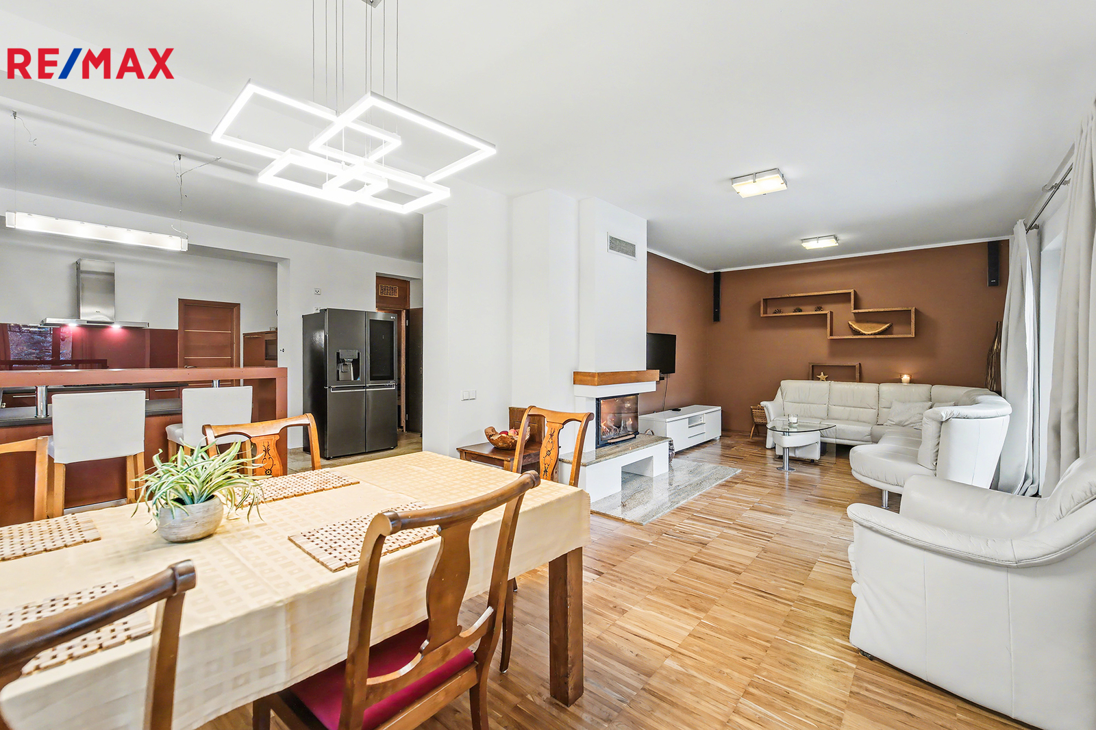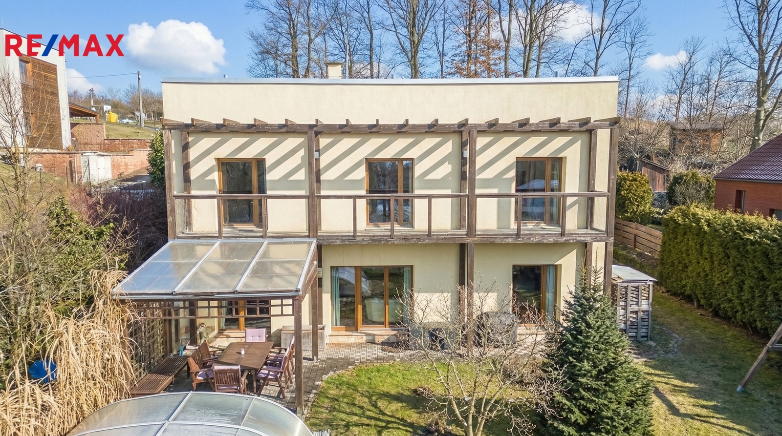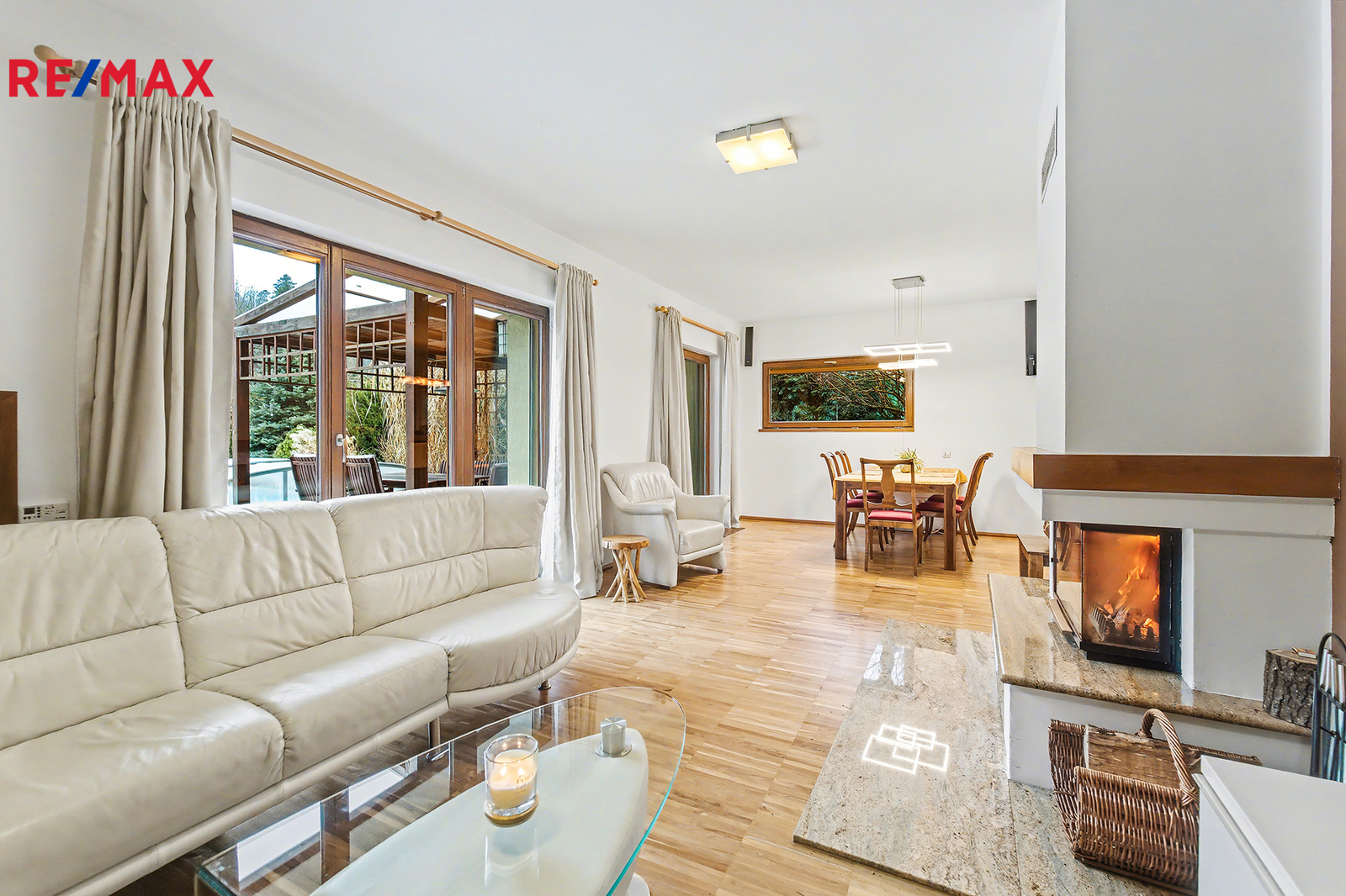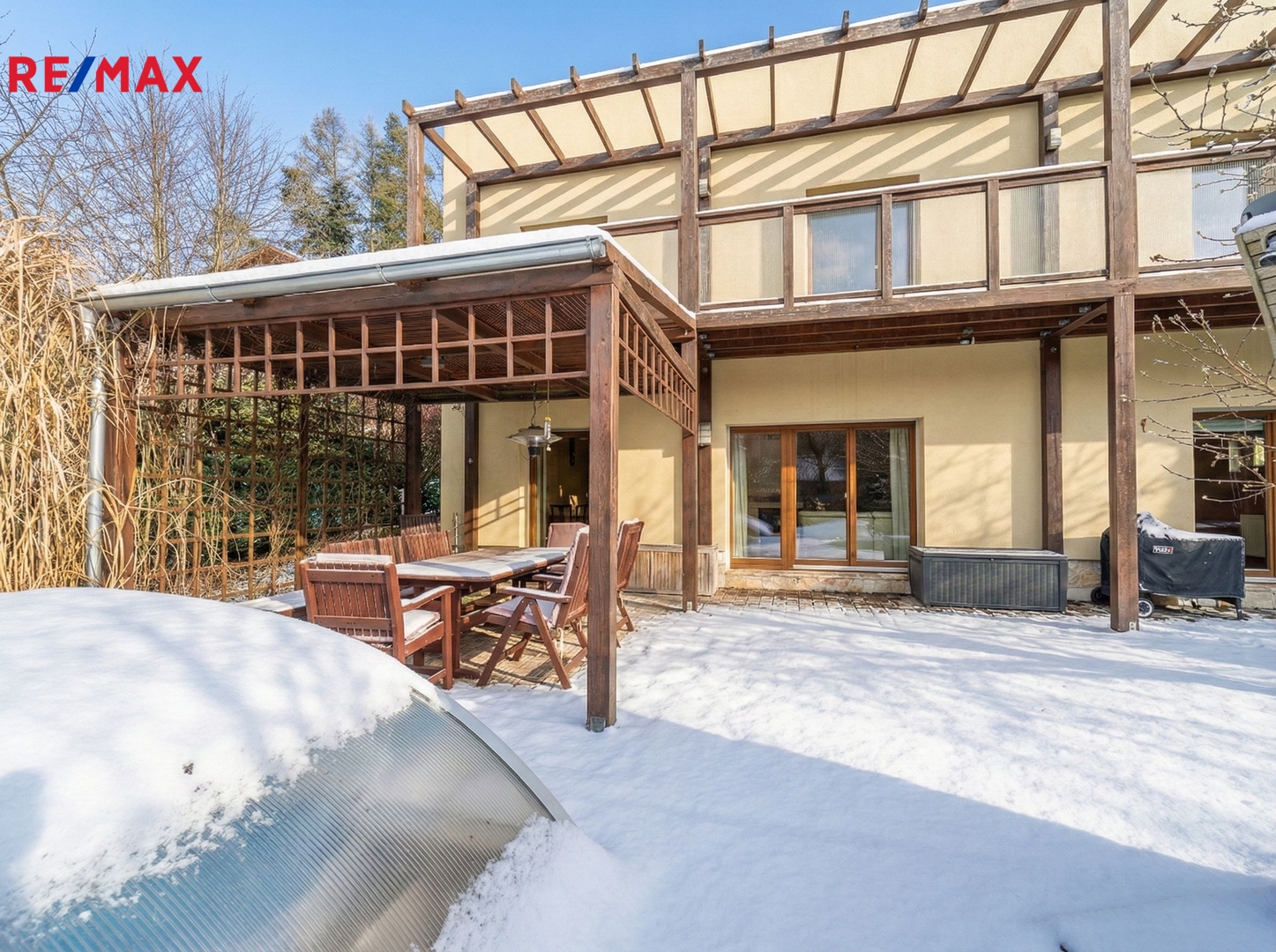 • Společné chvíle u krbu a na terase: Vaše rodina bude trávit společné chvíle u jídelního stolu v obývacím pokoji s krbem. Za hezkého počasí si můžete obytný prostor rozšířit o navazující terasu s posezením pod pergolou.