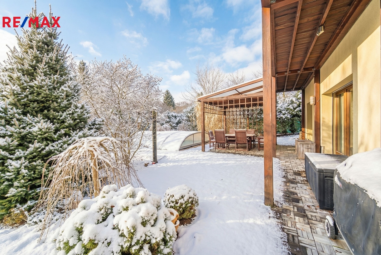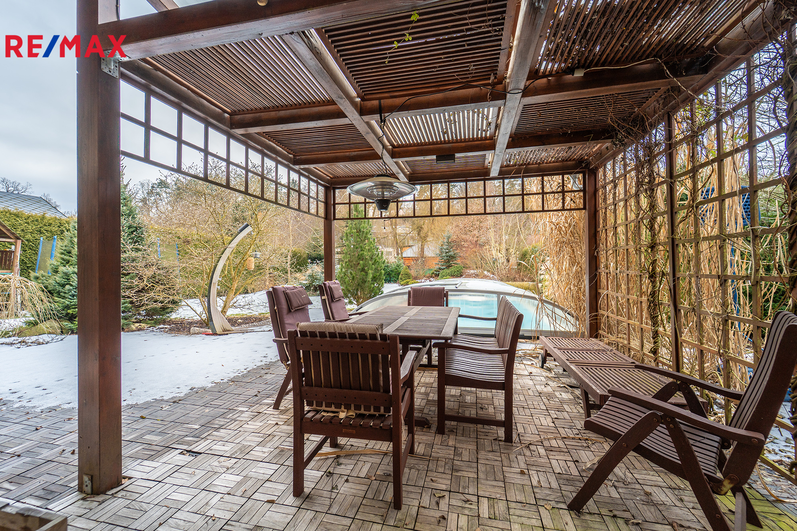 • Koupací sezóna od jara do podzimu: Bazén se slanou vodou a protiproudem je díky zastřešení a tepelnému čerpadlu v provozu od jara do podzimu. Zatímco si děti hrají ve vodě, vy můžete odpočívat vedle bazénu na terase pod pergolou.
