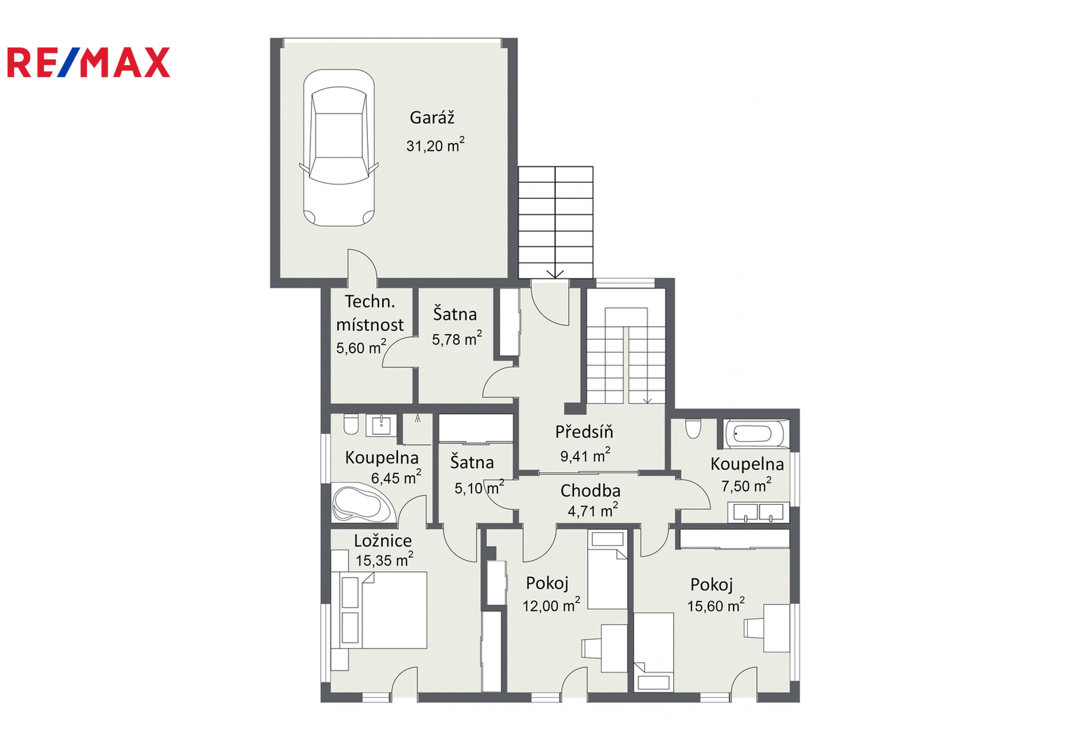• Horní podlaží (vstupní): Tři prostorné ložnice, z nichž každá má vstup na balkon s výhledem do zahrady. Hlavní ložnice disponuje vlastní koupelnou a šatnou. Dětské pokoje mají vlastní koupelnu – rána bez front v koupelně jsou zaručena.