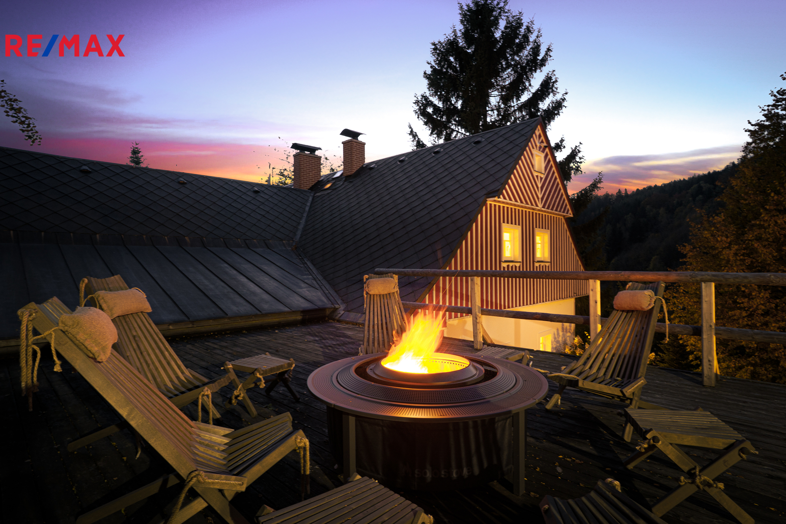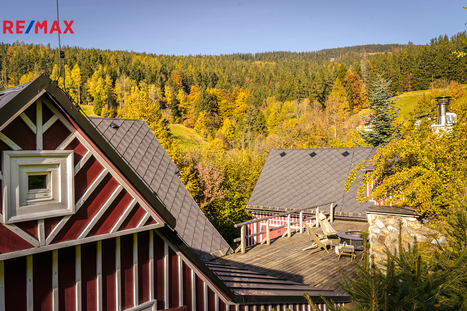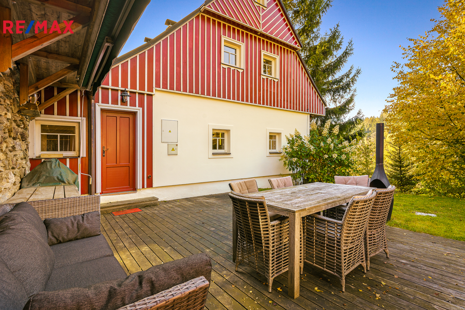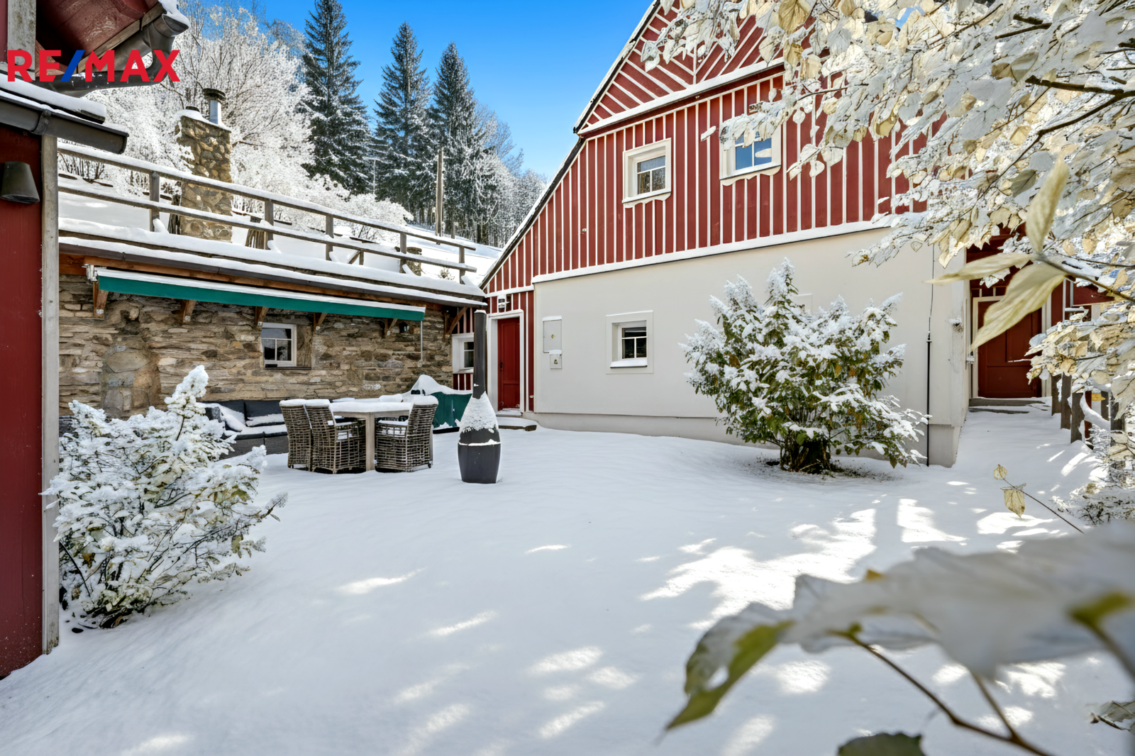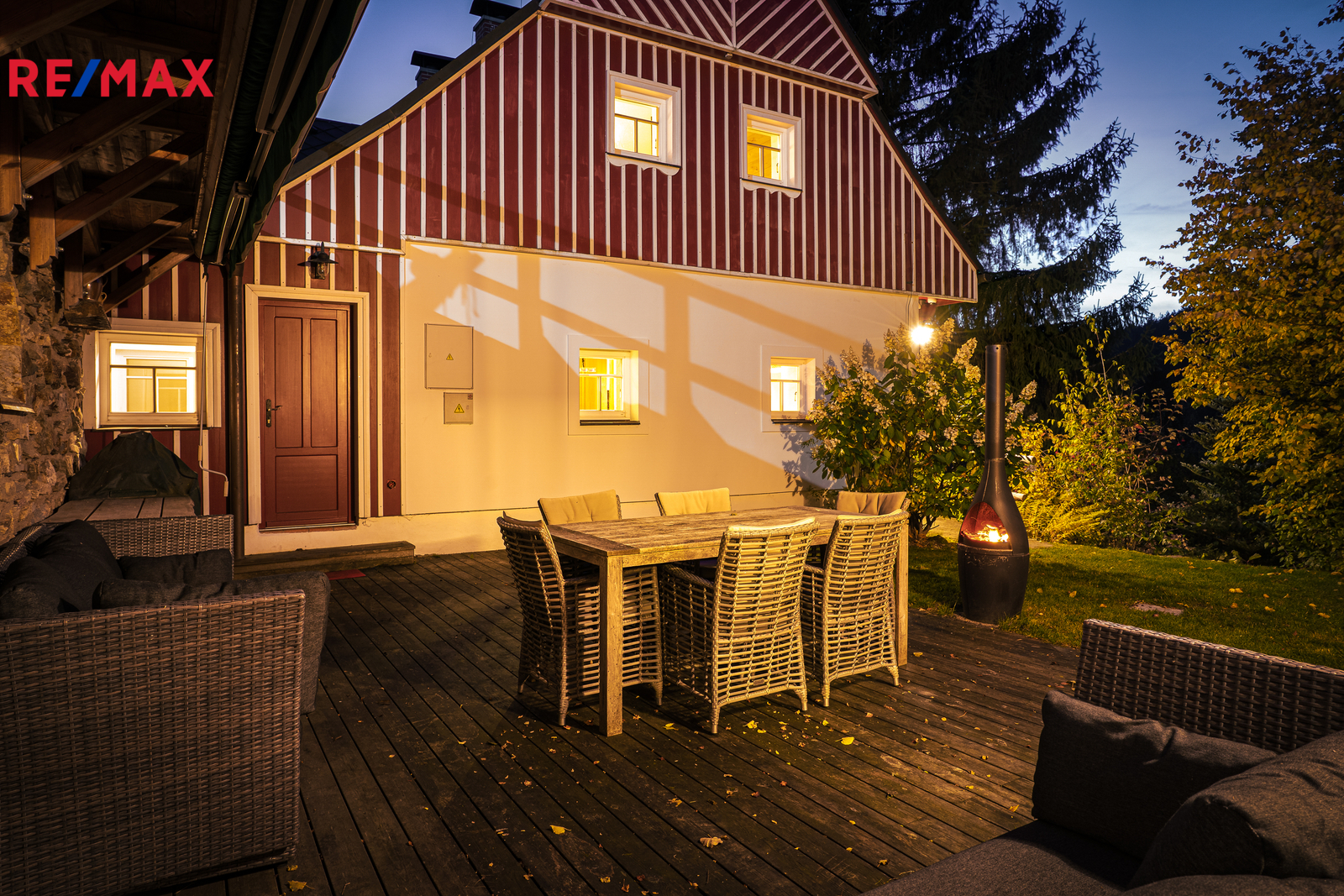U domu se nacházejí tři venkovní terasy, hlavní je s venkovním krbem, v patře je terasa s ohništěm a třetí relaxační terasa s vířivkou HotSpring. Součástí je garáž pro 4 vozy. Chalupu obklopuje pozemek o velikosti 27.504m2, jedná se o jedno z nejzachovalejších krkonošských údolí, kde naleznete pouze původní chalupy a klid. Nemovitost stojí v klidné neprůjezdné části obce Horní Dušnice obklopená lesy a loukami. Nejbližší lyžařské středisko je Horní Rokytnice, kde se nově buduje nový špičkový lyžařský areál, přes kopec se nachází lokalita Vítkovice s nočním lyžováním a možností SkiAlpy přímo od chalupy.