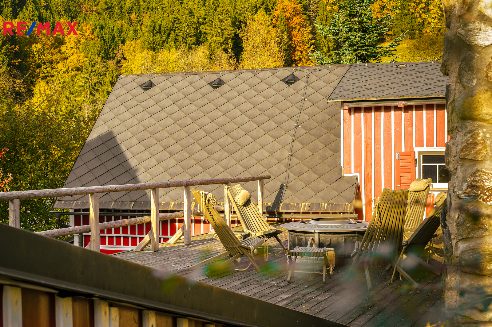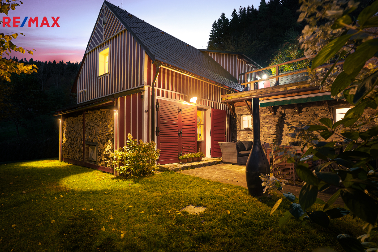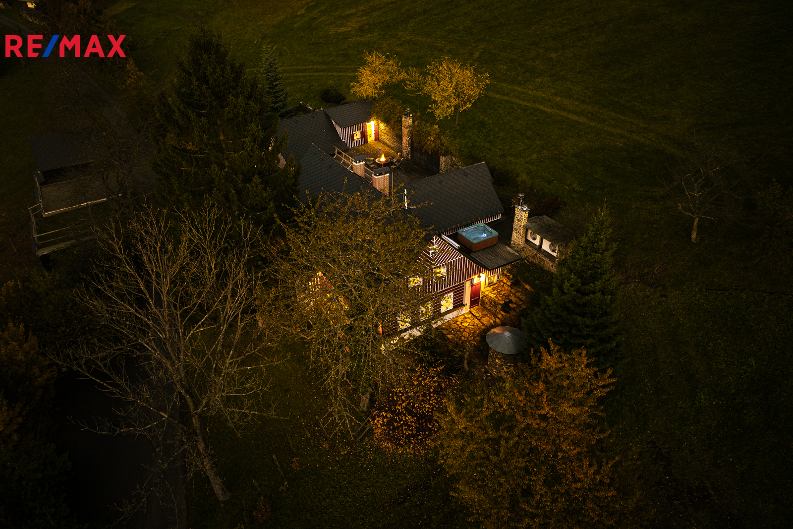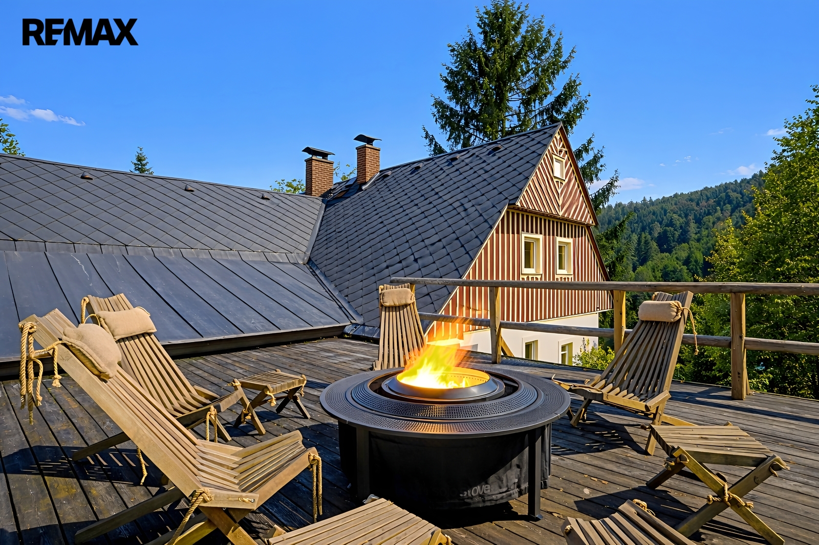 U domu se nacházejí tři venkovní terasy, hlavní je s venkovním krbem, v patře je terasa s ohništěm a třetí relaxační terasa s vířivkou HotSpring. Součástí je garáž pro 4 vozy. Chalupu obklopuje pozemek o velikosti 27.504m2, jedná se o jedno z nejzachovalejších krkonošských údolí, kde naleznete pouze původní chalupy a klid. Nemovitost stojí v klidné neprůjezdné části obce Horní Dušnice obklopená lesy a loukami. Nejbližší lyžařské středisko je Horní Rokytnice, kde se nově buduje nový špičkový lyžařský areál, přes kopec se nachází lokalita Vítkovice s nočním lyžováním a možností SkiAlpy přímo od chalupy.