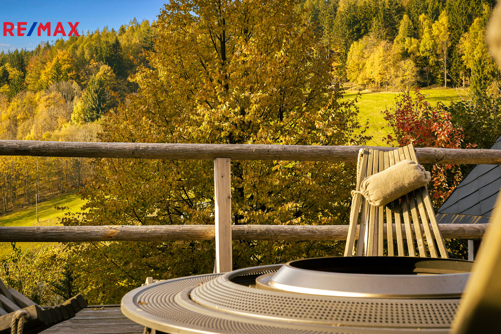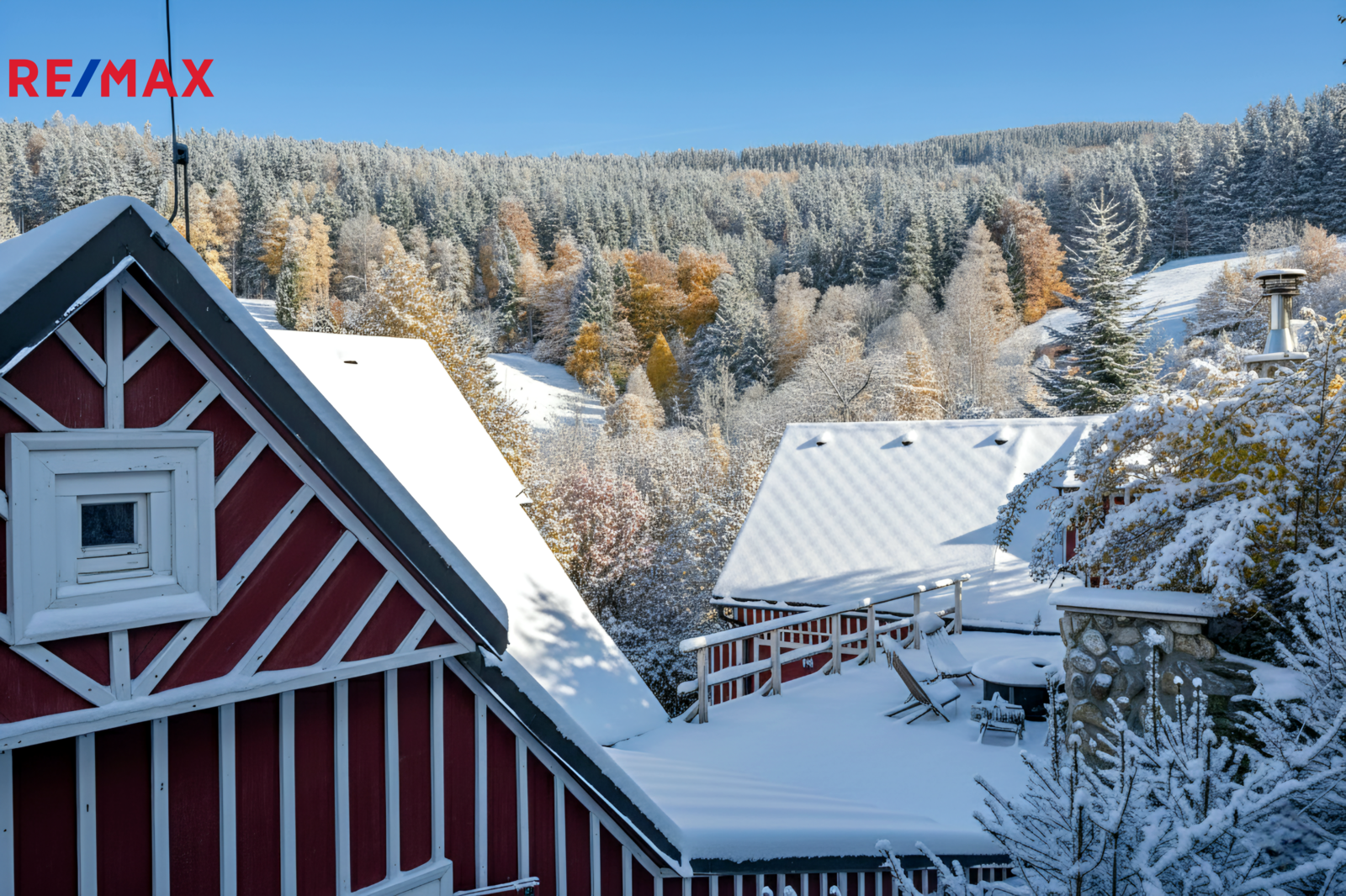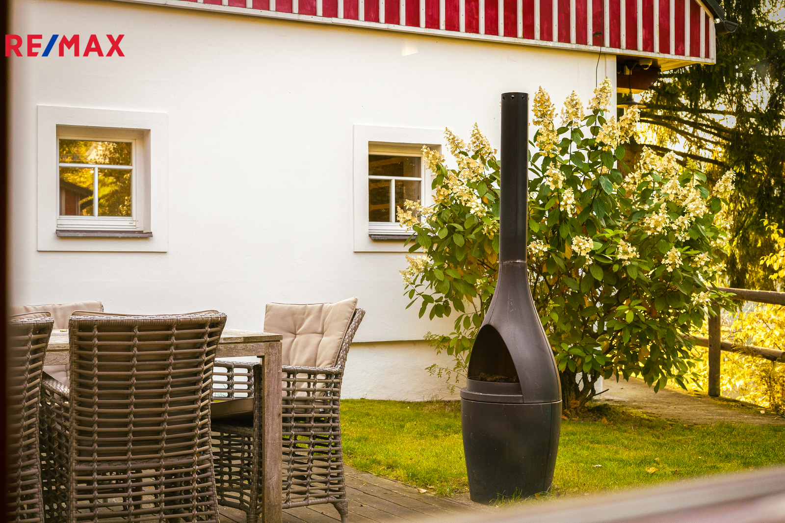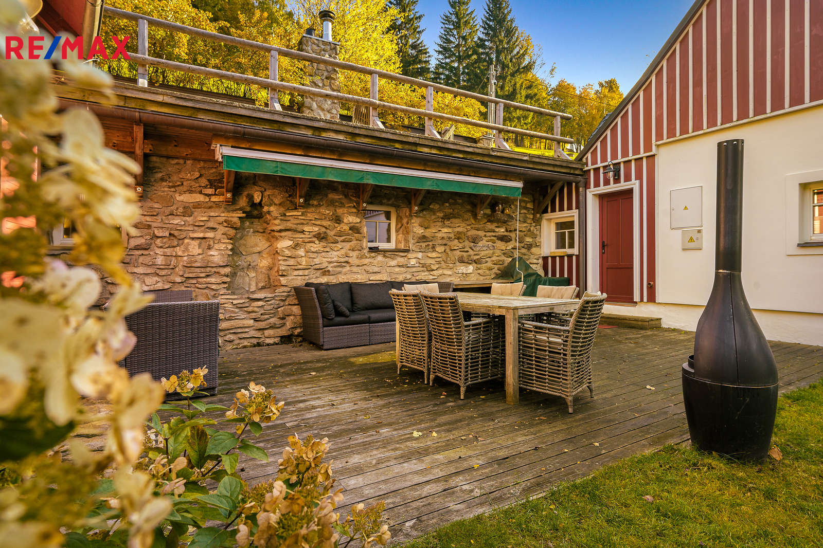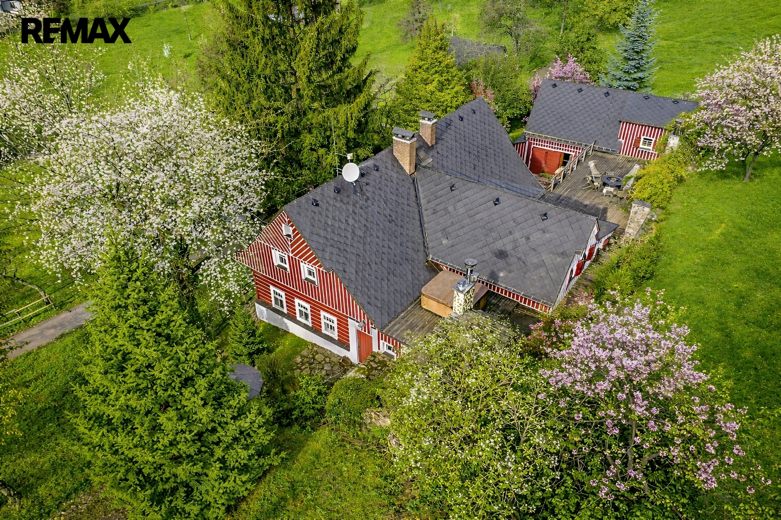 U domu se nacházejí tři venkovní terasy, hlavní je s venkovním krbem, v patře je terasa s ohništěm a třetí relaxační terasa s vířivkou HotSpring. Součástí je garáž pro 4 vozy. Chalupu obklopuje pozemek o velikosti 27.504m2, jedná se o jedno z nejzachovalejších krkonošských údolí, kde naleznete pouze původní chalupy a klid. Nemovitost stojí v klidné neprůjezdné části obce Horní Dušnice obklopená lesy a loukami. Nejbližší lyžařské středisko je Horní Rokytnice, kde se nově buduje nový špičkový lyžařský areál, přes kopec se nachází lokalita Vítkovice s nočním lyžováním a možností SkiAlpy přímo od chalupy.