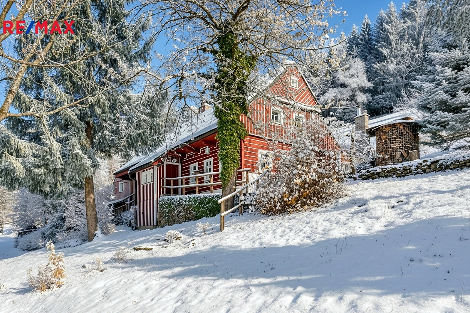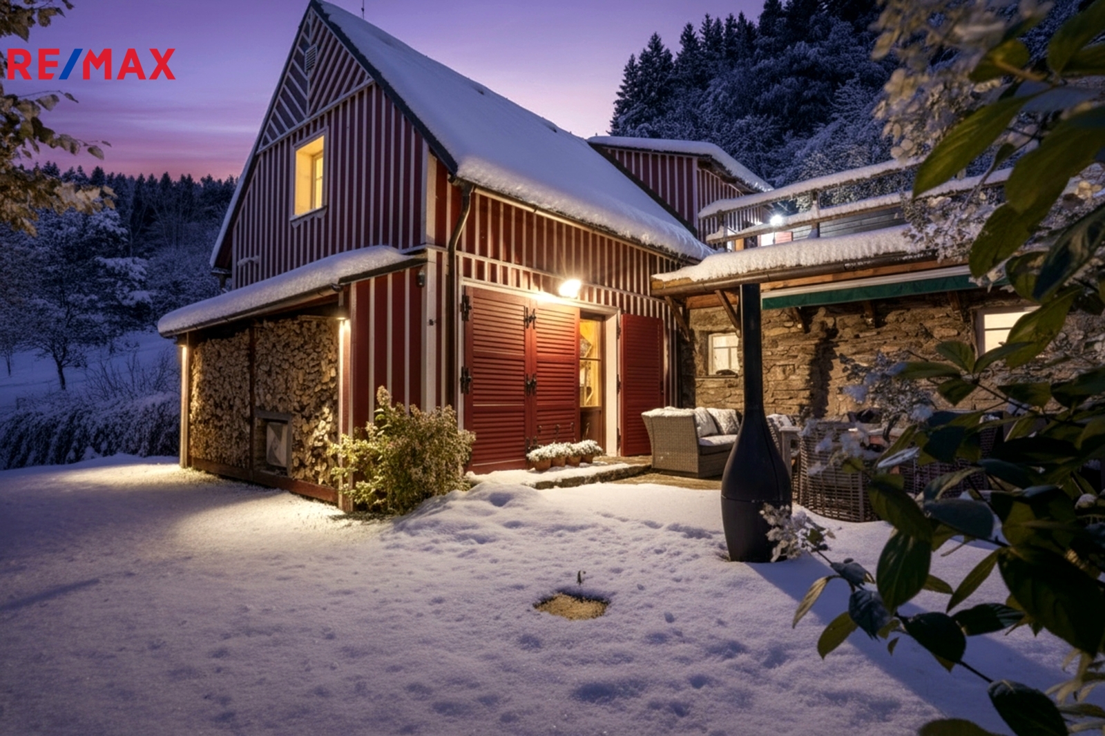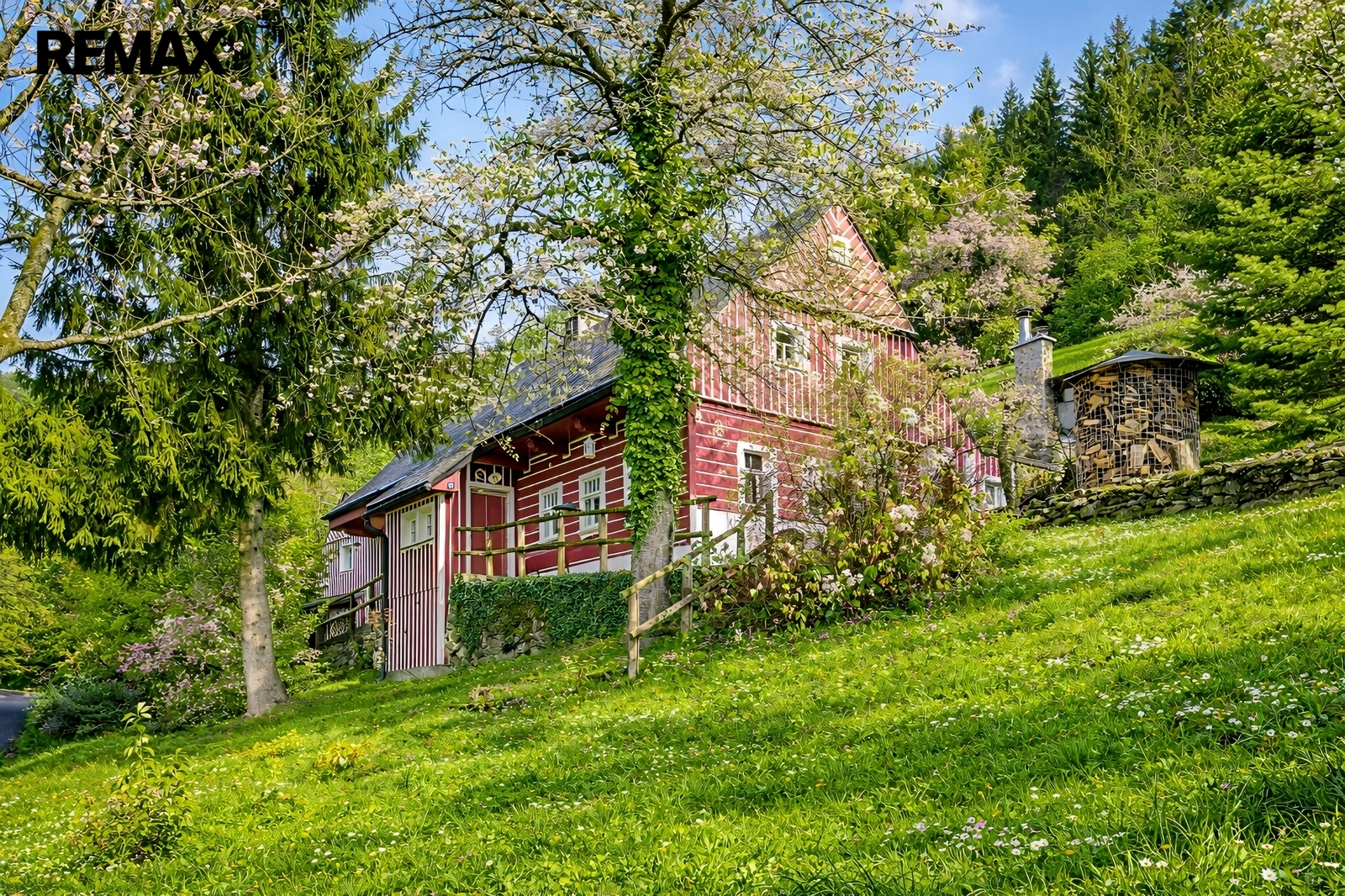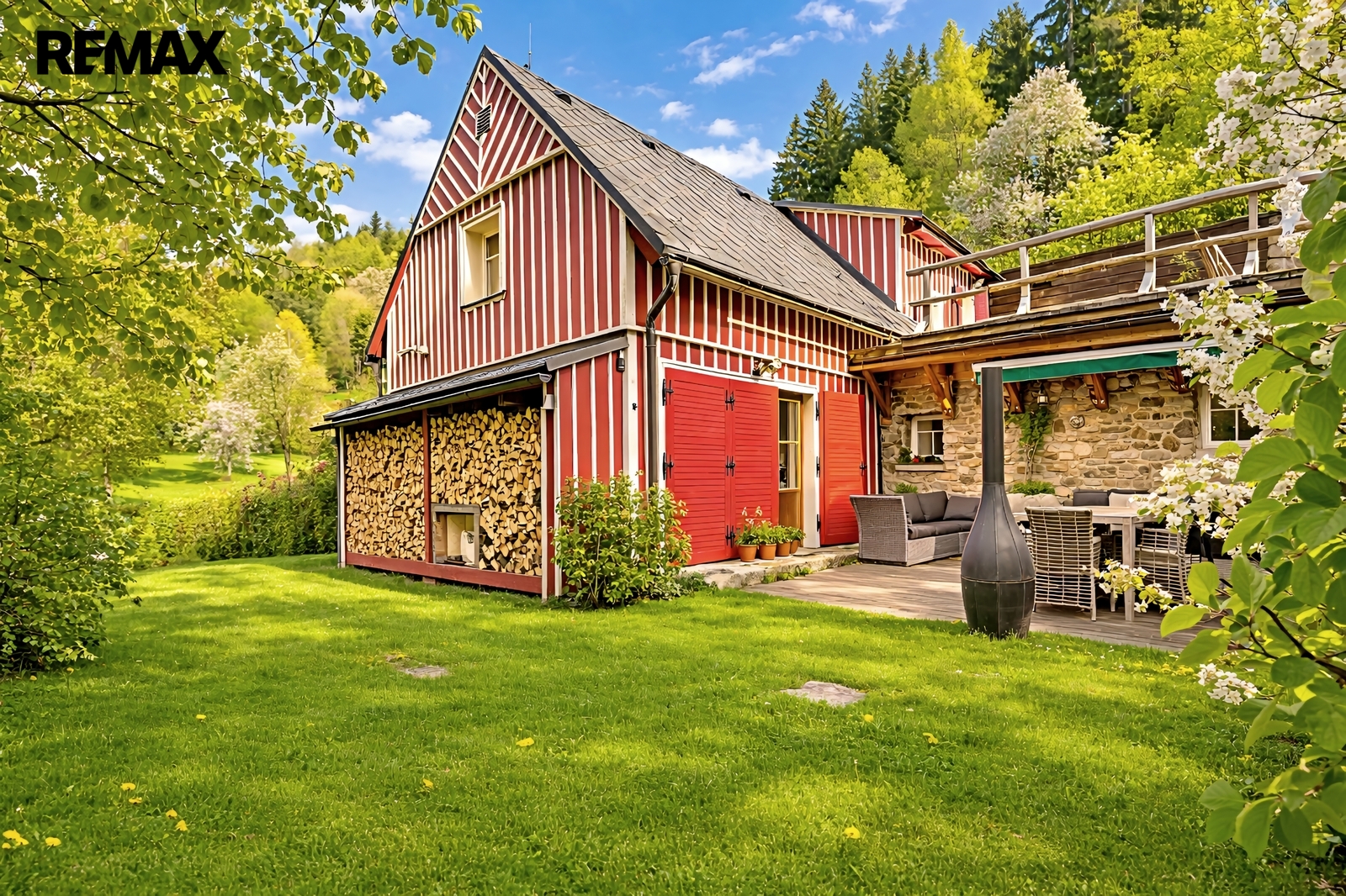 U domu se nacházejí tři venkovní terasy, hlavní je s venkovním krbem, v patře je terasa s ohništěm a třetí relaxační terasa s vířivkou HotSpring. Součástí je garáž pro 4 vozy. Chalupu obklopuje pozemek o velikosti 27.504m2, jedná se o jedno z nejzachovalejších krkonošských údolí, kde naleznete pouze původní chalupy a klid. Nemovitost stojí v klidné neprůjezdné části obce Horní Dušnice obklopená lesy a loukami. Nejbližší lyžařské středisko je Horní Rokytnice, kde se nově buduje nový špičkový lyžařský areál, přes kopec se nachází lokalita Vítkovice s nočním lyžováním a možností SkiAlpy přímo od chalupy.