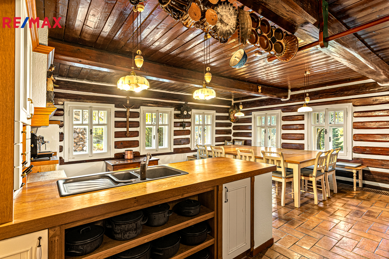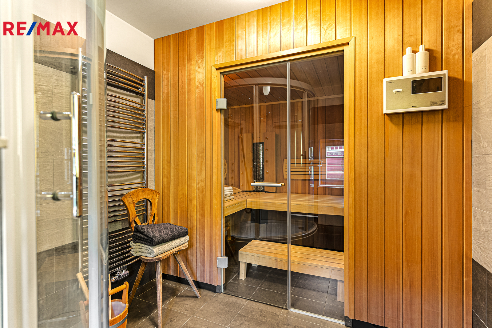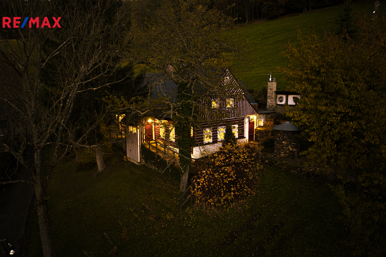 V přízemí se nachází prostorná, do detailu vybavená obytná kuchyně s jídelnou, ideální pro velké rodinné setkání či přátelské posezení. Atmosféru dotváří krásná kachlová kamna a stylová replika místních stojacích hodin s původním strojkem. Součástí přízemí je i odpočinková místnost, využitelná i jako ložnice s vlastní koupelnou vybavenou špičkovou saunou KLAFS (finská sauna, saunarium, infrasauna) a parní sprchou KERAMAG AURA. Samozřejmostí je i samostatné WC. V zadní části domu se nachází moderní kotelna a původní kamenný sklep se stálou teplotou. Dispozici přízemí dále tvoří místnost s výjimečným atraktivním prvkem - přiznanou skalní stěnou, po níž jemně stékají pramínky vody. Další místnost, která je vybavená barem a elektrickým krbem zn. ELEMENT, tvoří společenskou část chalupy a navazuje na ní kinosál vybavený technikou B&W. Z této místnosti je vstup na spodní venkovní terasu. Nad tímto křídlem se nacházejí dvě ložnice s vlastní koupelnou a jedna je se vstupem na druhou vyvýšenou venkovní terasu, která je vybavená stylovým nábytkem EcoFurn, Solo Stove.