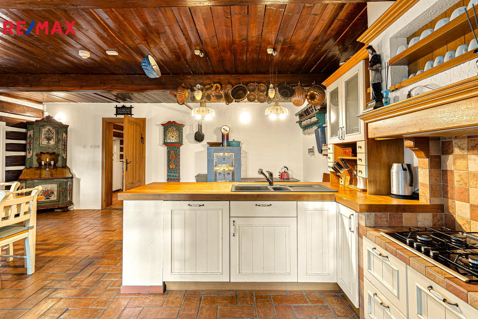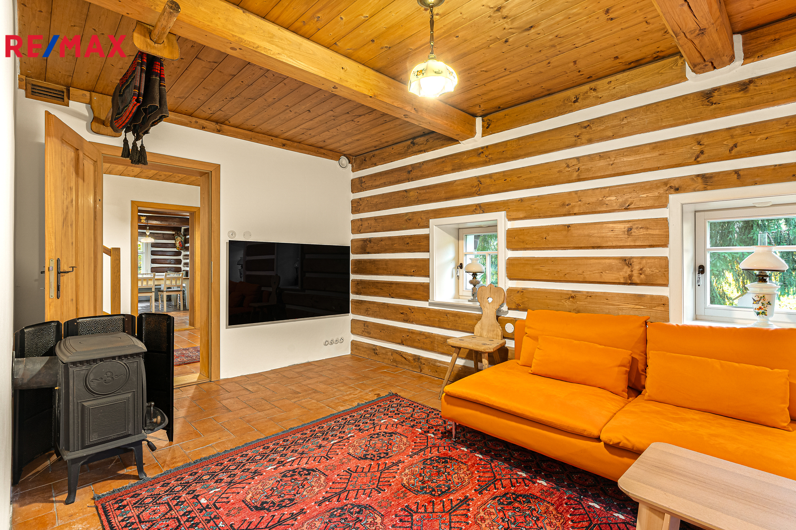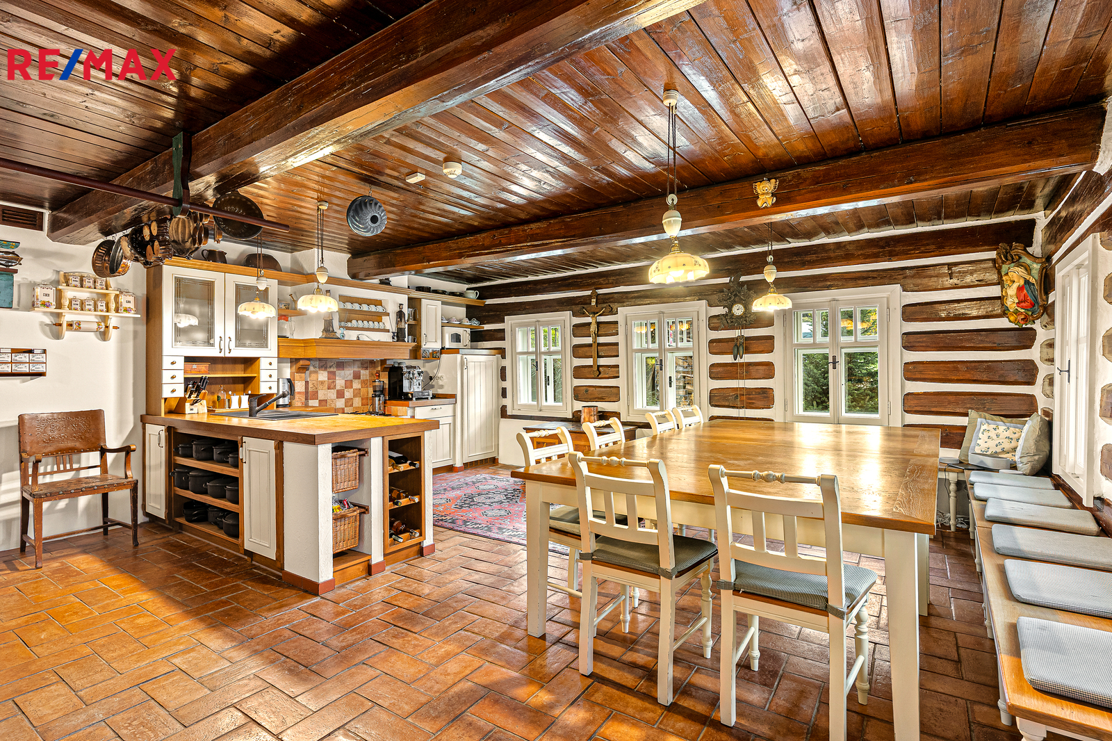 V přízemí se nachází prostorná, do detailu vybavená obytná kuchyně s jídelnou, ideální pro velké rodinné setkání či přátelské posezení. Atmosféru dotváří krásná kachlová kamna a stylová replika místních stojacích hodin s původním strojkem. Součástí přízemí je i odpočinková místnost, využitelná i jako ložnice s vlastní koupelnou vybavenou špičkovou saunou KLAFS (finská sauna, saunarium, infrasauna) a parní sprchou KERAMAG AURA. Samozřejmostí je i samostatné WC. V zadní části domu se nachází moderní kotelna a původní kamenný sklep se stálou teplotou. Dispozici přízemí dále tvoří místnost s výjimečným atraktivním prvkem - přiznanou skalní stěnou, po níž jemně stékají pramínky vody. Další místnost, která je vybavená barem a elektrickým krbem zn. ELEMENT, tvoří společenskou část chalupy a navazuje na ní kinosál vybavený technikou B&W. Z této místnosti je vstup na spodní venkovní terasu. Nad tímto křídlem se nacházejí dvě ložnice s vlastní koupelnou a jedna je se vstupem na druhou vyvýšenou venkovní terasu, která je vybavená stylovým nábytkem EcoFurn, Solo Stove.