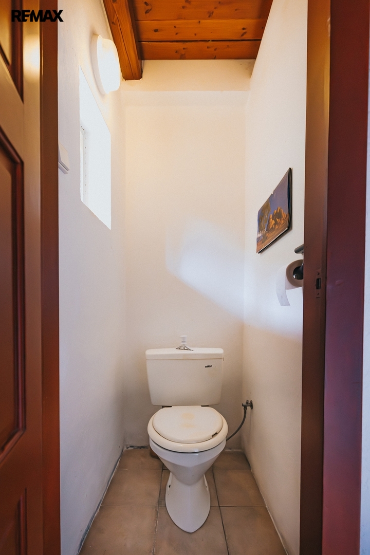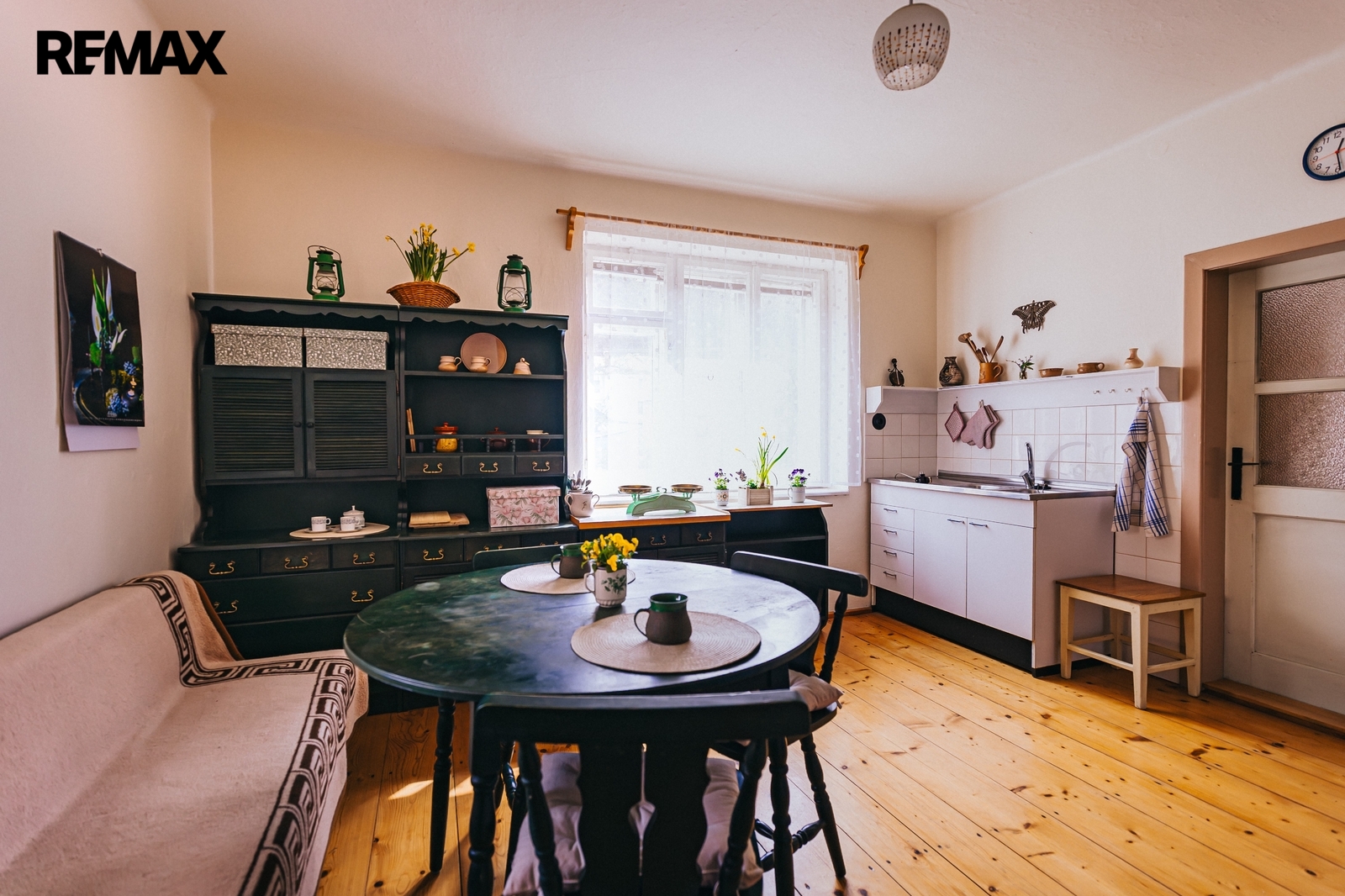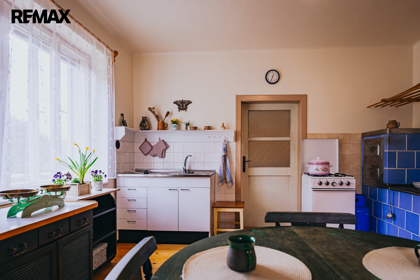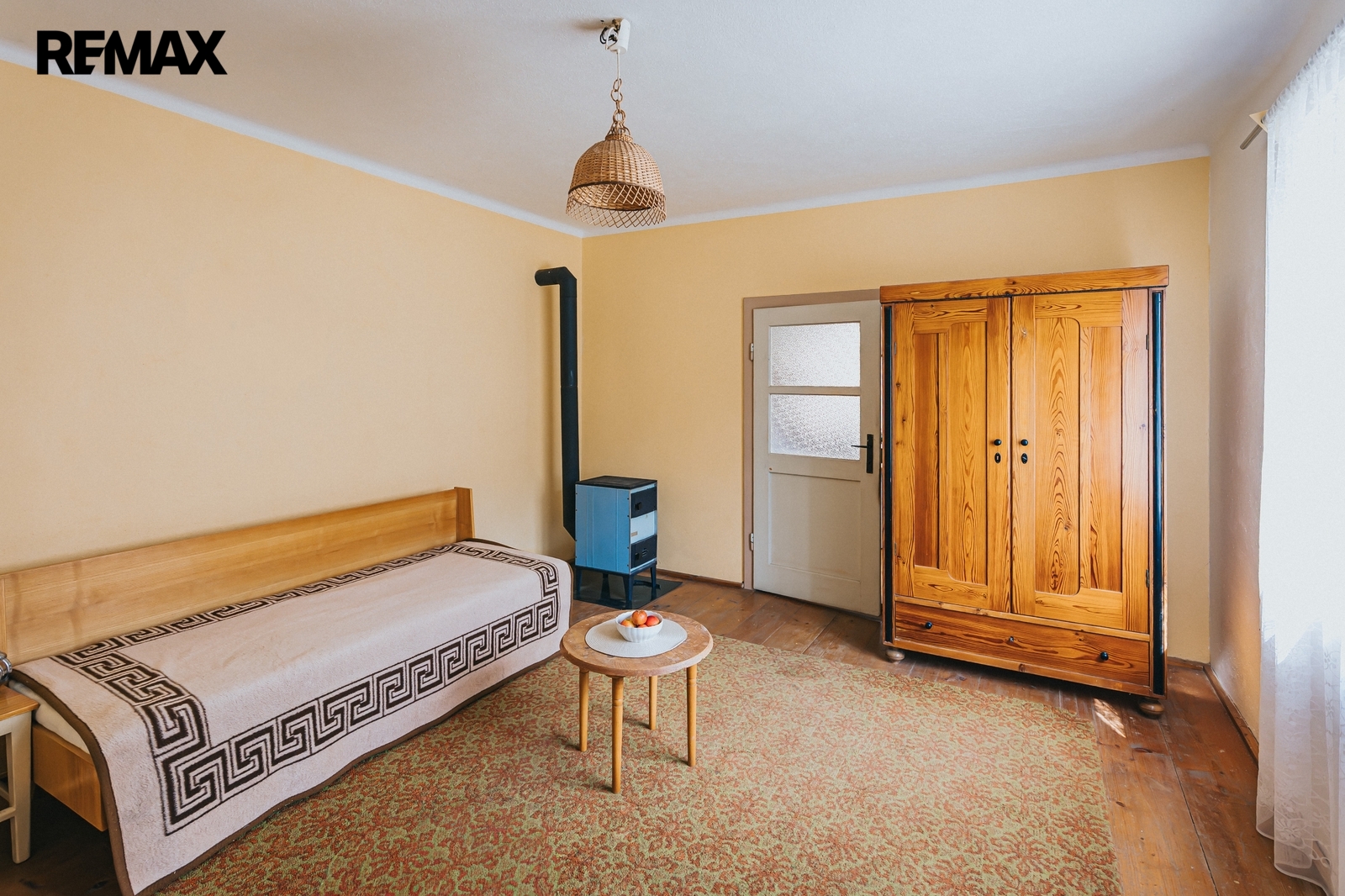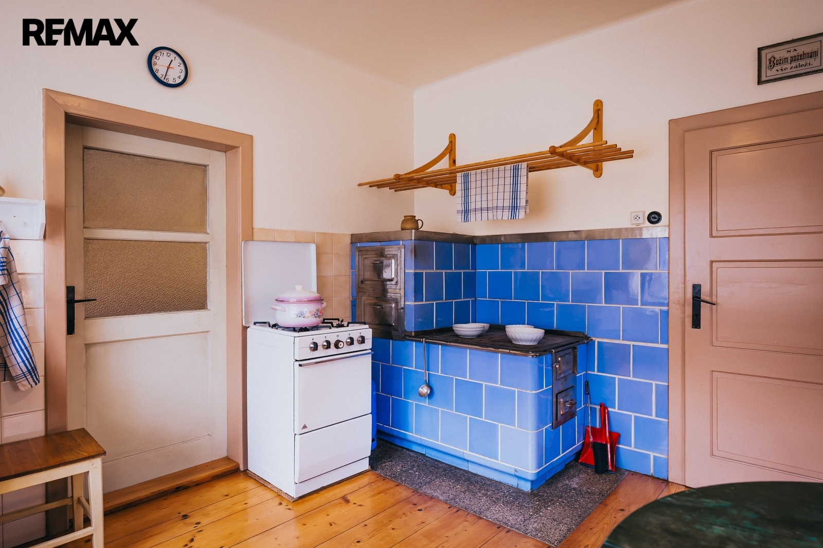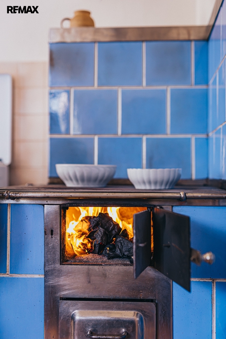 Dům z roku 1959 je pečlivě udržovaný a v roce 2006 byla provedena dostavba verandy. Má atmosféru, kterou novostavby umí málokdy vytvořit. Kuchyň s kachlovými kamny, původní kredencí a prkennou podlahou doplňuje obývák, kde dřevo v kamnech praská jako starý příběh. V každé obytné místnosti i v koupelně jsou kamna — teplo tu není funkce, ale rituál, který vás spojí s rytmem domova a přírody.