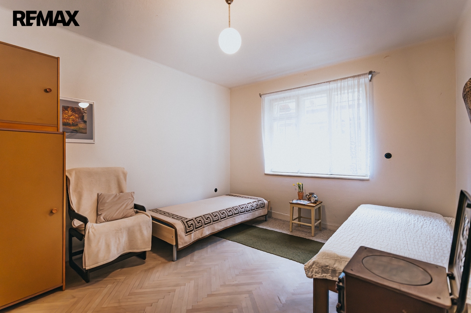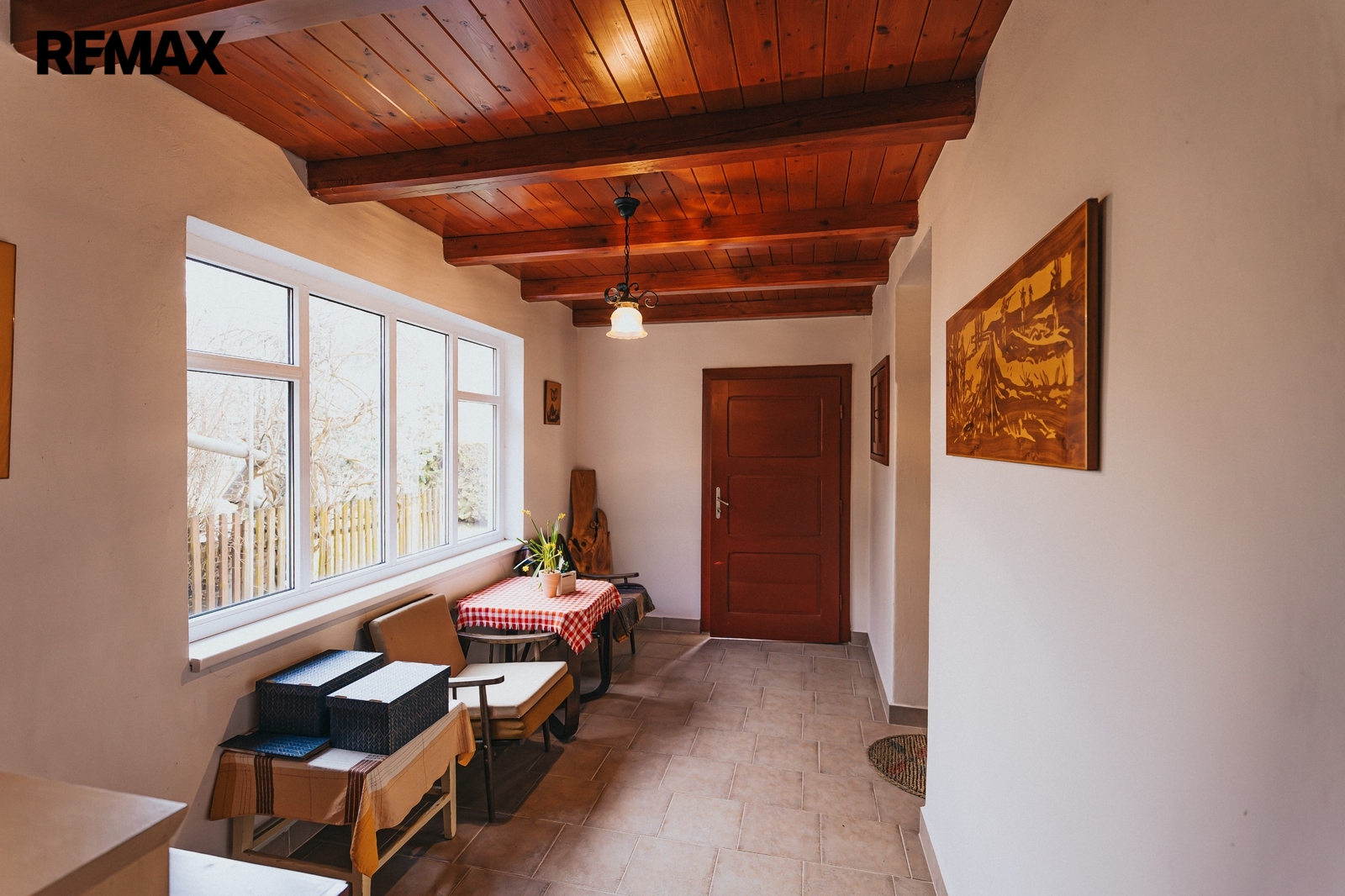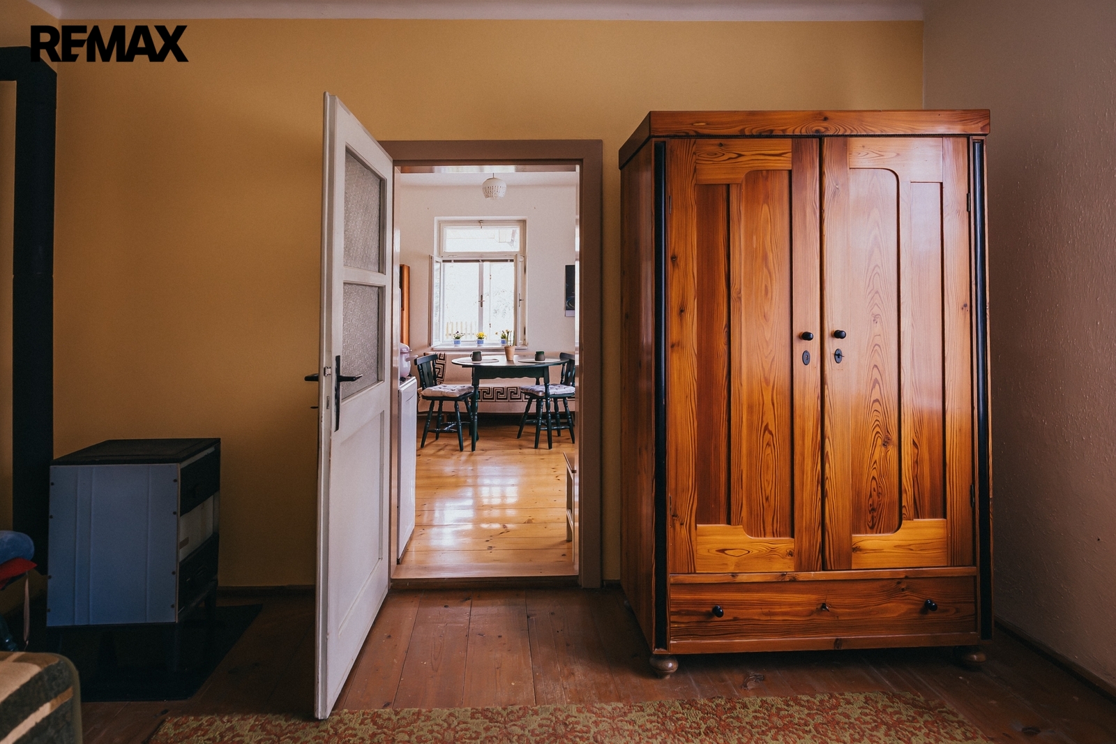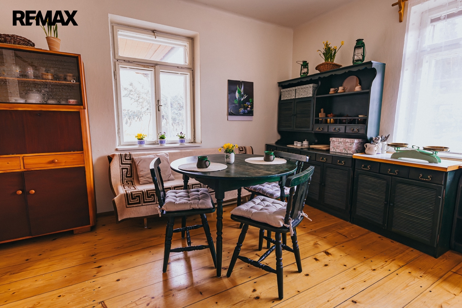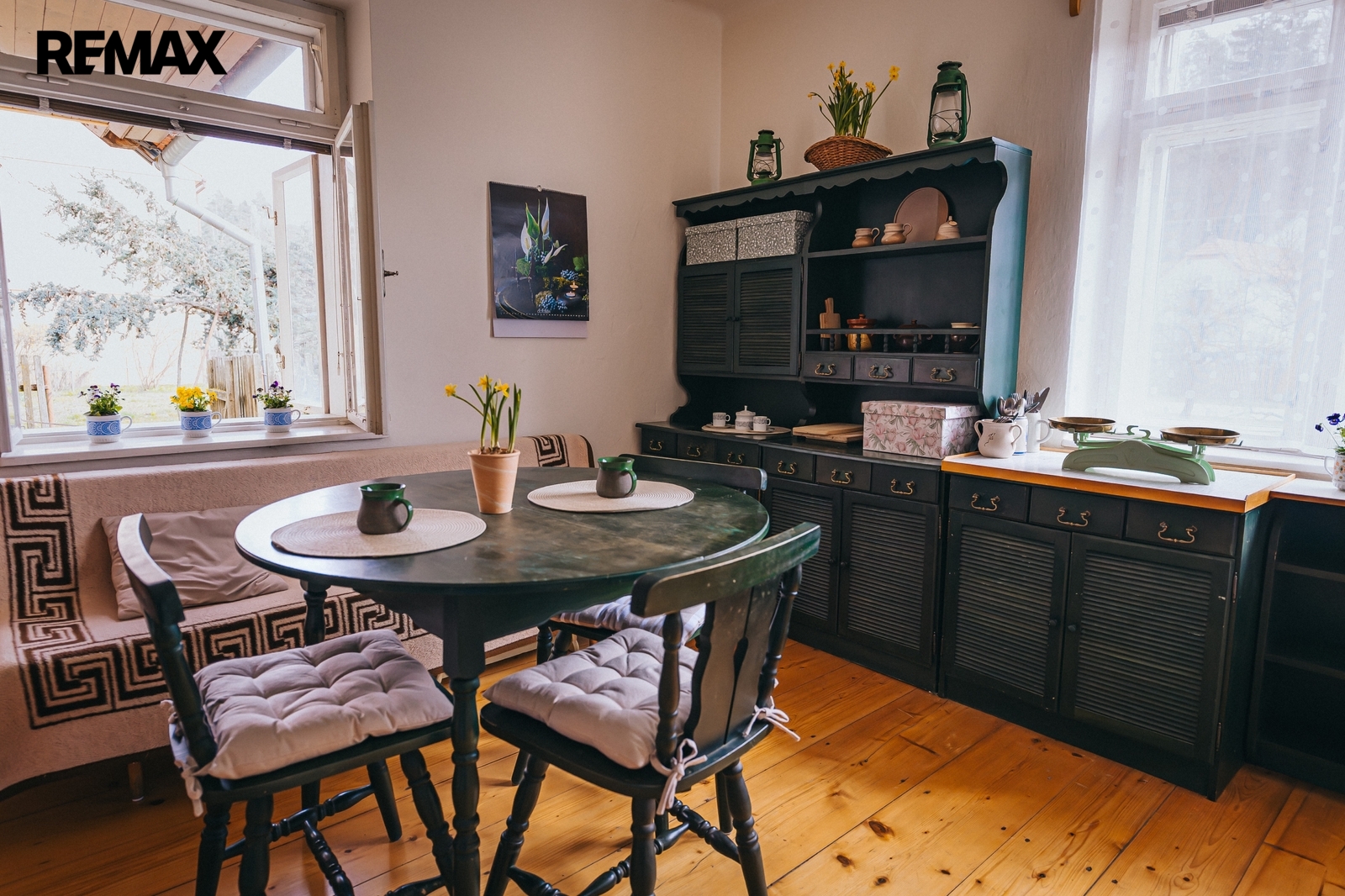 Dům z roku 1959 je pečlivě udržovaný a v roce 2006 byla provedena dostavba verandy. Má atmosféru, kterou novostavby umí málokdy vytvořit. Kuchyň s kachlovými kamny, původní kredencí a prkennou podlahou doplňuje obývák, kde dřevo v kamnech praská jako starý příběh. V každé obytné místnosti i v koupelně jsou kamna — teplo tu není funkce, ale rituál, který vás spojí s rytmem domova a přírody.