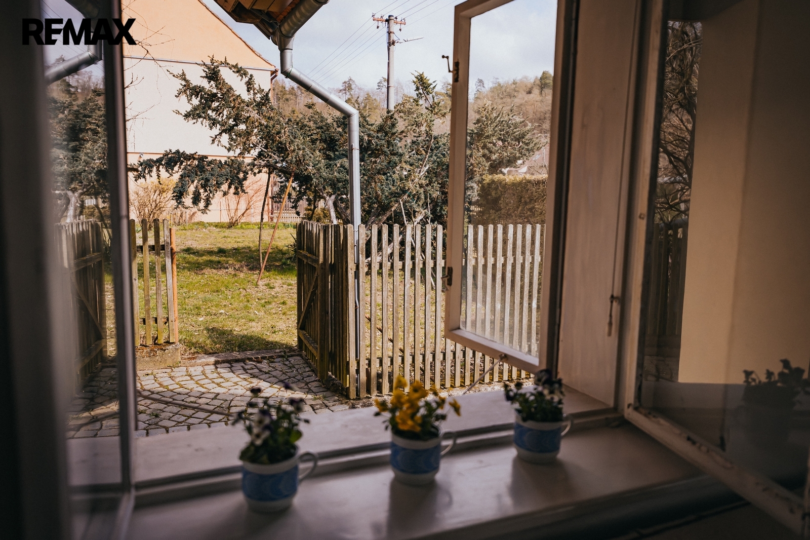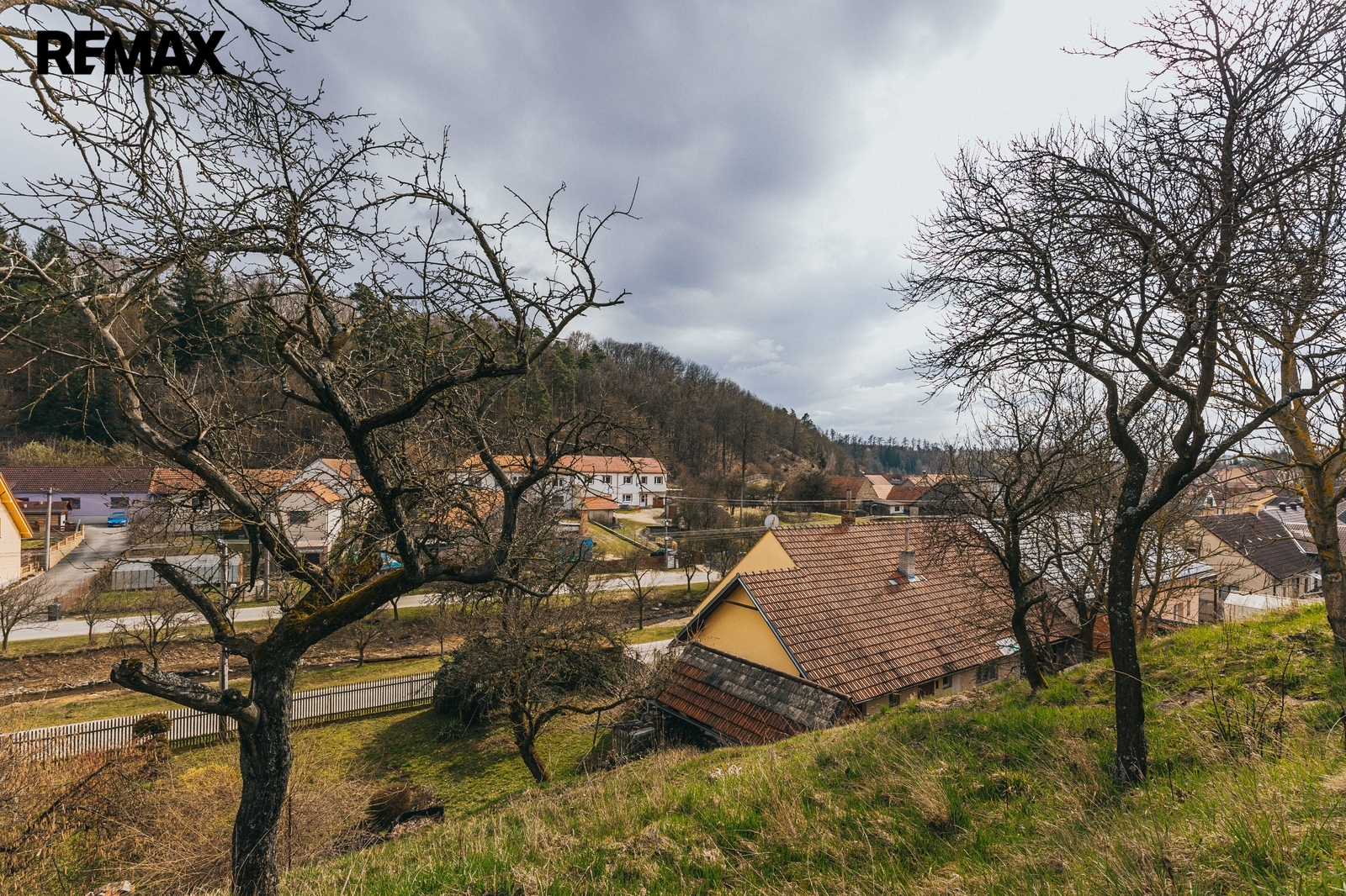 Za zády cítíte oporu kopce — přesně tu feng-šuej kombinaci, kdy má dům „horu v zádech a vodu před sebou“.