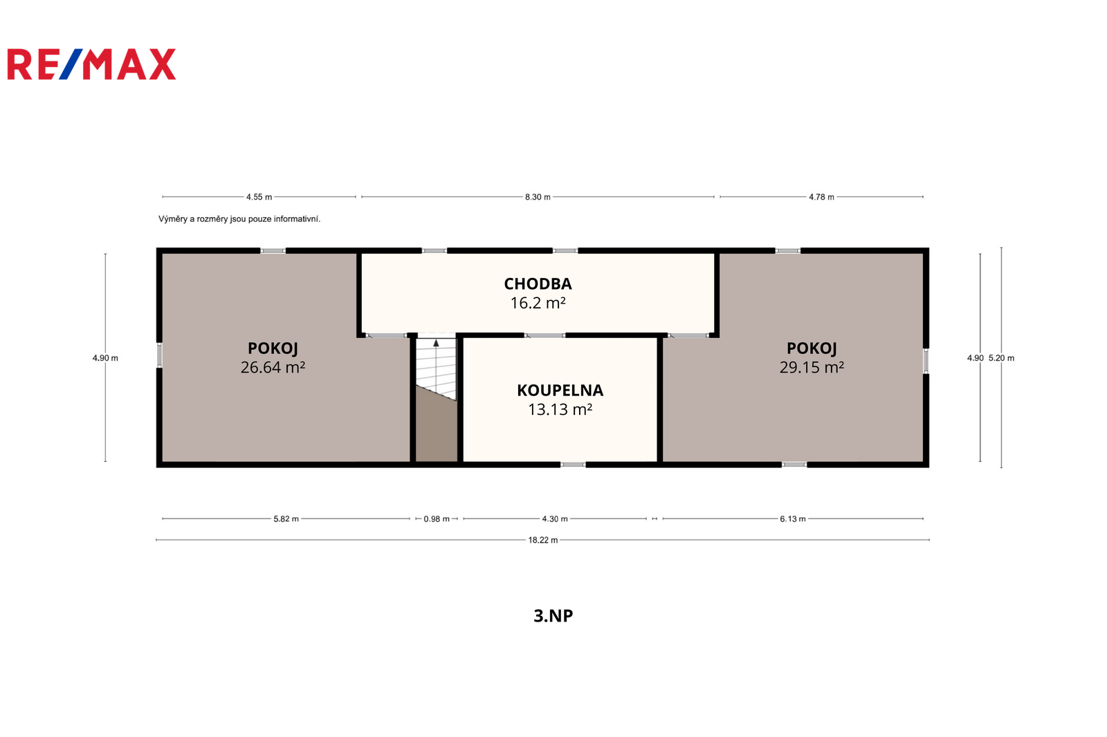 Ve 3. NP (85,1 m²) navazuje chodba (16,2 m²), dva pokoje (29,2 m² a 26,6 m²) a koupelna (13,1 m²).