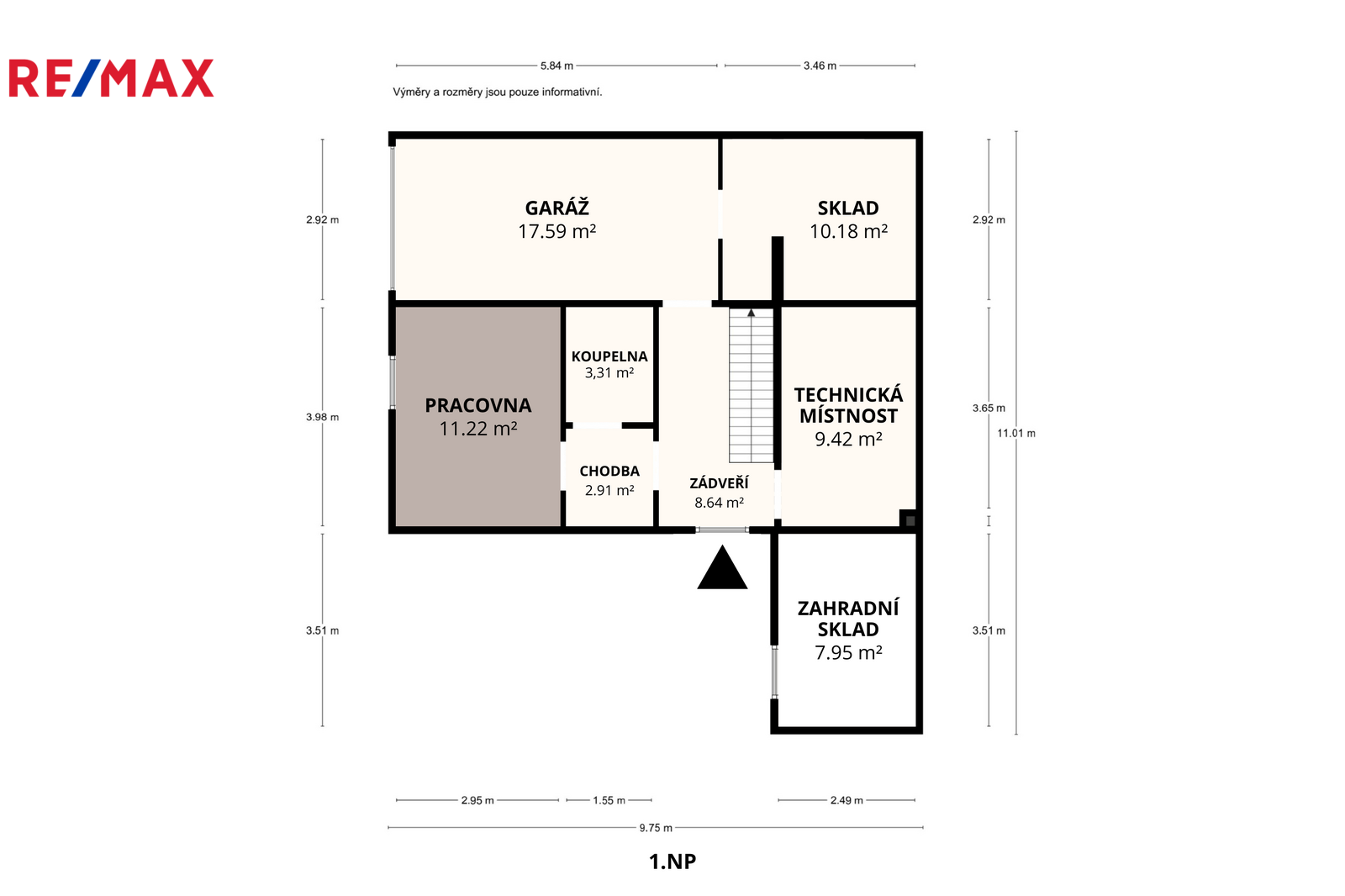 V 1. NP (71,2 m²) se nachází zahradní sklad (8 m²), zádveří (8,6 m²), technická místnost (9,4 m²), chodba (2,9 m²), pracovna (11,2 m²), koupelna (3,3 m²), garáž (17,6 m²) a sklad (10,2 m²).