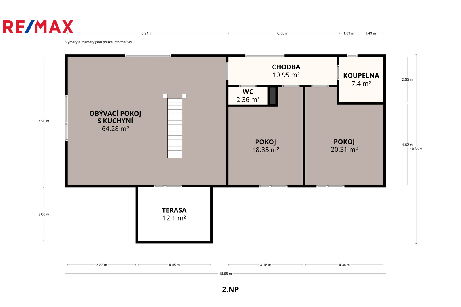 Ve 2. NP (124,2 m²) je umístěn obývací pokoj s kuchyní (64,3 m²), chodba (11 m²), dva pokoje (18,9 m² a 20,3 m²), koupelna (7,4 m²) a samostatné WC (2,4 m²).