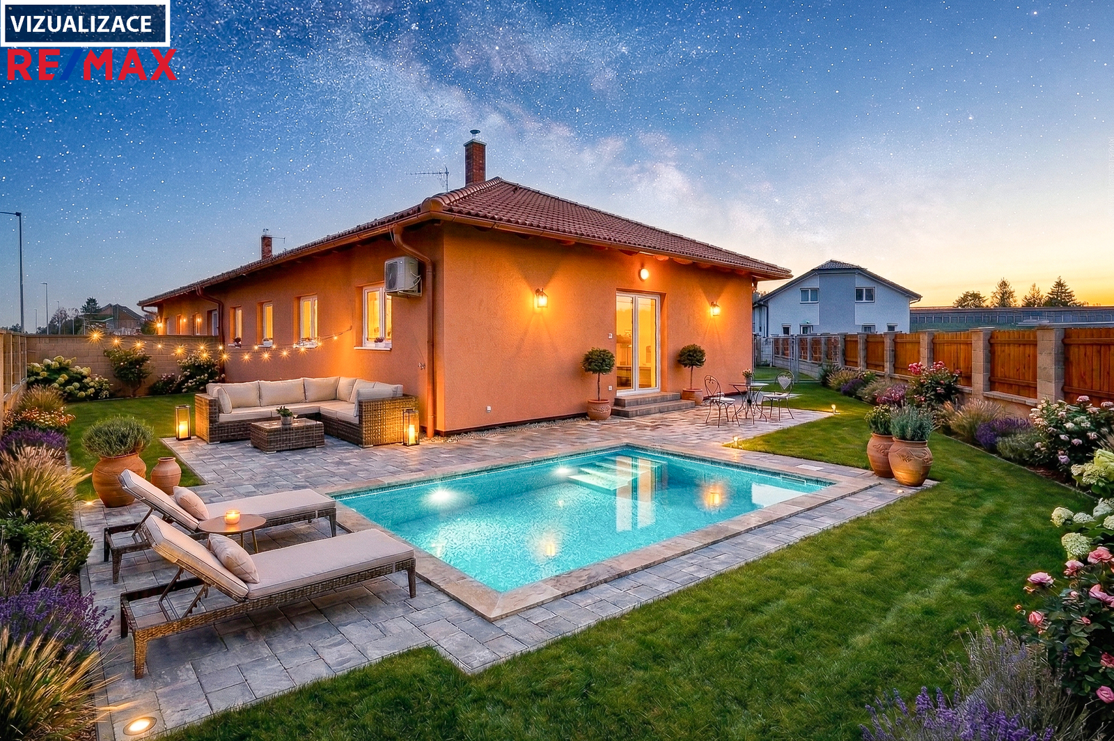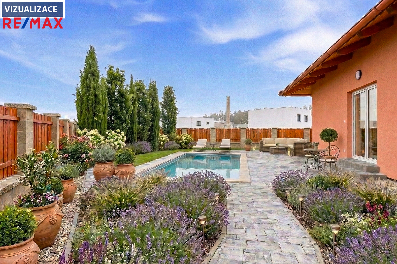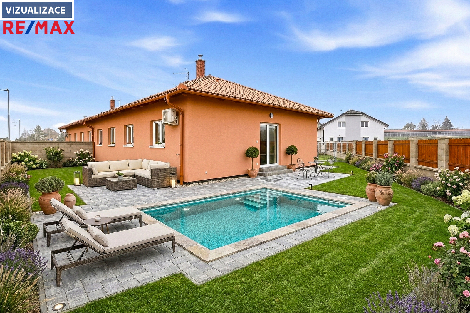 V inzerci je použita vizualizace některých pokojů a zahrady pro lepší představu o potenciálu rodinného domu.