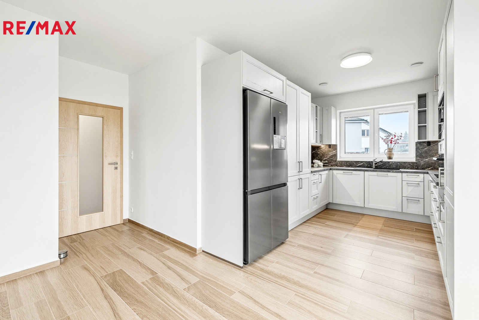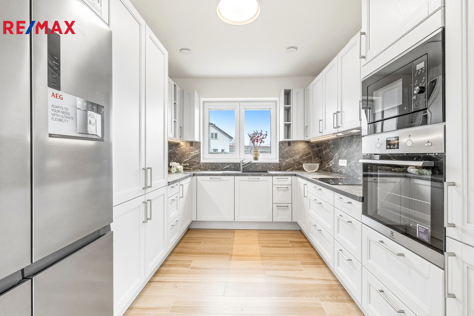 Nadstandardní vybavení v ceně: Moderní kuchyňská linka s kvalitními spotřebiči, vestavěné skříně, bezpečnostní systém Jablotron, trezor ve zdi, LED osvětlení