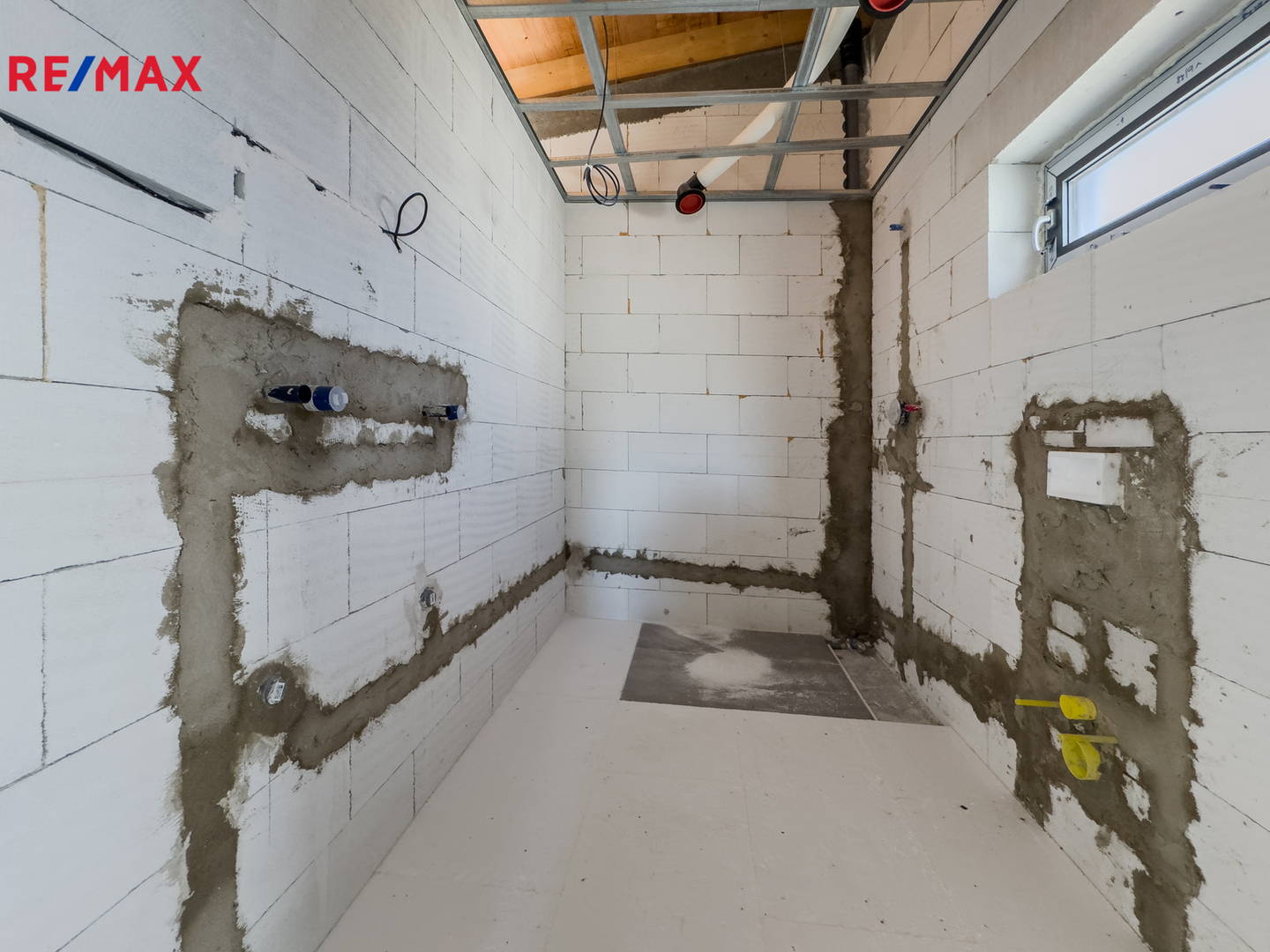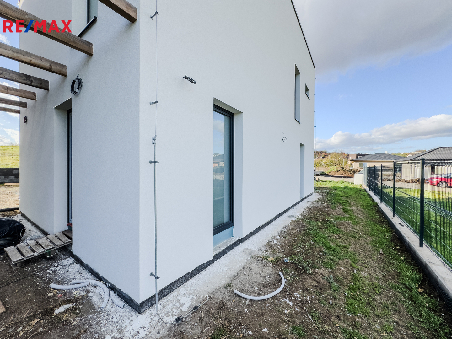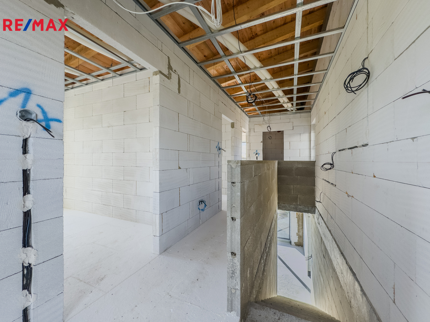 Stavba je realizována z kvalitních tvárnic Ytong a osazena okny s trojskly. O tepelný komfort se stará tepelné čerpadlo vzduch–voda s teplovodním podlahovým vytápěním, které společně s centrální rekuperační jednotkou zajišťuje příjemné klima a nízké provozní náklady po celý rok. Interiér bude dokončen ve vysokém standardu – sádrové omítky, lepené vinylové a keramické podlahy a podhledy s integrovaným LED osvětlením.