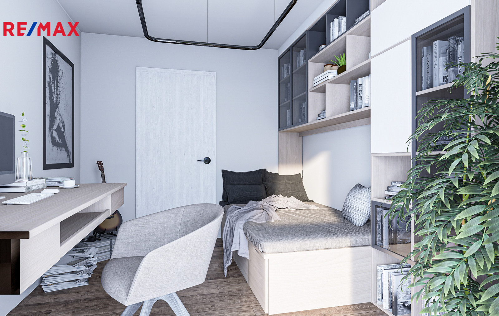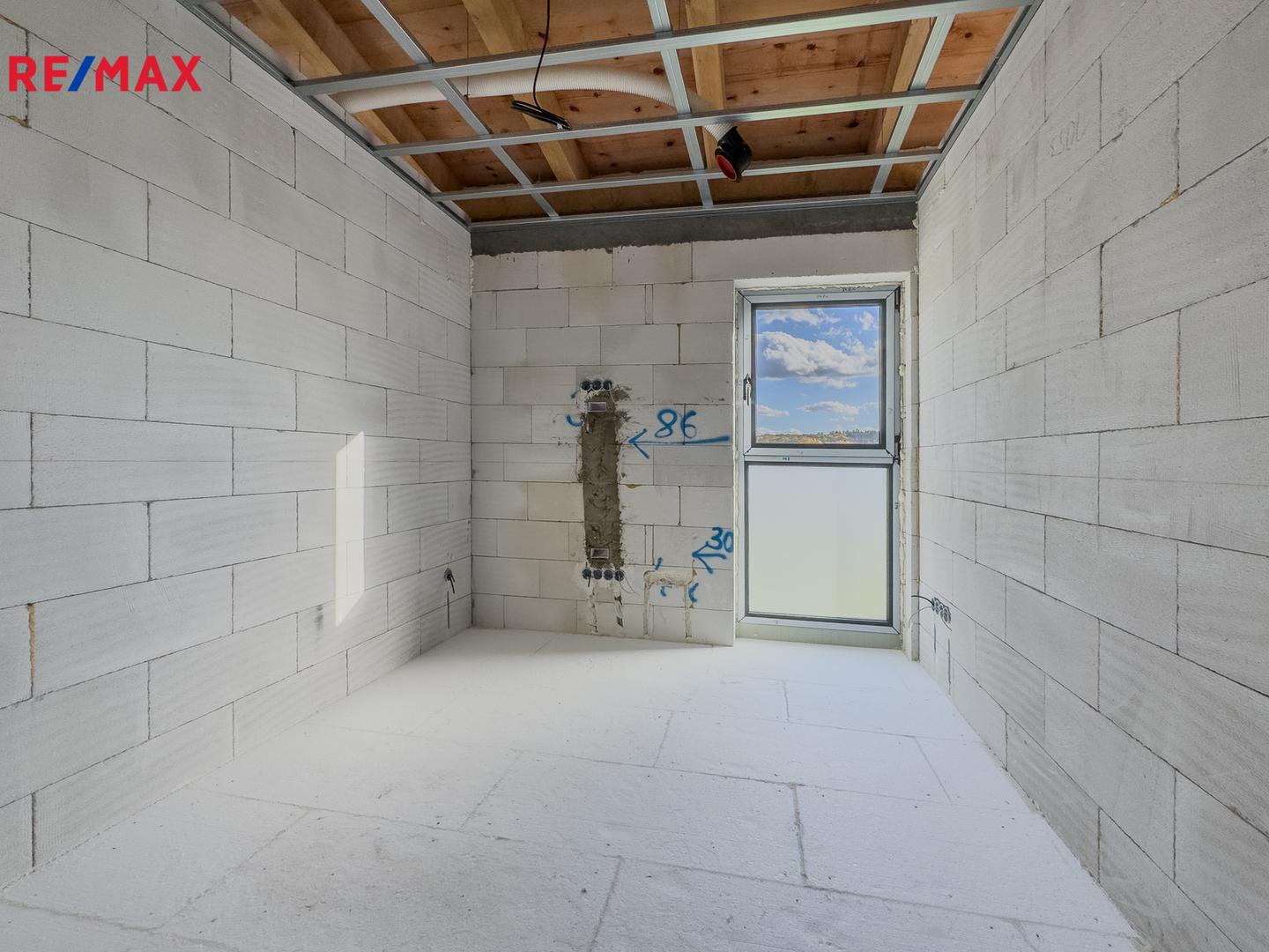 Vizualizace mají ilustrační charakter. Jednotka bude předána připravená k nastěhování (koupelna včetně sanity, technická místnost včetně technologií), vyjma kuchyňské linky a nábytku.
