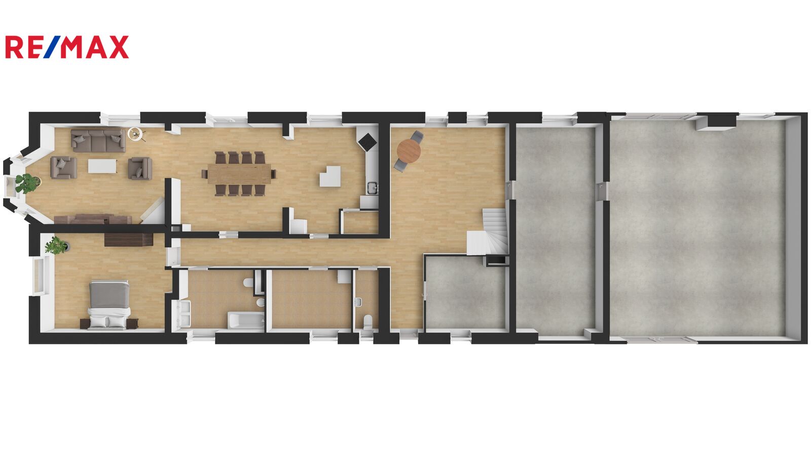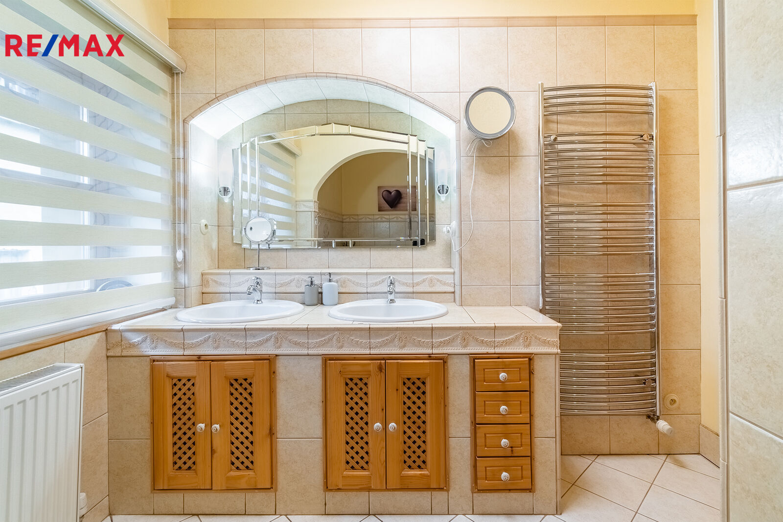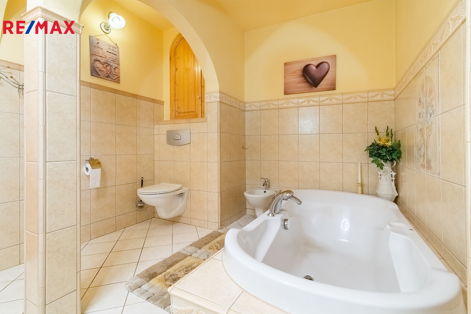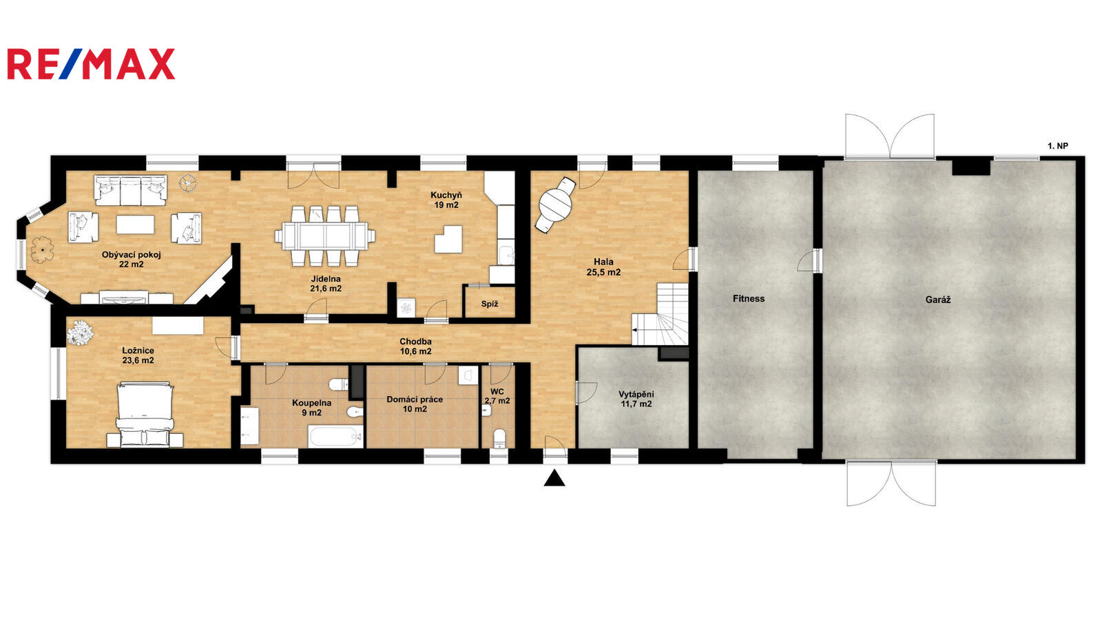 V 1.NP se nachází prostorná hala s krásným smrkovým schodištěm, fitness, technická místnost, ložnice, prádelna, samostatné wc a koupelna s vanou, bidetem a toaletou. Srdcem domu je otevřený prostor obývacího pokoje, kde je dominantou krb s francouzskou vložkou, moderní kuchyní s ostrůvkem a navazující jídelnou, ze které je možnost vejít na terasu. Zde je hotová příprava na zapuštěný bazén a najdeme tady dostatek prostoru k relaxaci a odpočinku.