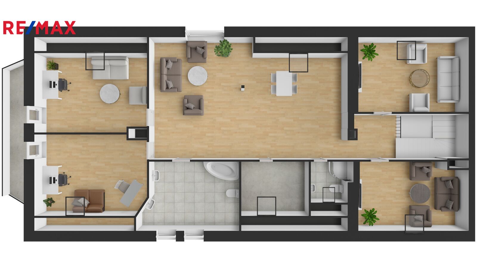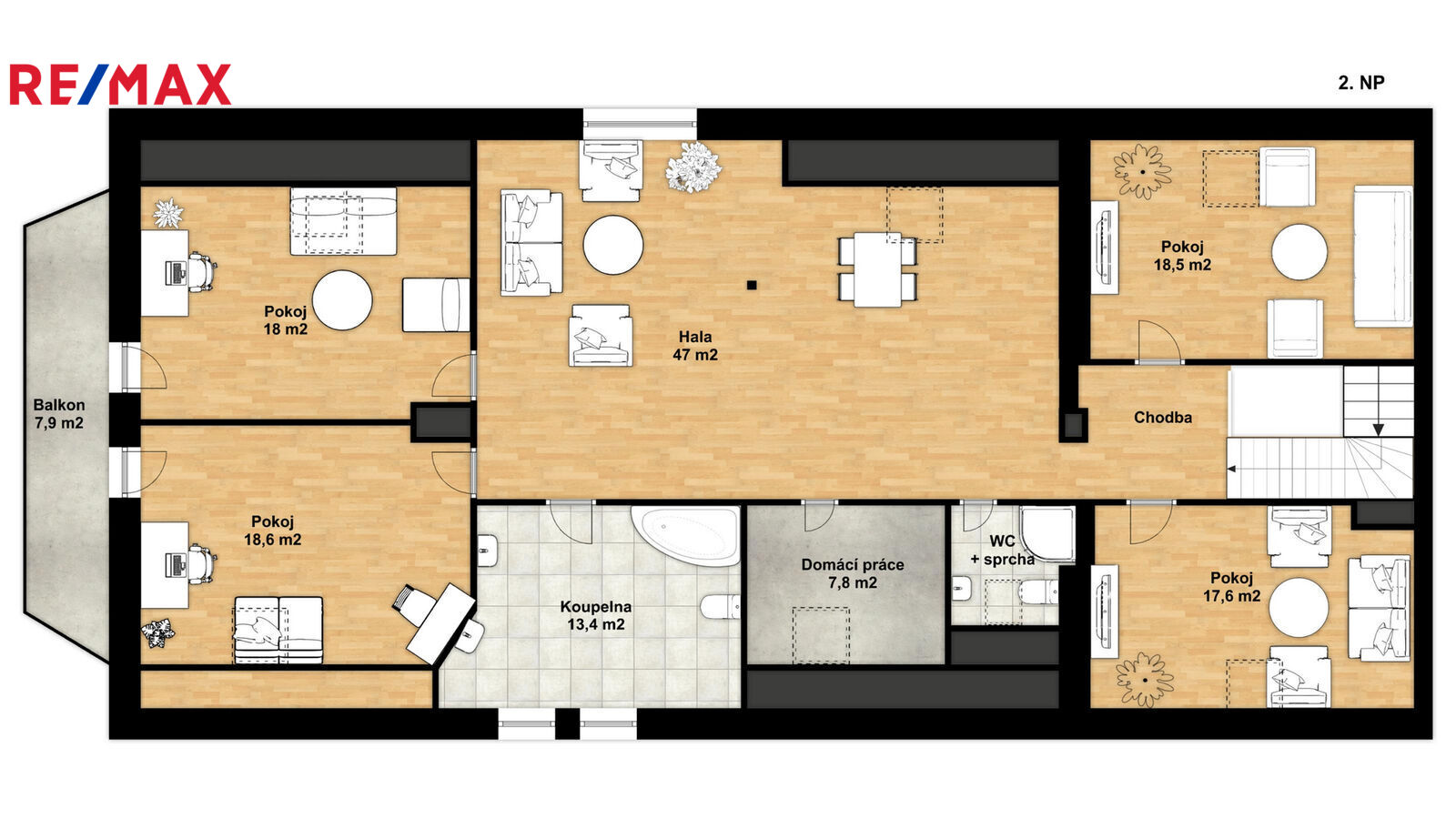V 2.NP se nachází 4 prostorné pokoje, koupelna s wc a sprchovým koutem, pracovnou a velkou koupelnou s rohovou vanou, přípojkou na pračku, dvojumyvadlem, bidetem a toaletou. V otevřeném prostoru lze vybudovat kuchyňský kout, pro který jsou instalace připraveny.