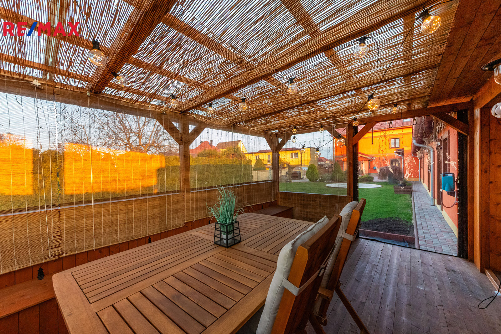 Zahrada navržená zahradním architektem nabízí příjemné soukromí, altán pro venkovní posezení i retenční nádrž na dešťovou vodu o objemu 30 m³ s tlakovým čerpadlem pro zavlažování.