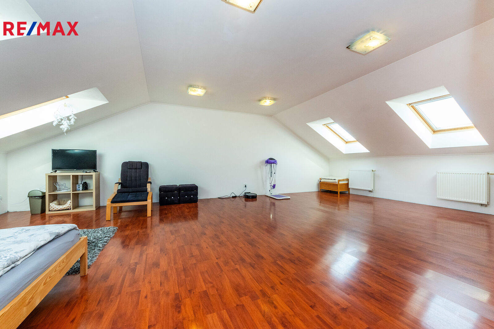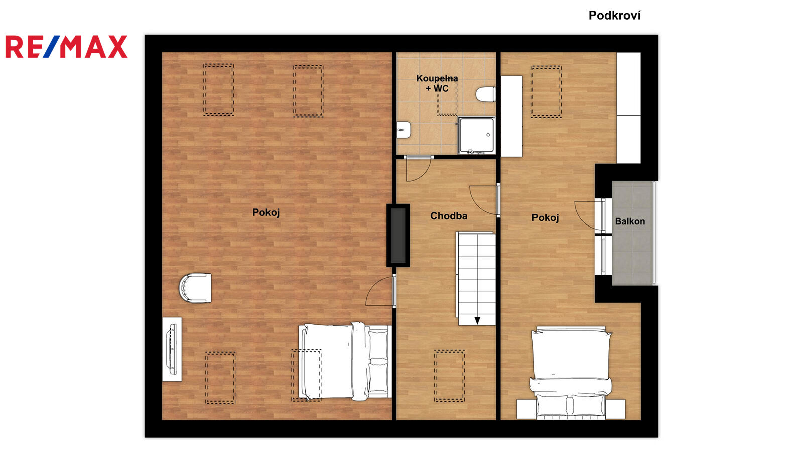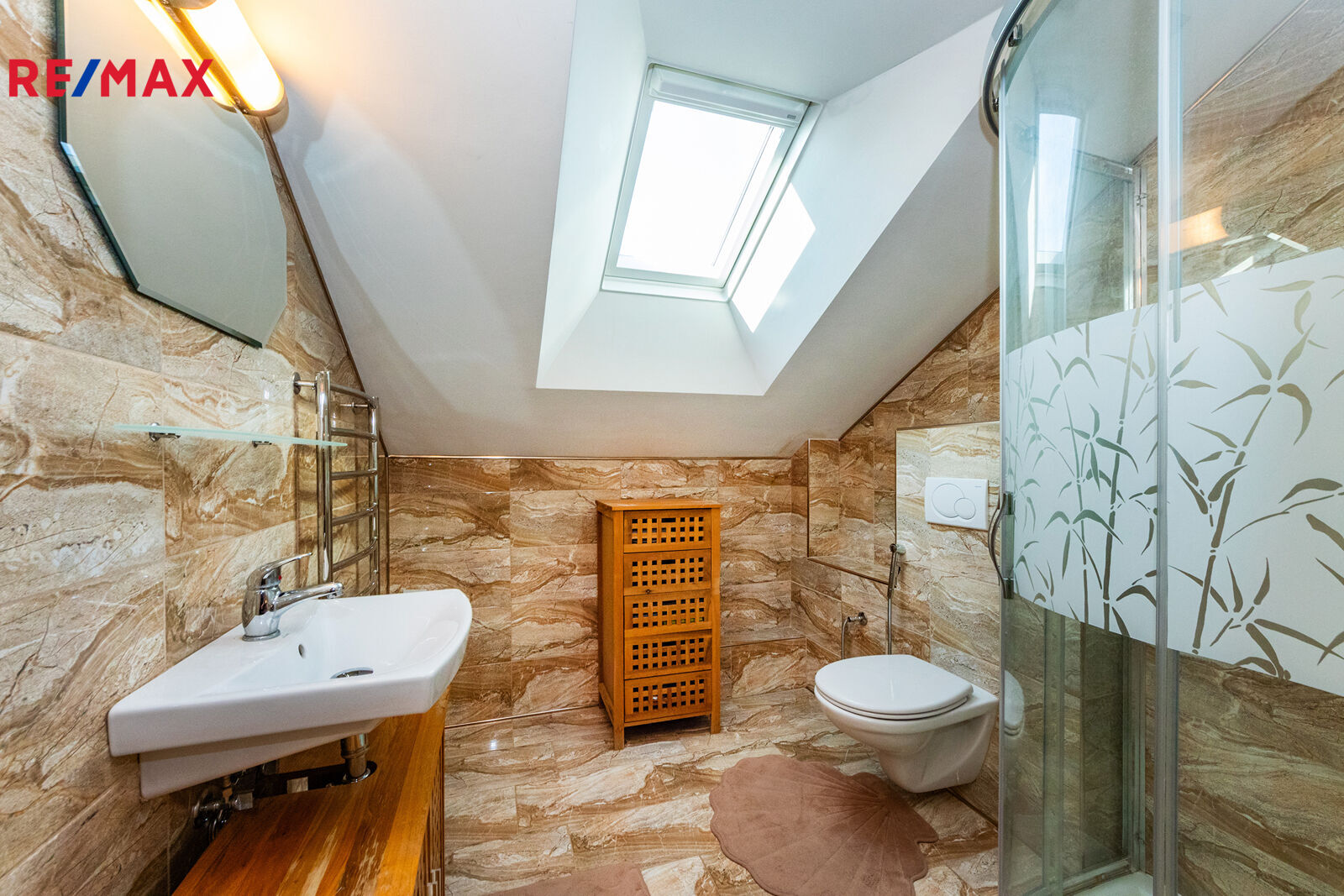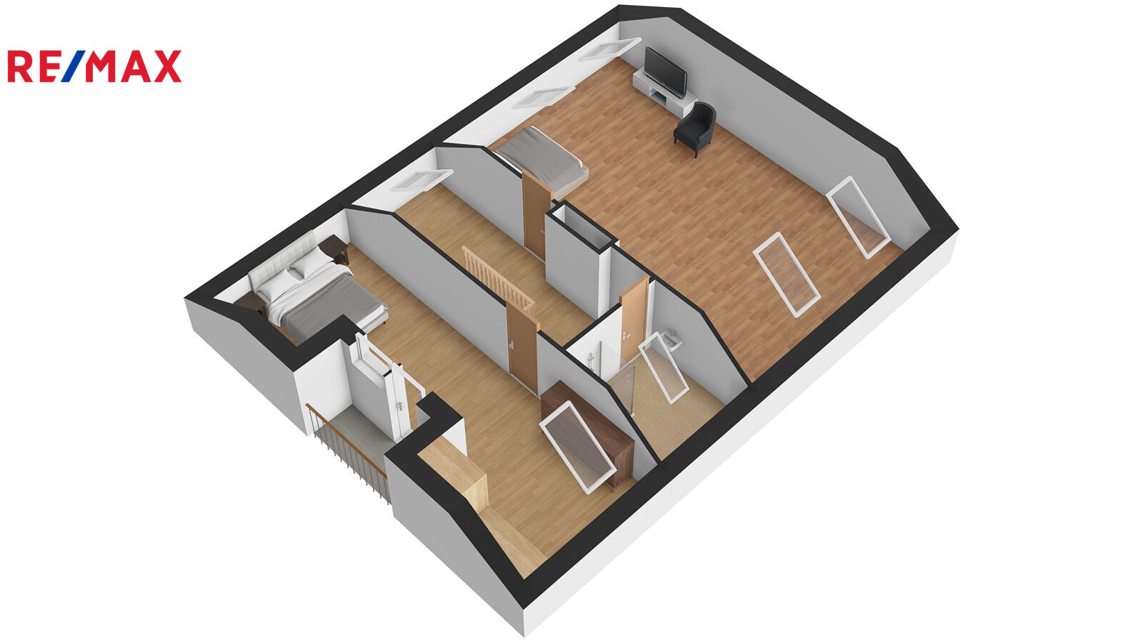 Podkroví: prostorný obytný prostor s přípravou na kuchyň, ložnice s lodžií, koupelna se sprchovým koutem a toaletou, střešní okna Velux zajišťující dostatek denního světla