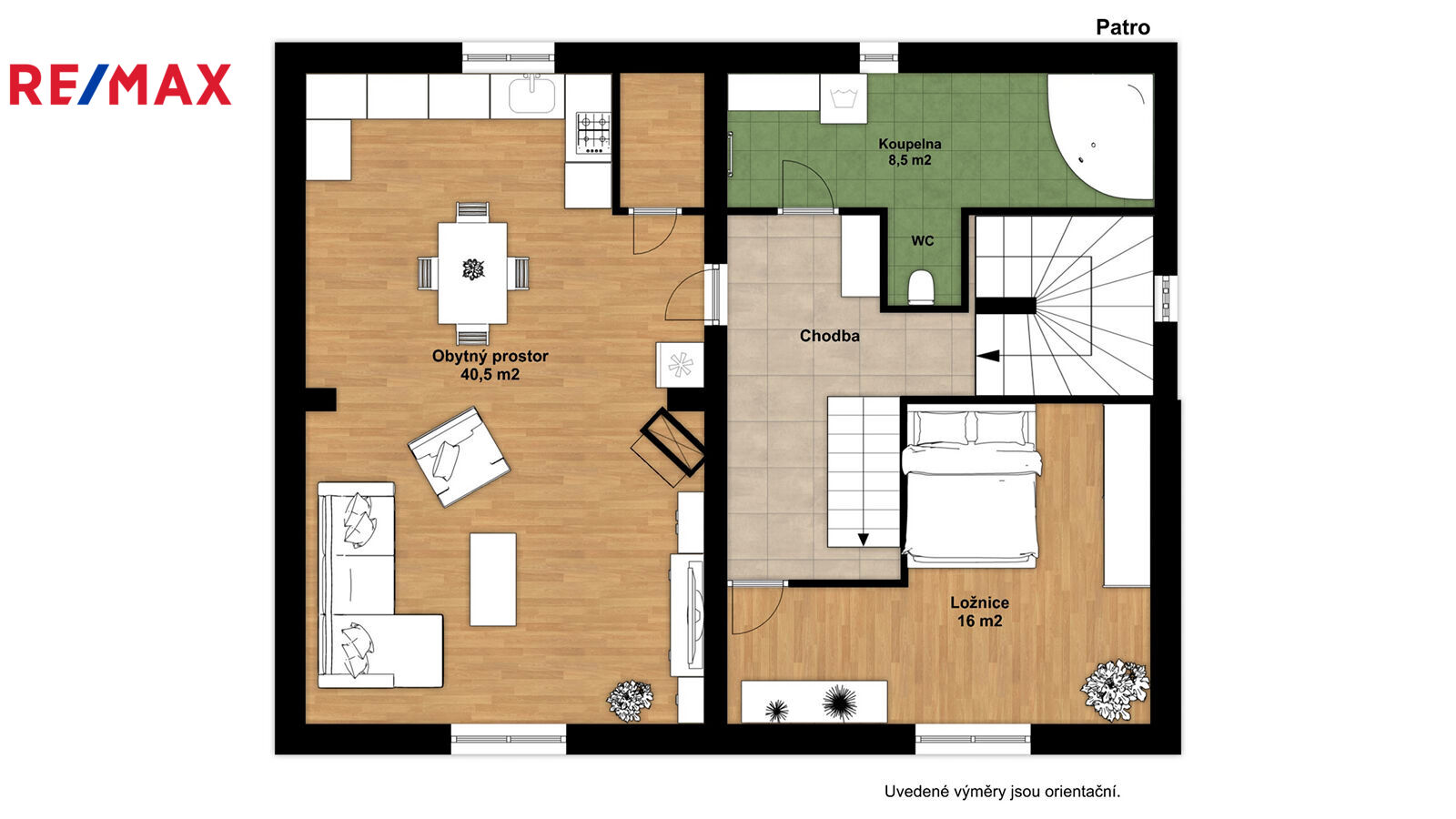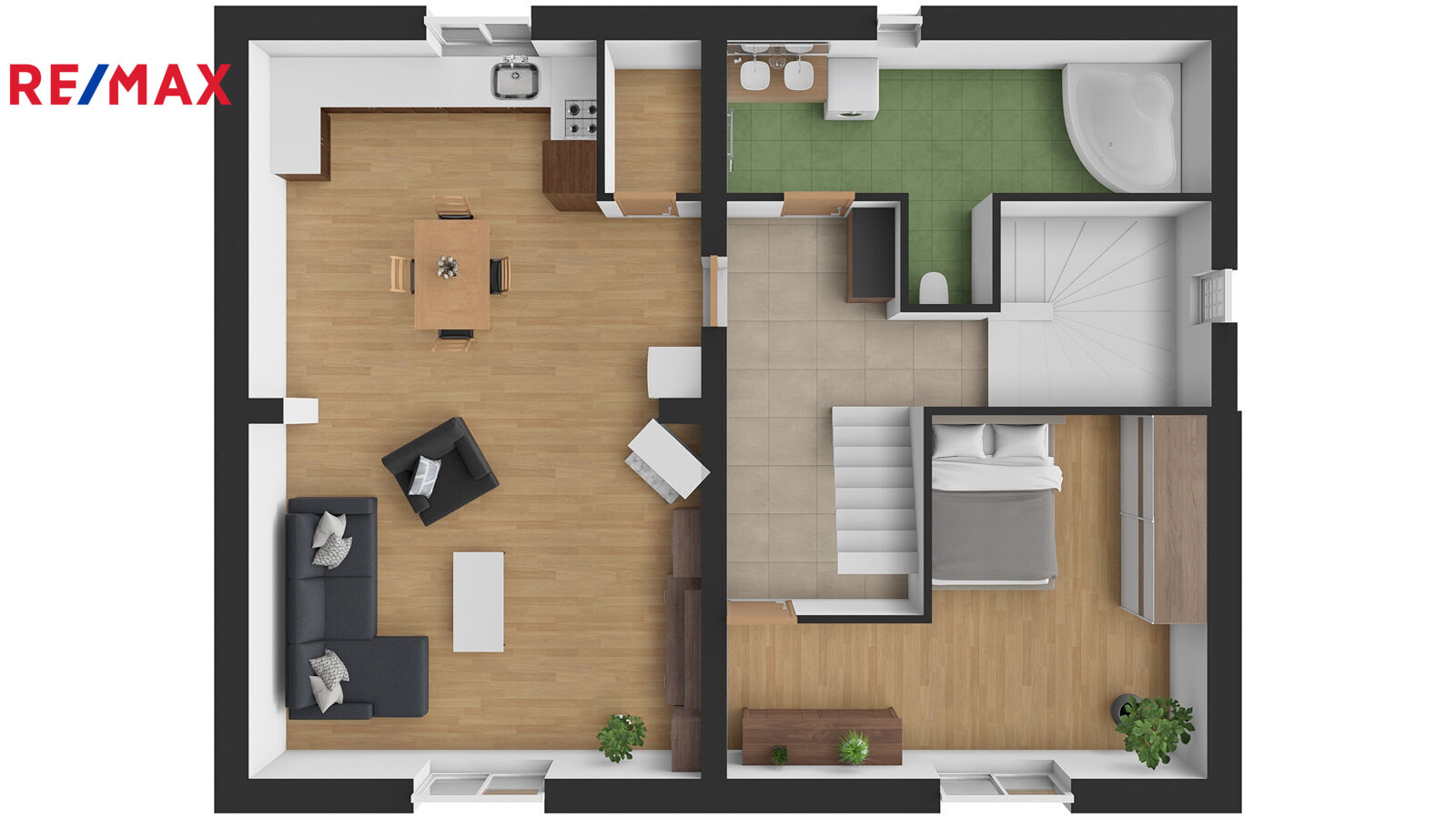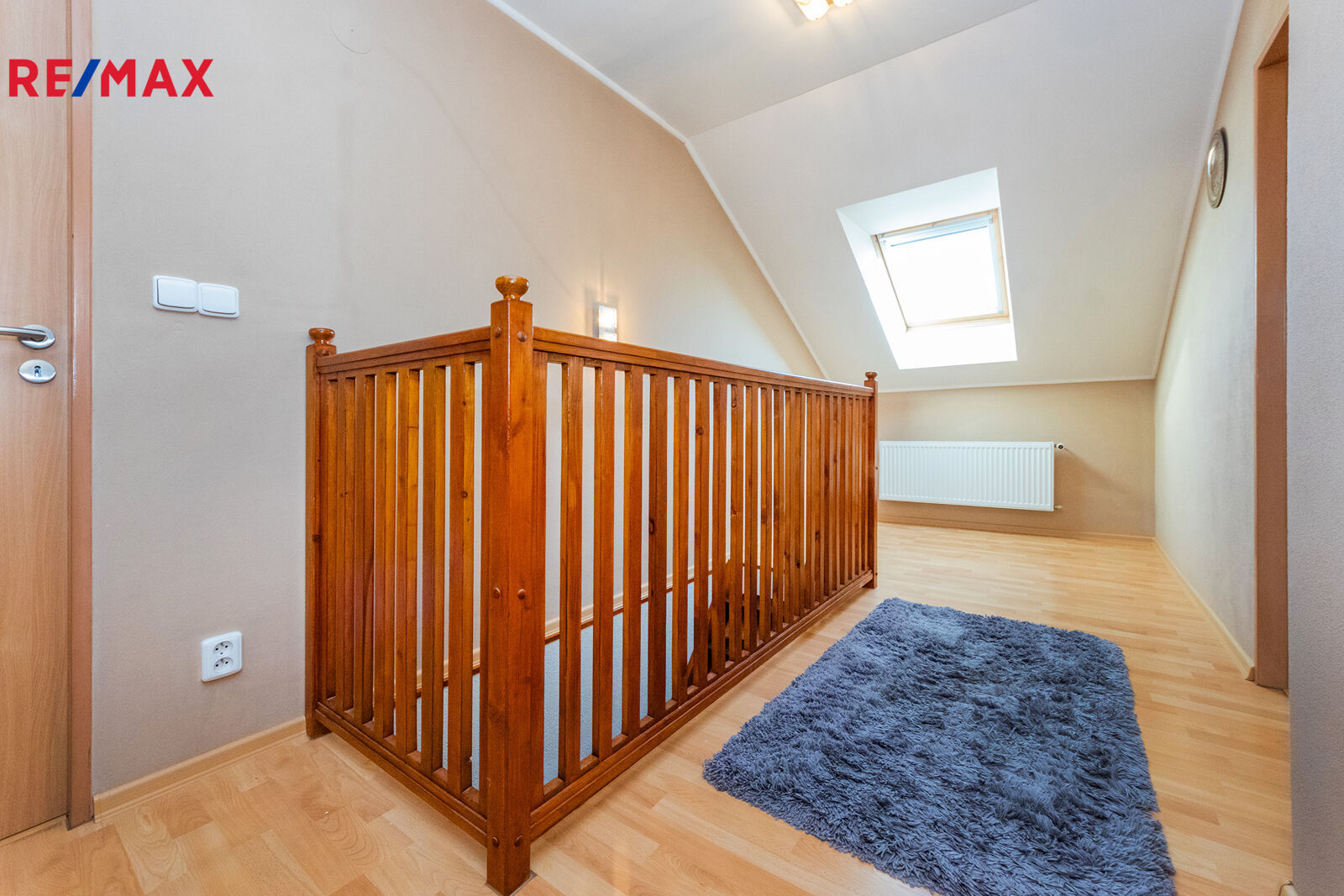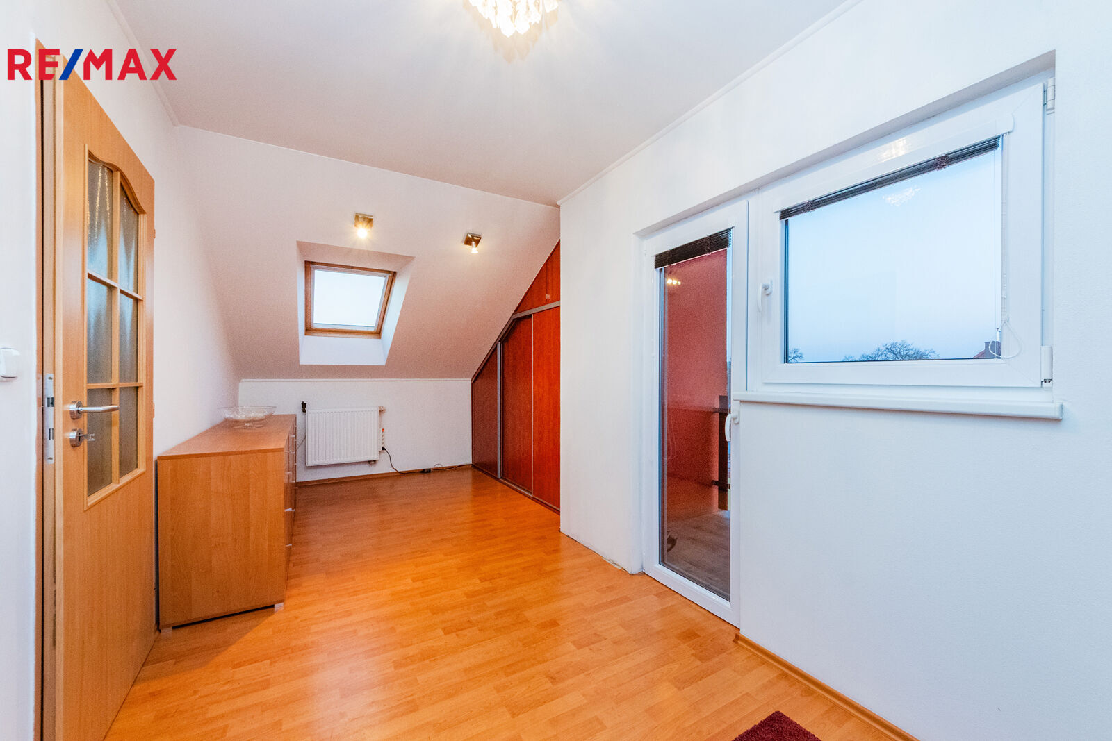 Podkroví: prostorný obytný prostor s přípravou na kuchyň, ložnice s lodžií, koupelna se sprchovým koutem a toaletou, střešní okna Velux zajišťující dostatek denního světla