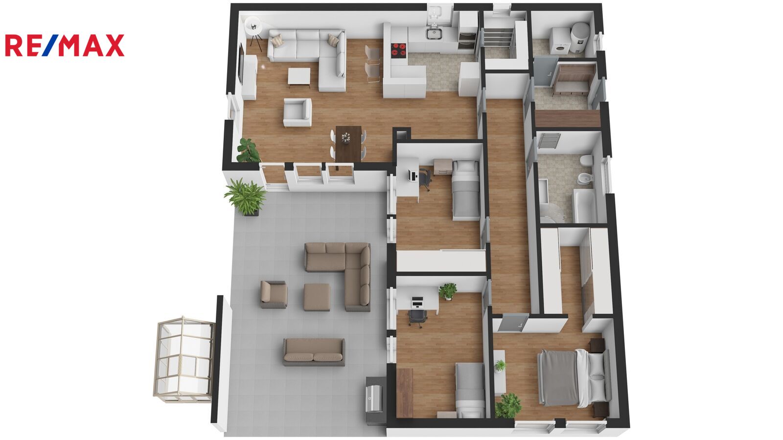 Dům se skládá z prostorného obývacího pokoje s kuchyní a nabízí přímý výstup na zastřešenou terasu, ideální pro relaxaci nebo letní grilování. Ložnice disponuje šatnou a dva další samostatné pokoje mají rovněž přímý přístup na terasu, což zajišťuje dostatek přirozeného světla. Praktická předsíň s technickou místností je propojena s chodbou vedoucí do jednotlivých pokojů. Koupelna je vybavena vanou, sprchovým koutem, toaletou a bidetem.