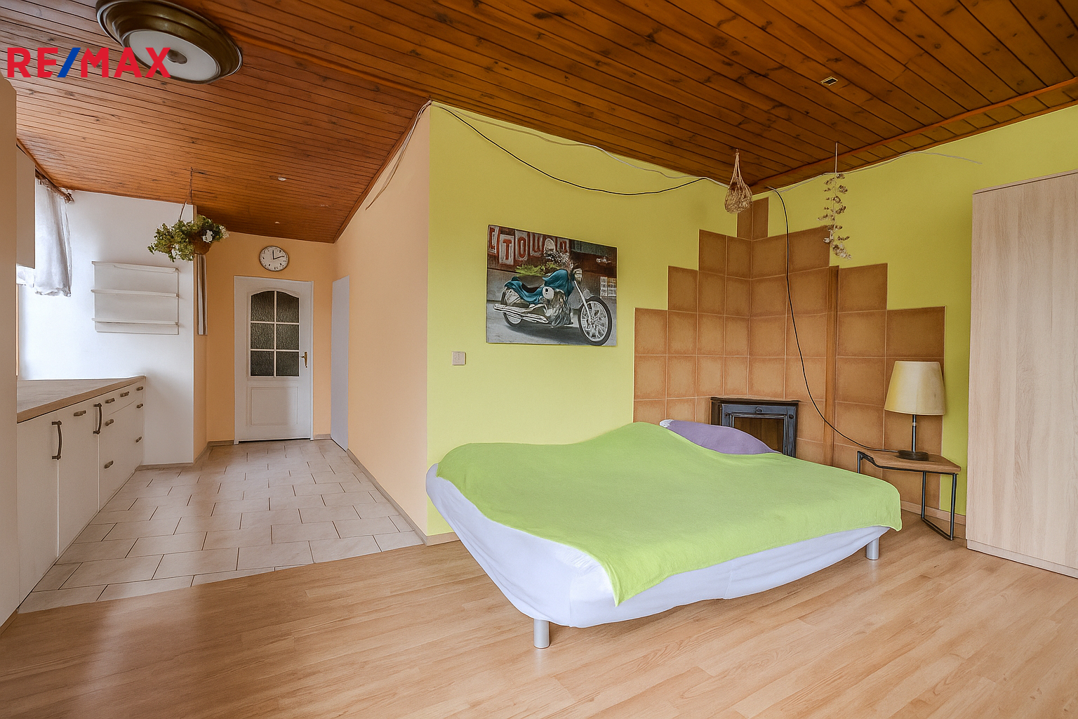 Některé fotografie jsou prezentovány s využitím AI home staiging, a to bez nábytku a osobních věcí, část prostor v 1.NP, průjezd domu, dílna.