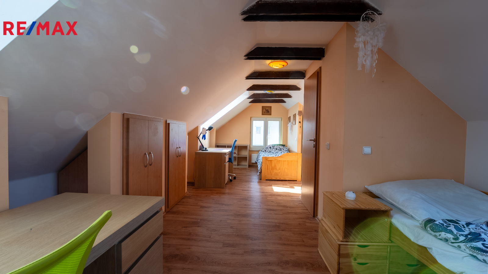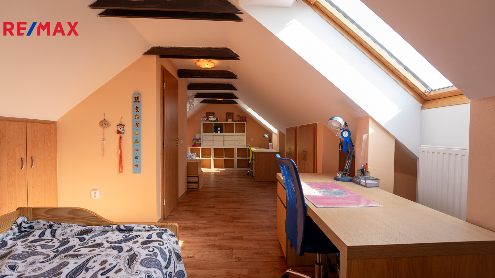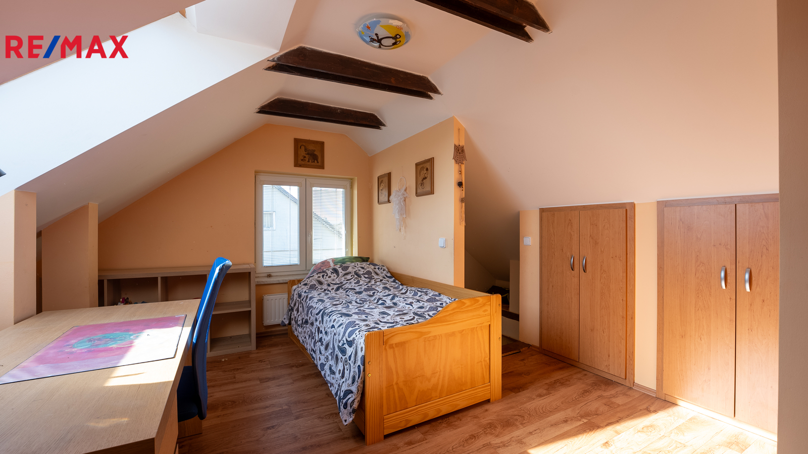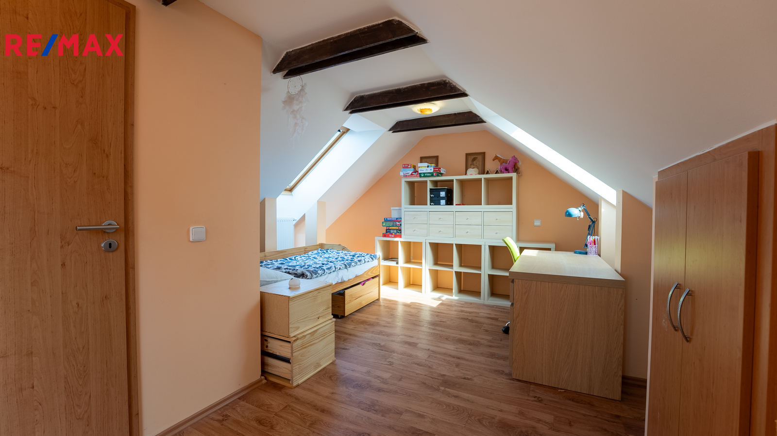 Dispozice domu nabízí praktické uspořádání místností, přičemž velký podkrovní pokoj je ideální například jako dětský pokoj, herna nebo pracovna. V domě se nachází jedna koupelna a dvě WC, což zvyšuje komfort pro vícečlennou domácnost. Nemovitost je částečně podsklepená a nabízí tak další úložné či technické zázemí.