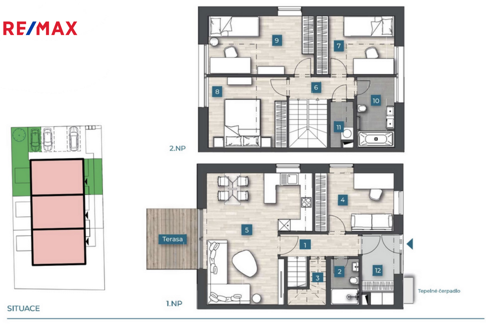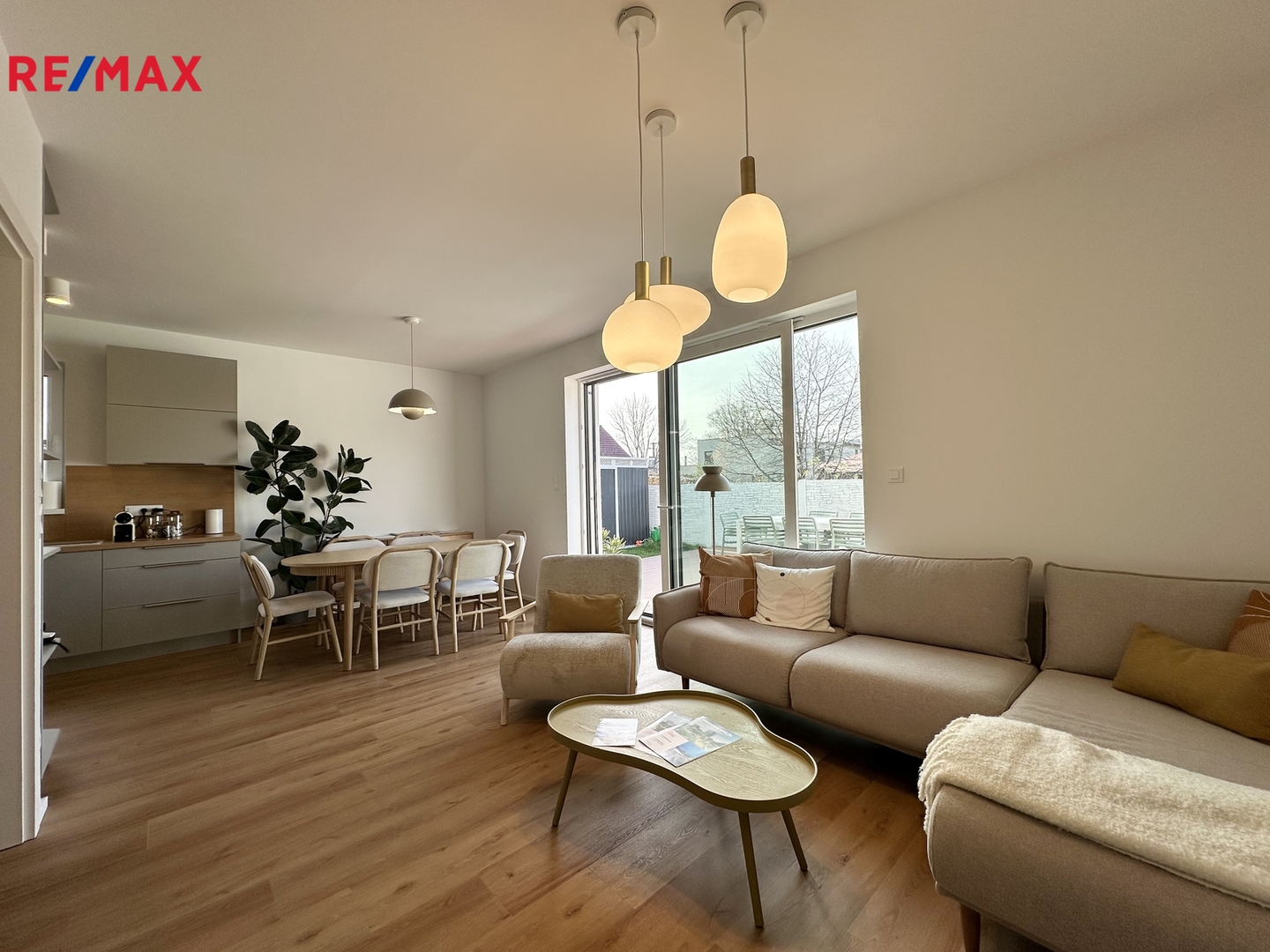 Každý dům nabízí do detailu promyšlenou dispozici 5+kk - 4 samostatné pokoje, obývací pokoj s kuchyňským koutem, 2 koupelny a technickou místnost. Venku posedíte na terase či na zahradě a před domem zaparkujete dva své vozy.