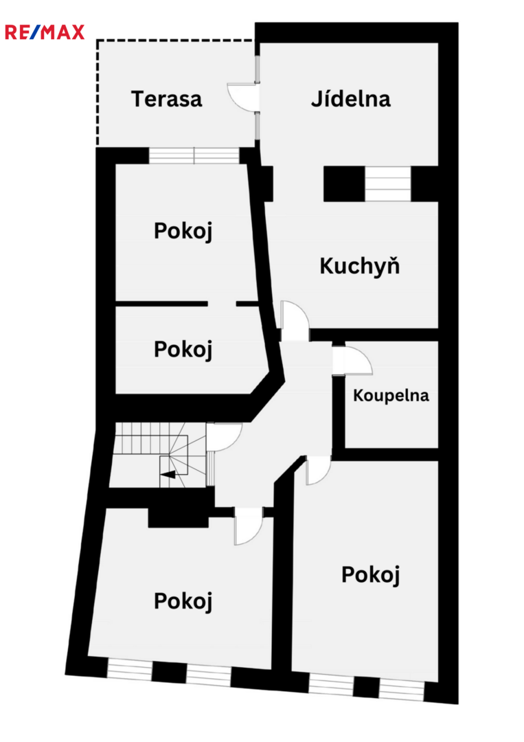 V prvním patře se nachází větší bytová jednotka s dispozicí 4 pokoje, kuchyň, jídelna, koupelna s toaletou a terasa. Díky vnitřnímu uspořádání zde existuje možnost rozdělit prostor na dvě samostatné bytové jednotky 2+kk.