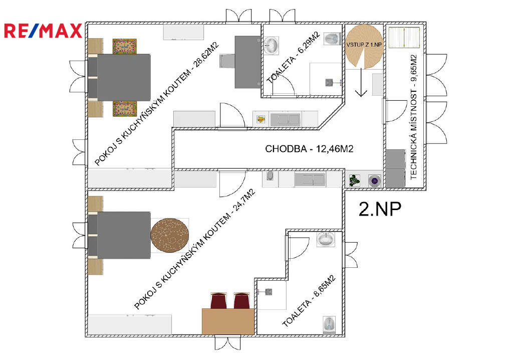 -2. nadzemní patro – dvě samostatné jednotky 1+kk (vhodné k bydlení, pronájmu, realizaci podnikání nebo pro hosty)