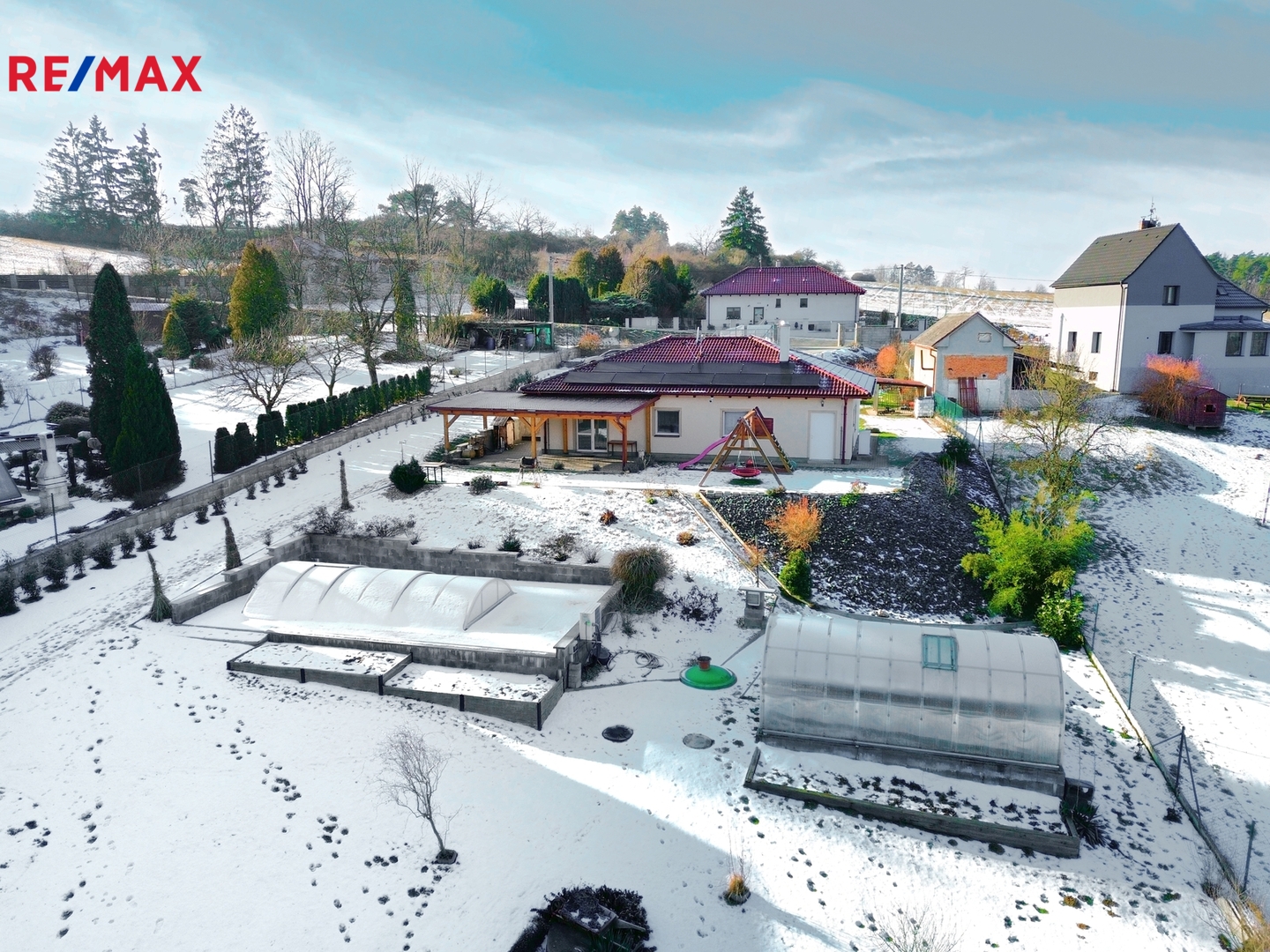 Pozemek je oplocený, svažitý a poskytuje vysokou míru soukromí. K dispozici je terasa o ploše cca 54 m², krytý vyhřívaný bazén 18 m² se slanou vodou a protiproudem, zahradní domek, skleník 3×6 m na betonové podezdívce, vyvýšené záhony, hospodářské zázemí, přístřešek a kotec. Pozemek je osázen ovocnými stromy (jabloň, švestka, třešeň, ořešák). Parkování je možné až pro šest vozidel na vlastním pozemku.