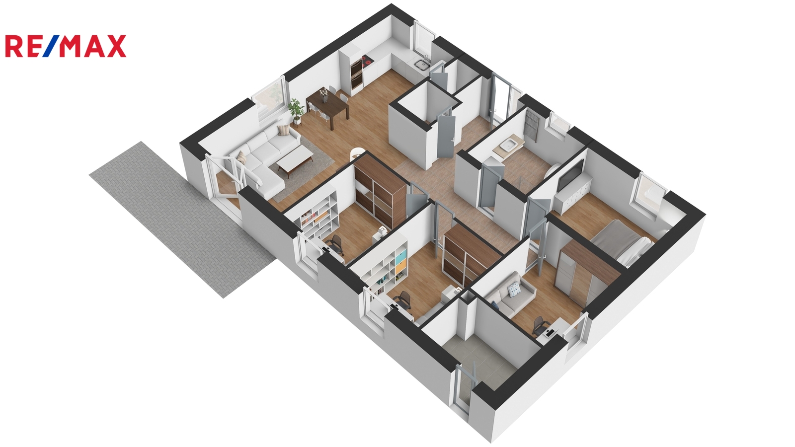 Dispozice domu nabízí obývací pokoj s kuchyňským koutem, čtyři samostatné pokoje, koupelnu, samostatné WC, technickou místnost a spíž. Řešení je ideální pro rodinu s dětmi i pro kombinaci bydlení a práce z domova.