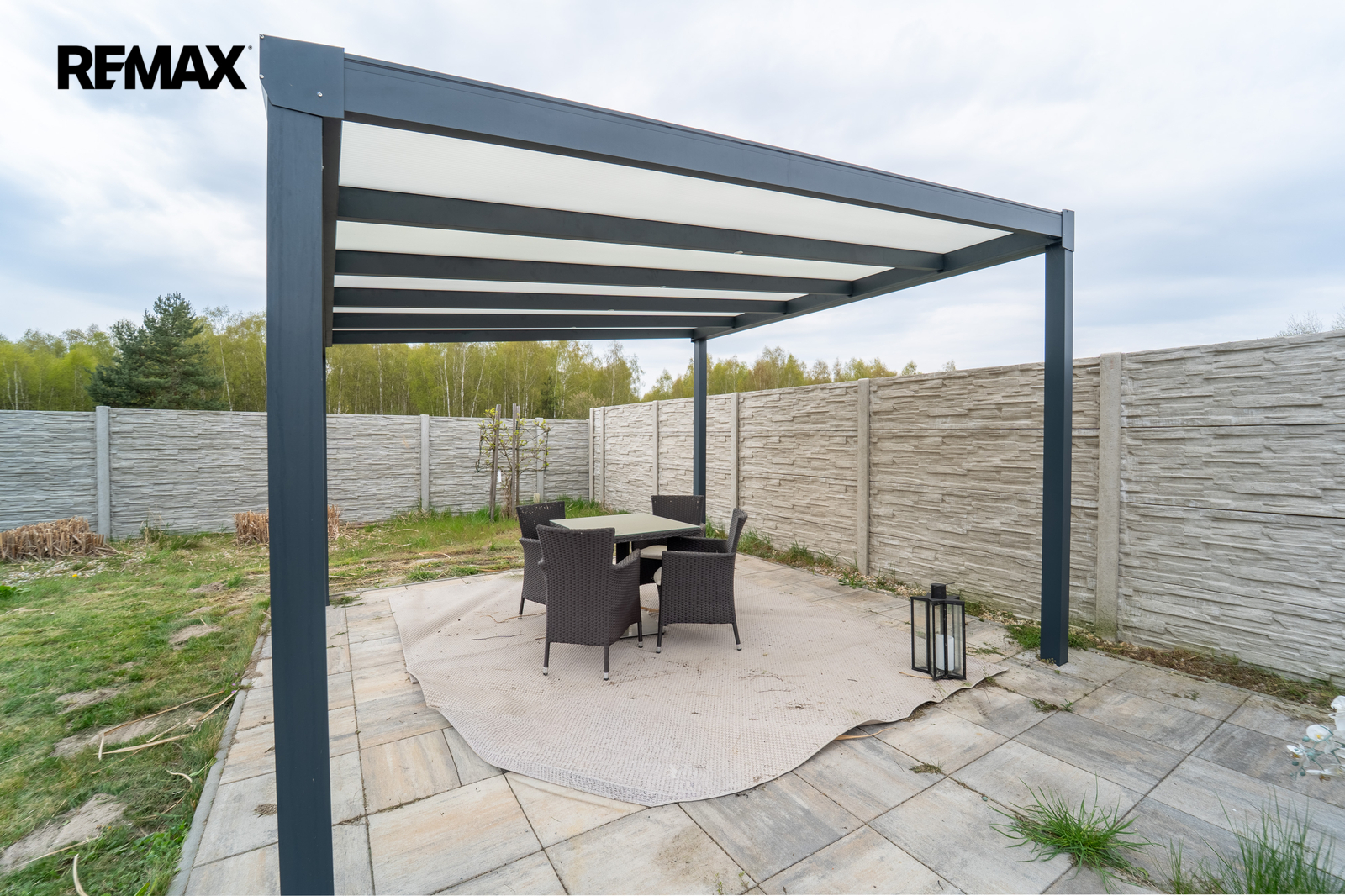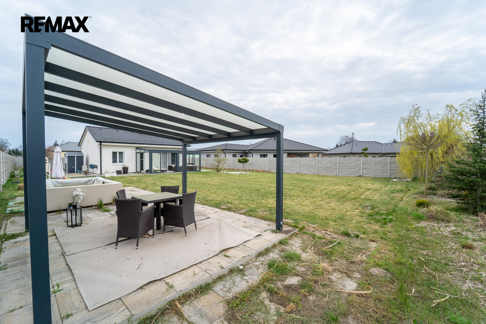 Na zahradě se nachází také stylová pergola ve stejném designu, která nabízí další příjemné místo pro posezení nebo relaxaci.