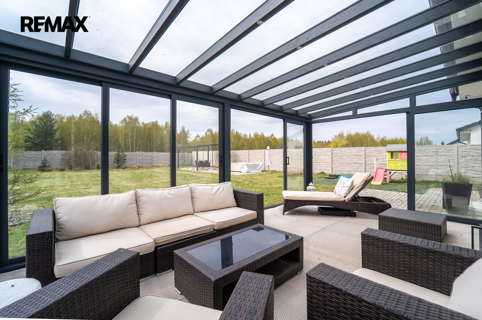 Velkým benefitem je zastřešená terasa řešená jako zimní zahrada s posuvným systémem – prostor lze kompletně uzavřít nebo otevřít a propojit se zahradou. Díky tomu ji můžete využívat po celý rok.