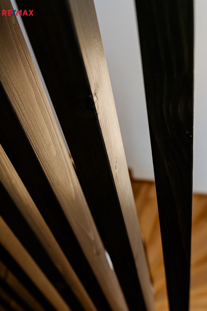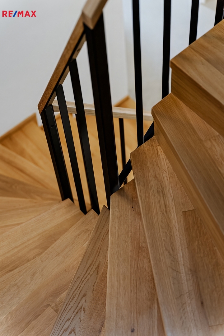 První patro: 4 obytné pokoje, z toho hlavní ložnice s balkonem, hlavní koupelna.