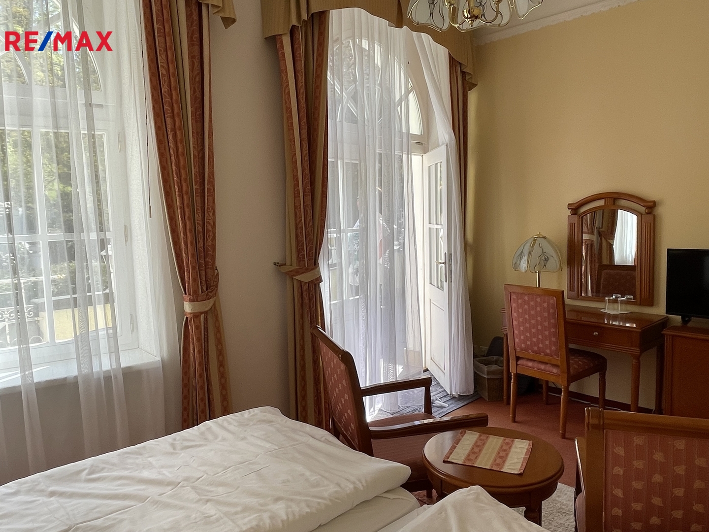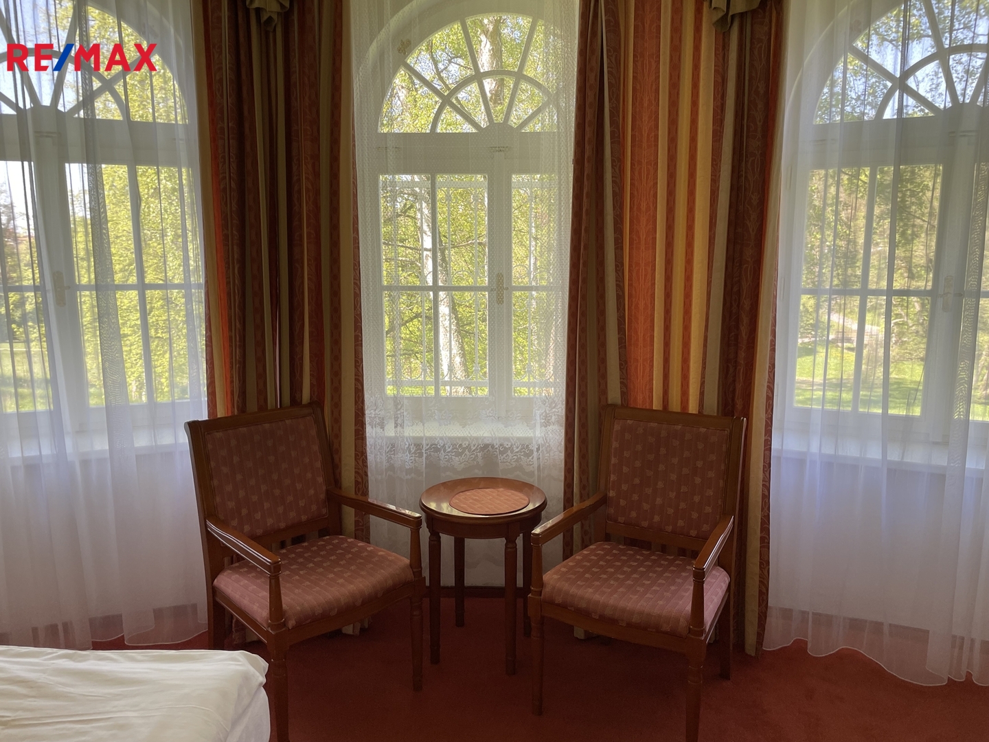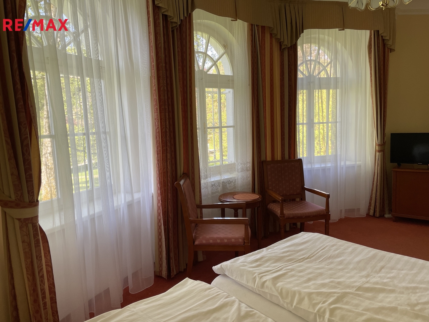 Toužíte po klidu a pohodě. Potřebujete mít k duševnímu klidu krásný výhled do parku a zeleně? Nechcete se však vzdát svých koníčků jako je Golf, tenis, cyklistika či jen procházky v přírodě. Slavkovský les tu na Vás čeká s celou svou klidnou monumentálností. Nyní nemovitost nabízí lůžkovou kapacitu 31 postelí ve dvoulůžkových pokojích. Najdete zde malé balneo s výřivkou a masážemi. Funkční kuchyni schopnou připravovat kompletní jídelní menu. Vše vkusné a zachovalé, ale ruku na srdce. Hotýlek má své nejlepší léta za sebou. Bude třeba investovat do zařízení i z části poškozené stavby, hlavně vlhkostí od boční terásky. Svým zaměřením na německé důchodce se již vyčerpal a nyní bude chtít vdechnout novou krev. Ať už bude Váš záměr s budovou jakýkoliv, věřím že naplní Vaše očekávání a bude Vám a Vašim potomkům ještě dlouho sloužit.