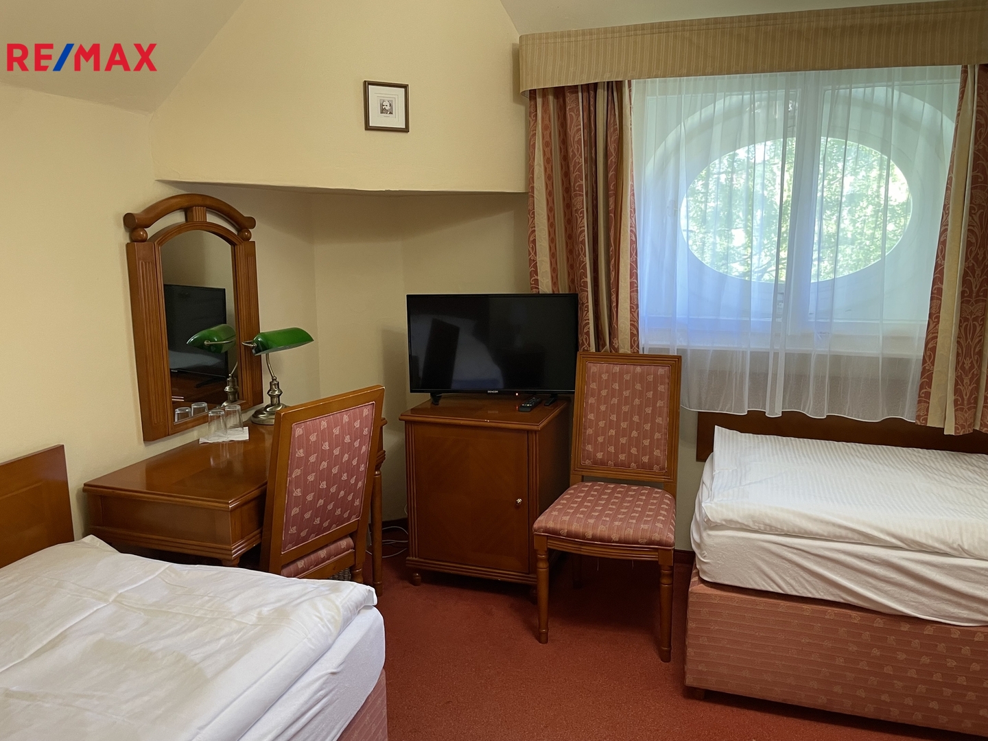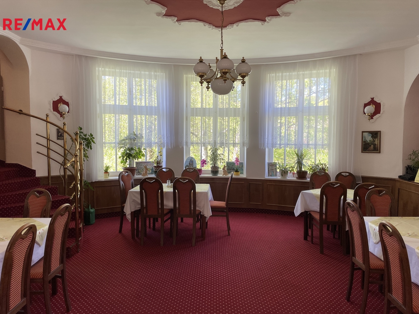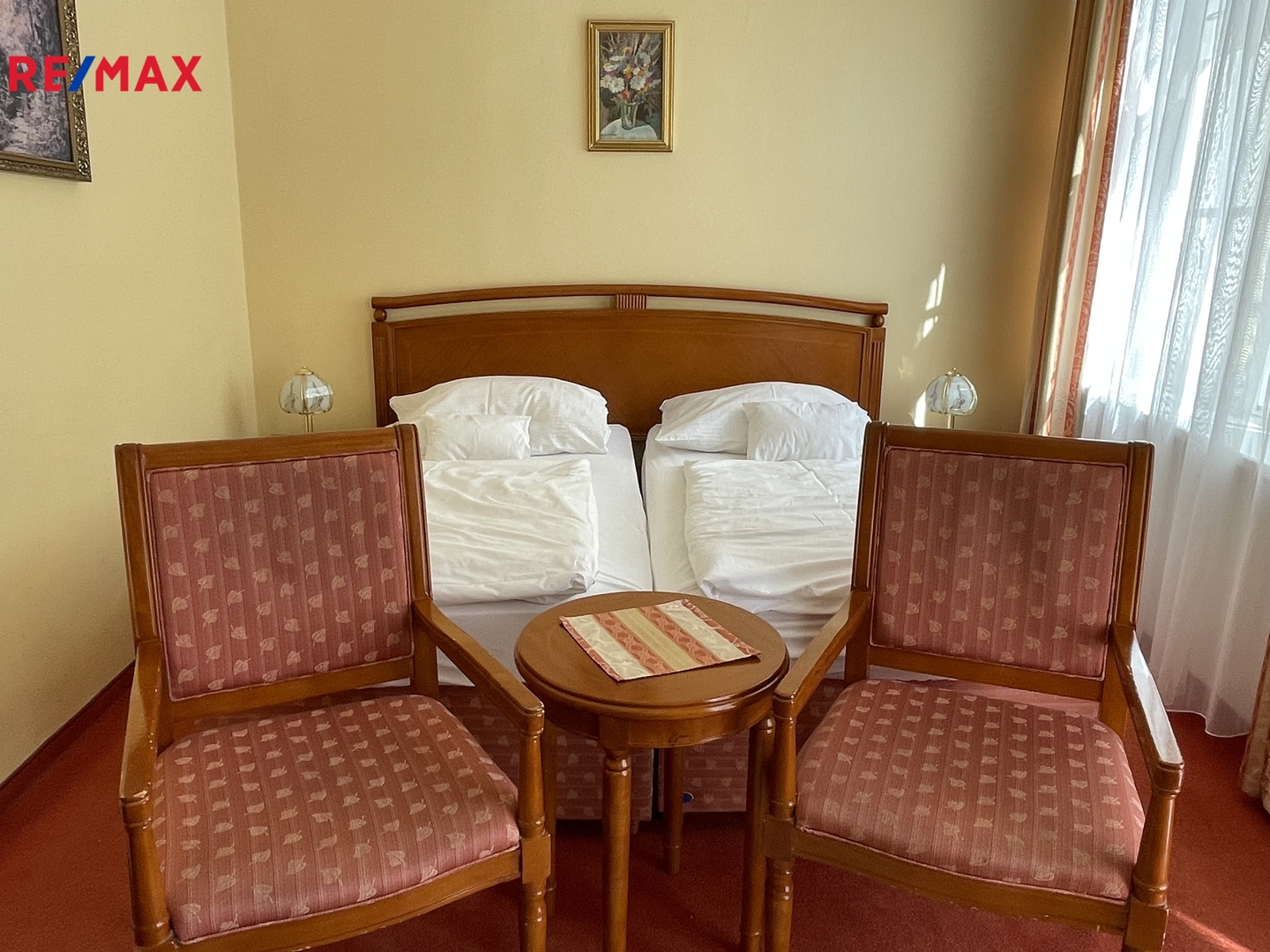 Toužíte po klidu a pohodě. Potřebujete mít k duševnímu klidu krásný výhled do parku a zeleně? Nechcete se však vzdát svých koníčků jako je Golf, tenis, cyklistika či jen procházky v přírodě. Slavkovský les tu na Vás čeká s celou svou klidnou monumentálností. Nyní nemovitost nabízí lůžkovou kapacitu 31 postelí ve dvoulůžkových pokojích. Najdete zde malé balneo s výřivkou a masážemi. Funkční kuchyni schopnou připravovat kompletní jídelní menu. Vše vkusné a zachovalé, ale ruku na srdce. Hotýlek má své nejlepší léta za sebou. Bude třeba investovat do zařízení i z části poškozené stavby, hlavně vlhkostí od boční terásky. Svým zaměřením na německé důchodce se již vyčerpal a nyní bude chtít vdechnout novou krev. Ať už bude Váš záměr s budovou jakýkoliv, věřím že naplní Vaše očekávání a bude Vám a Vašim potomkům ještě dlouho sloužit.