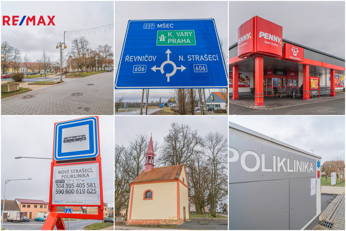 Město Nové Strašecí nabízí veškerou občanskou vybavenost (mateřská škola, základní škola, gymnázium, SOU, poliklinika, pošta, supermarkety, kulturní centrum, sportovní hala). Výborná dopravní dostupnost (autobusová zastávka směr Kladno, Praha, Rakovník, Řevničov - 300 m od domu, nájezd na dálnici D6 - 900 m od domu).