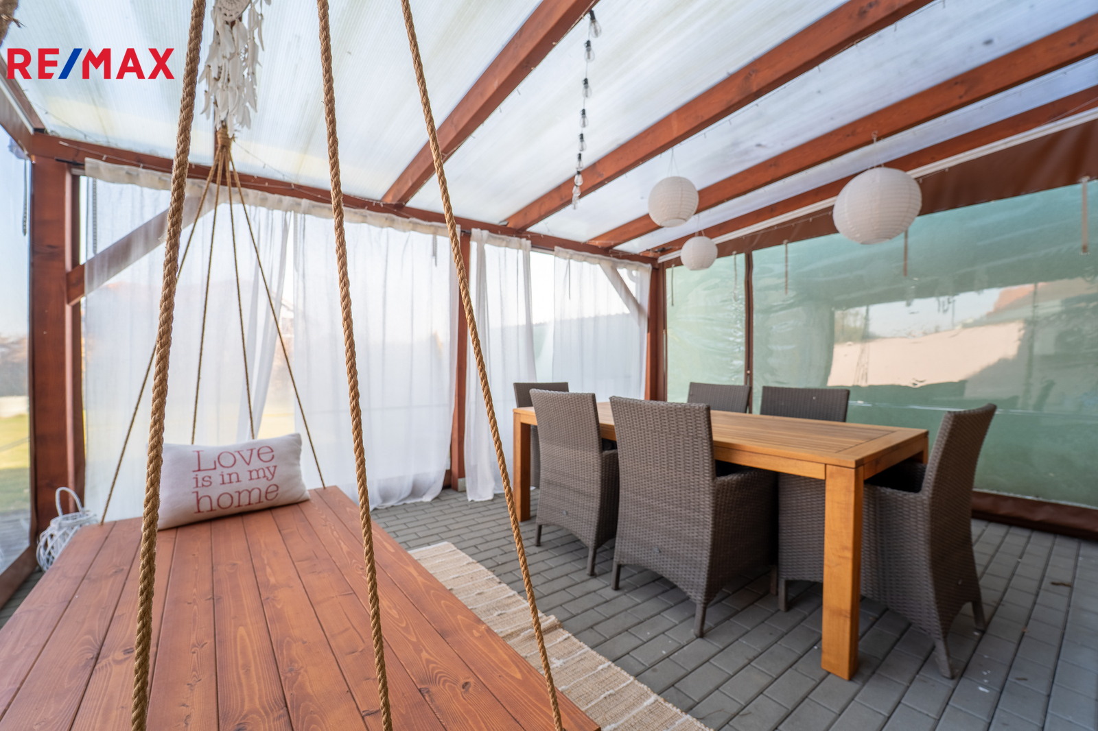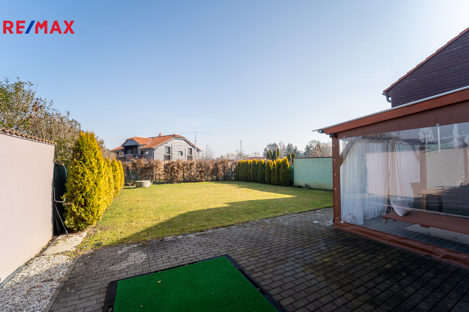 V přízemí domu se nachází velký obývací pokoj, na který navazuje kuchyně. Dřevěná francouzská okna dodávají prostoru maximální světlost a umožňují vstup na terasu a zahradu, kde díky vzrostlým dřevinám majitel nachází klid a soukromí. Na terase je instalována dřevěná pergola s možností zakrytí stěn při nepřízni počasí. Na zahradě je vrtaná studna, na kterou je napojena závlaha pro zahradu. Zahrada je i díky automatické sekačce koncipována jako bezúdržbová.