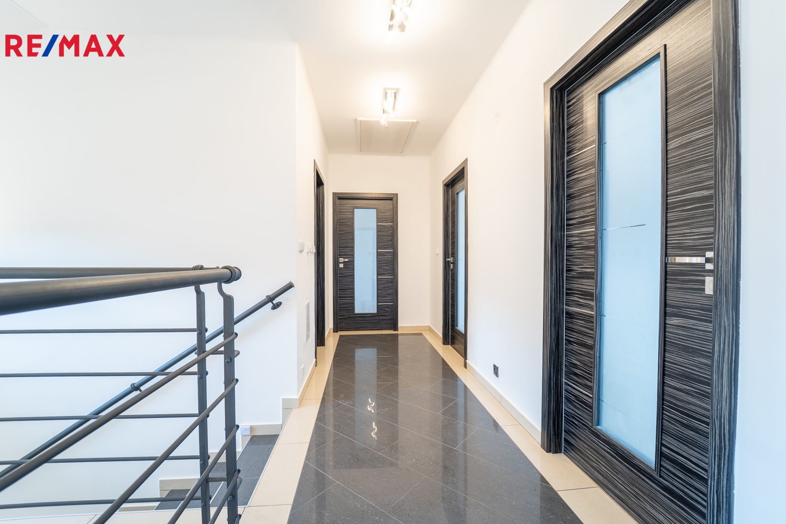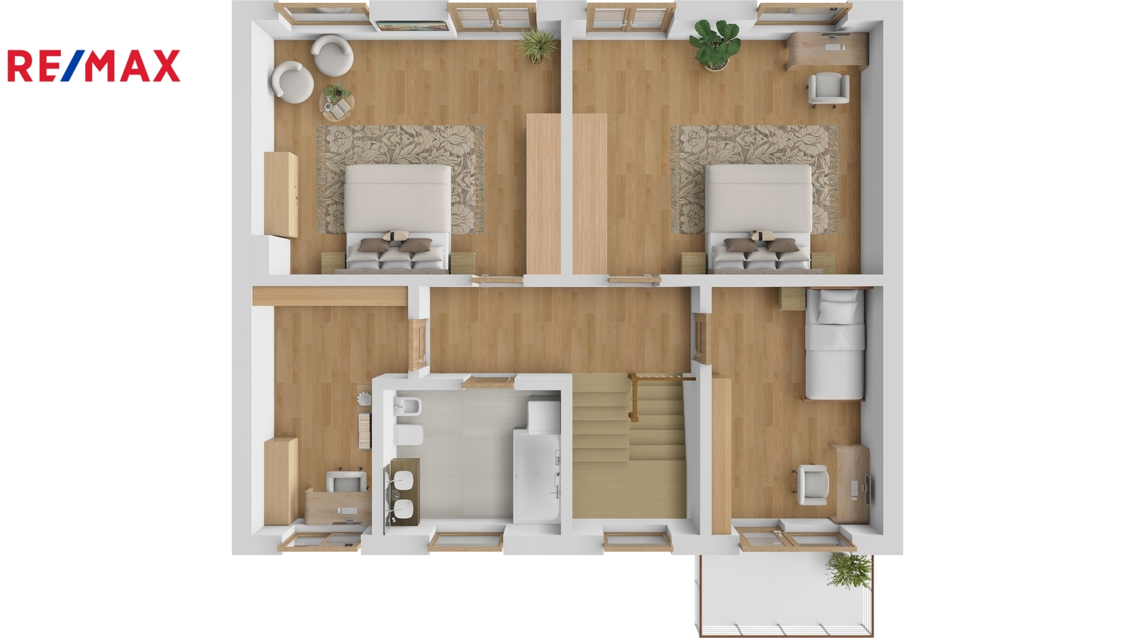 Do patra pak vedou pohodlné schody s podestou. V patře se nachází dva velkorysé dětské pokoje každý s výměrou 24 m2, ložnice s terasou a menší pokoj, který může sloužit jako pracovna či šatna. Koupelna je opět prostorná, je v ní umístěn nový plynový kondenzační kotel, který zajišťuje vytápění domu a ohřev vody.