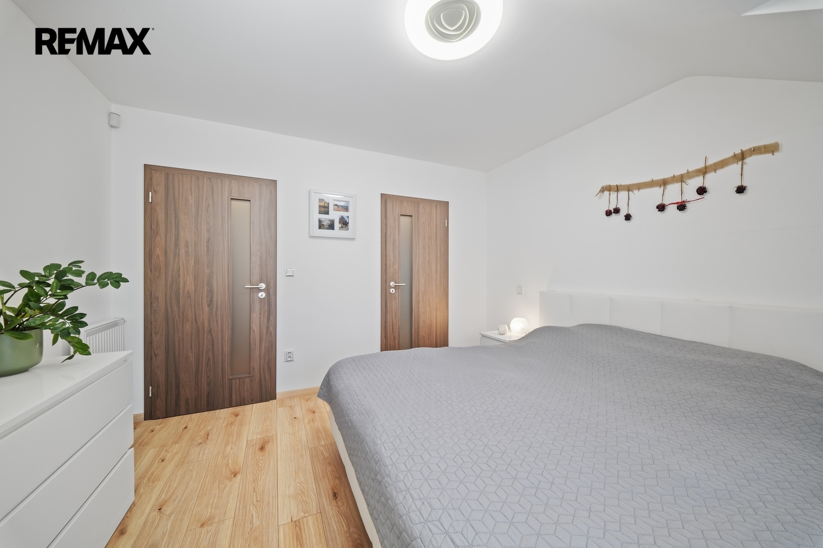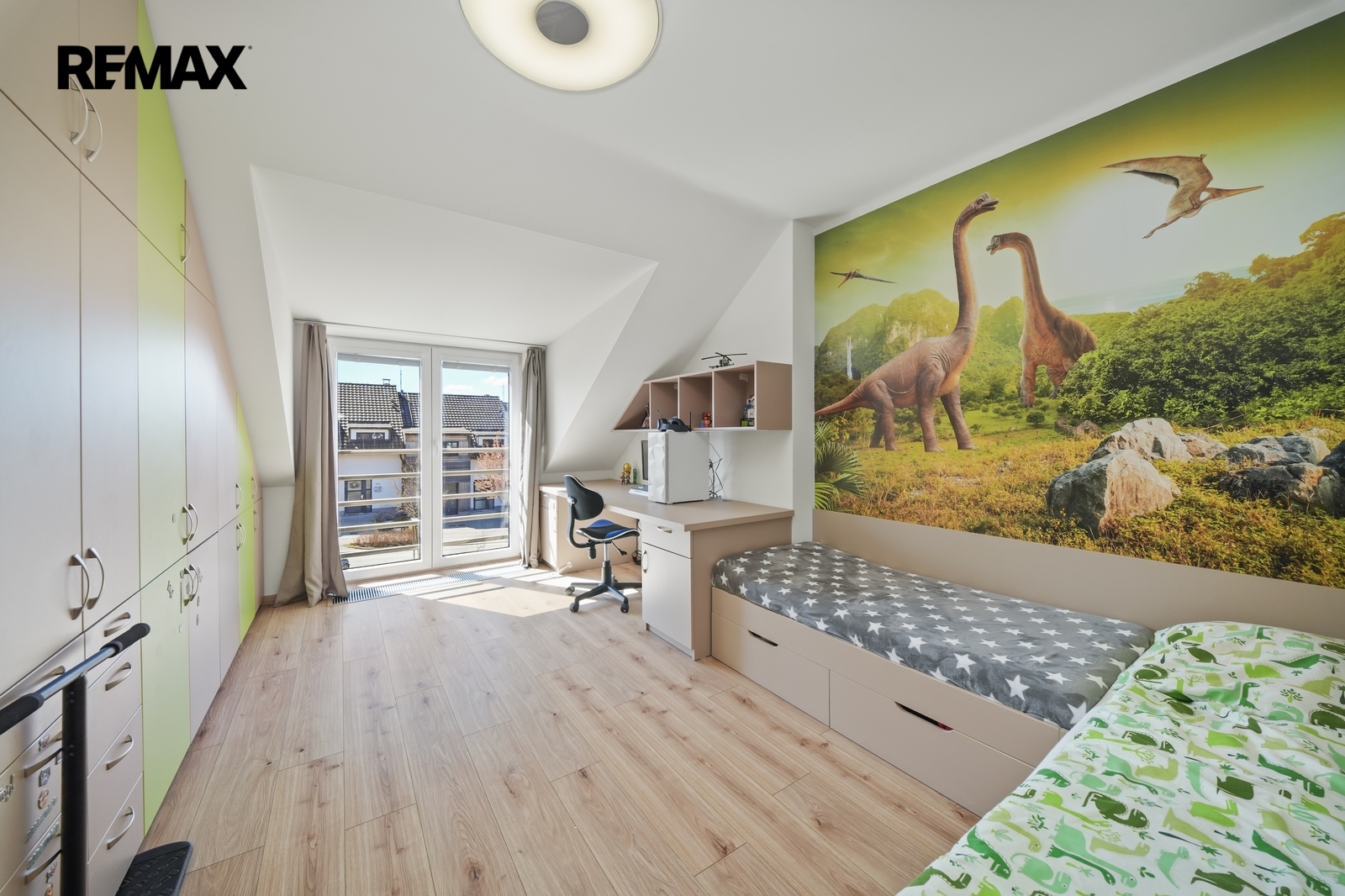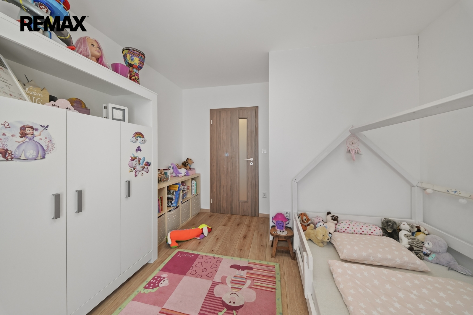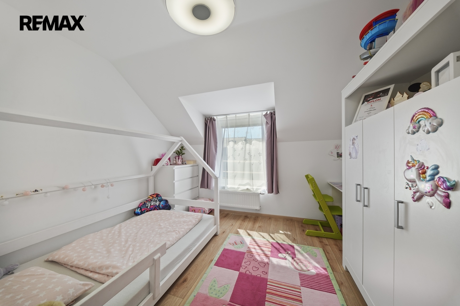 V patře domu se nachází dva dětské pokoje a hlavní ložnice, která je navržena jako soukromá zóna rodičů. Součástí je vlastní walk-in šatna, šatna s přípravou na druhou koupelnu i balkon, což nabízí možnost vytvoření komfortního apartmá dle vlastních představ.