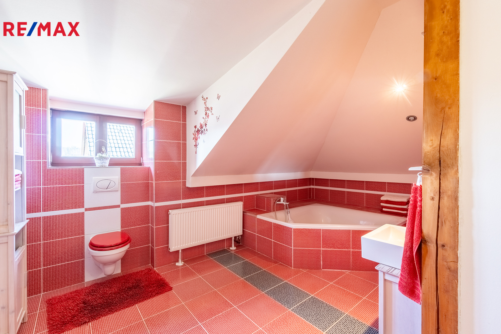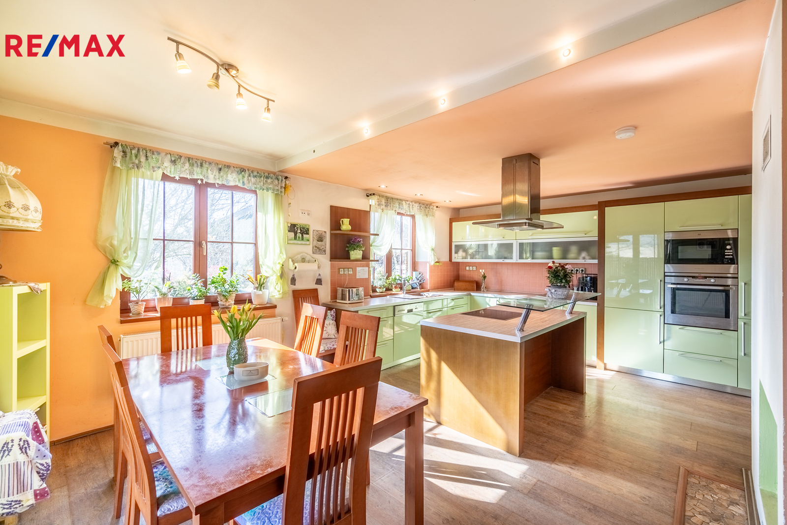 Srdcem domu je velký obývací prostor s kuchyní a jídelnou, kde dominuje krb. Dodává místu příjemné teplo i atmosféru domova. V listopadu bylo instalováno nové tepelné čerpadlo, které výrazně snižuje provozní náklady, takže bydlení je nejen komfortní, ale i úsporné.