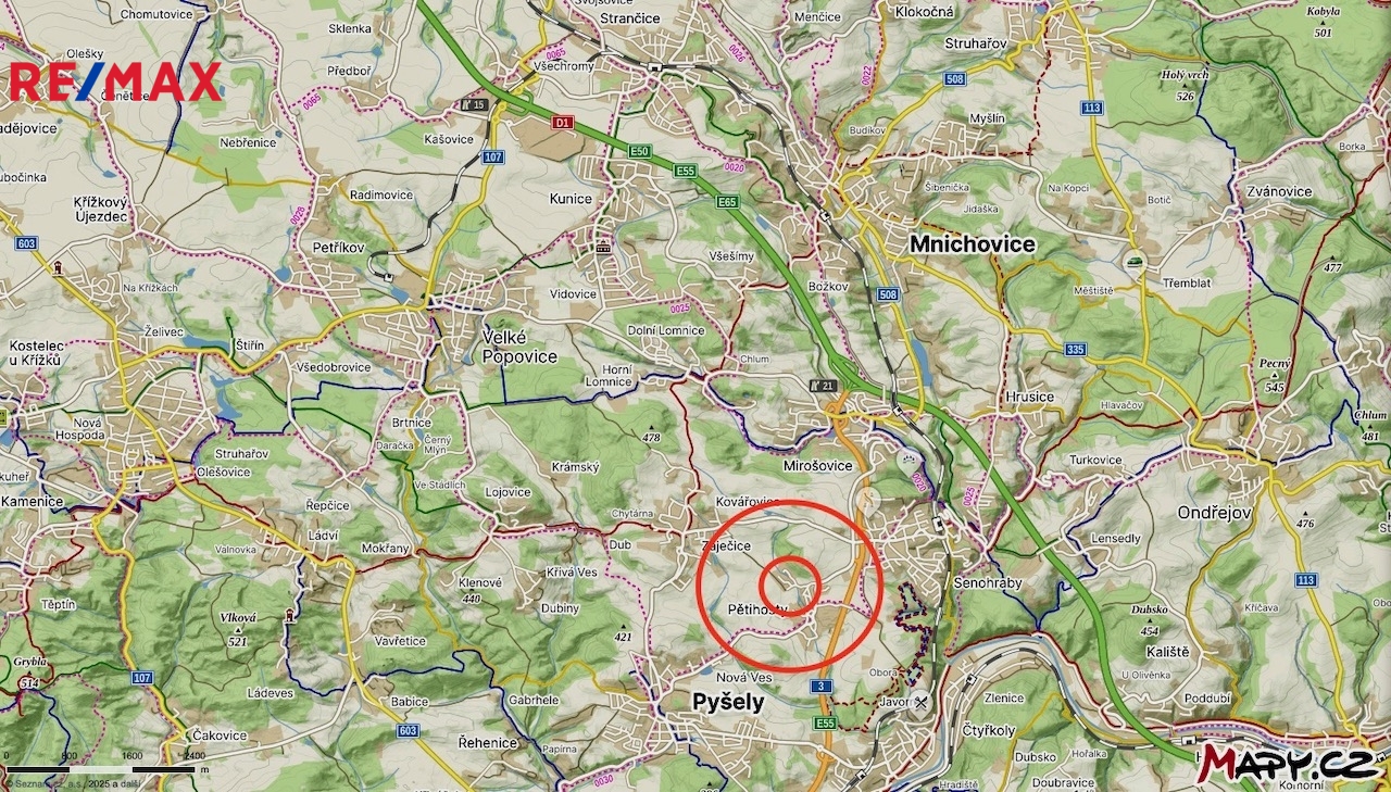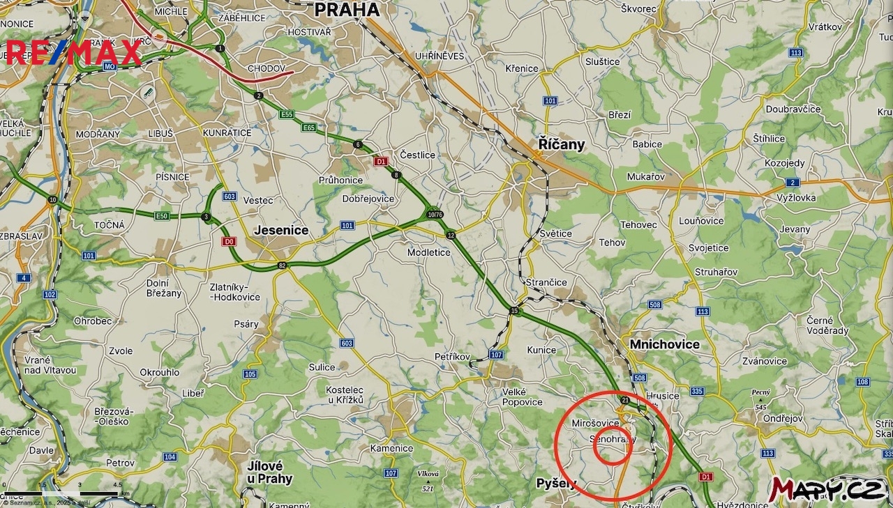 Veškerá občanská vybavenost se nachází v okolních obcích jen do 5 min dojezdu automobilem nebo autobusem (vždy do 5 min bez kolon). MŠ a ZŠ je v Pyšelích nebo v Senohrabech či Mirošovicích. Všude zde jsou i obchody, restaurace, pošty, i volnočasové aktivity pro děti i dospělé. Vlakové nádraží s častými odjezdy do centra Prahy je 3 min autem v Senohrabech.