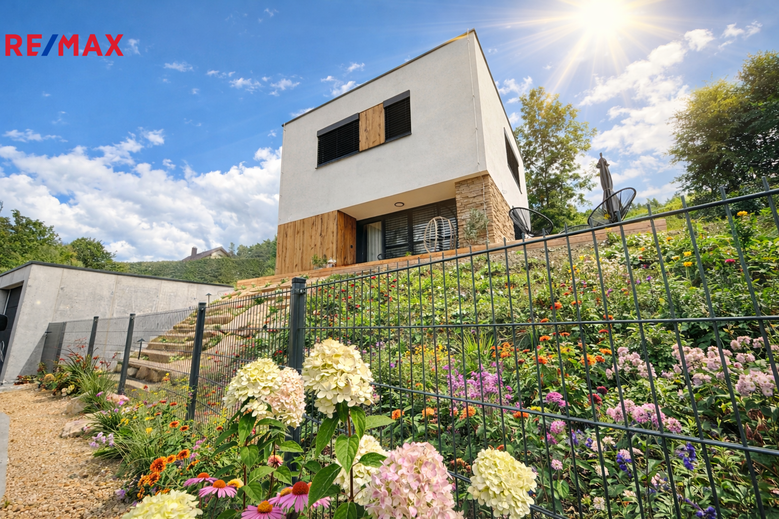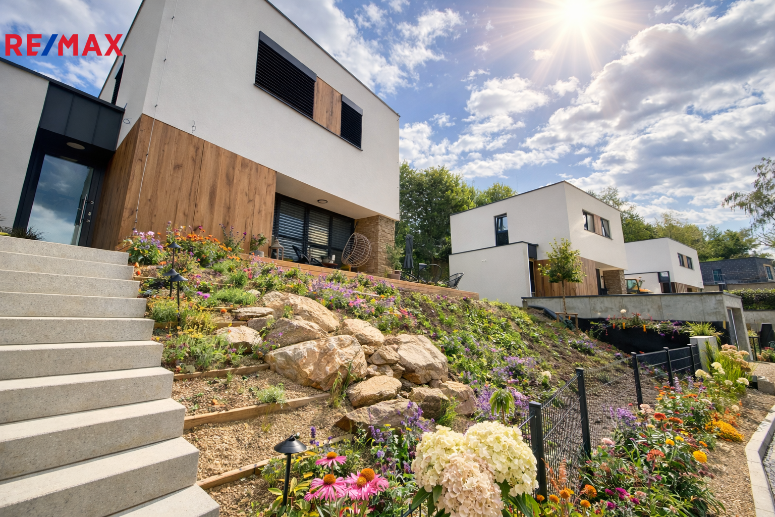 Exteriér domu vytváří harmonický dojem, který vás okouzlí svou pečlivě promyšlenou souhrou detailů - předzahrádka ozdobená okrasnou zelení, solitérním stromem, kameny i osvětlením. Betonová dlažba a pískované schody vytvářejí estetický vstup do domu. Žulová kostka u vjezdu na obecní park. stání u domu je odolná a nadčasová, stejně jako propustná betonová dlažba, která efektivně odvádí vodu. Svařovaný plot na bočních stranách a zadní části pozemku poskytne nejen soukromí, ale i bezpečí. Garáž je vybavená sekčními vraty a třífázovou zásuvkou , její kupní cena je 750.000,-Kč nad rámec kupní ceny domu.