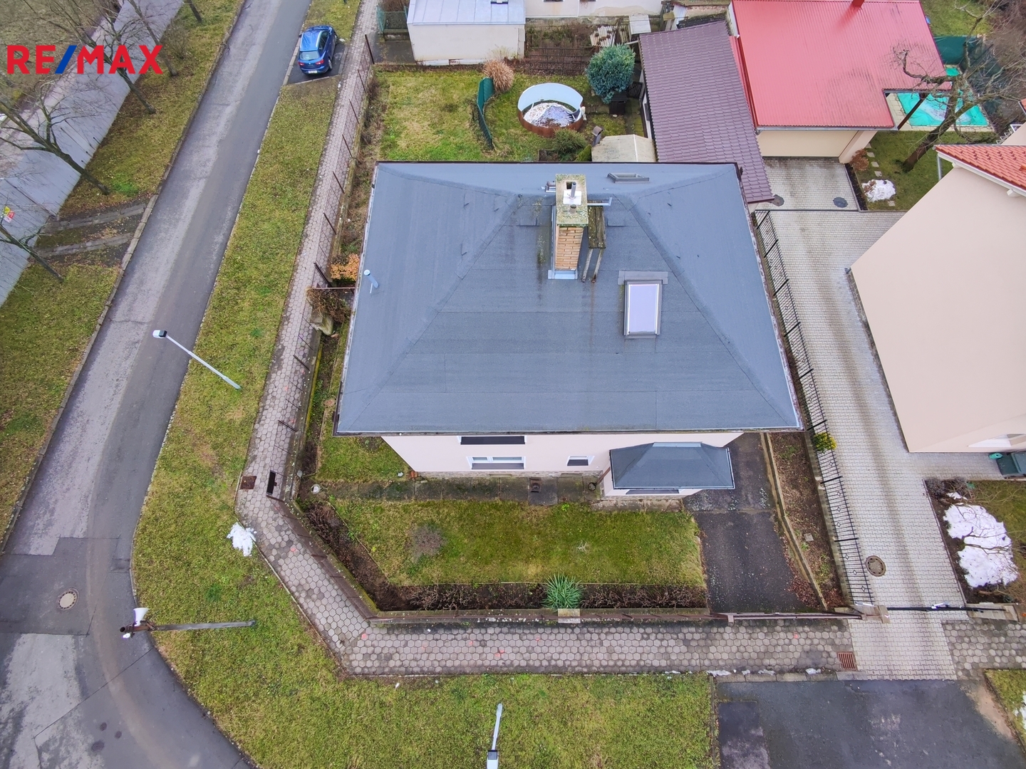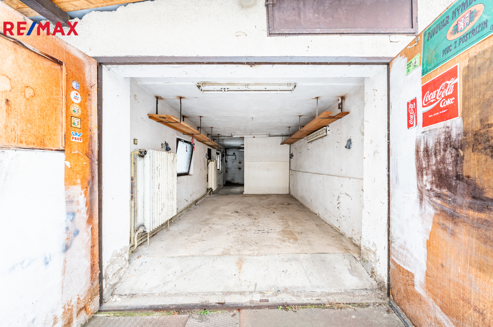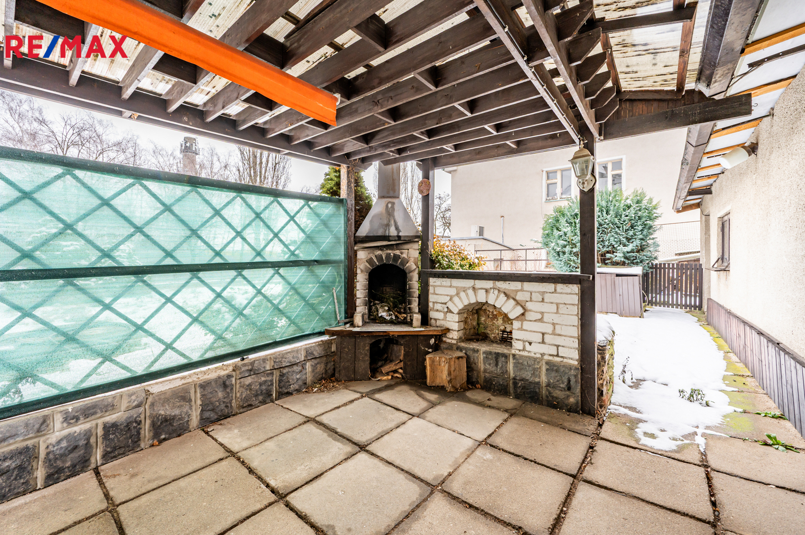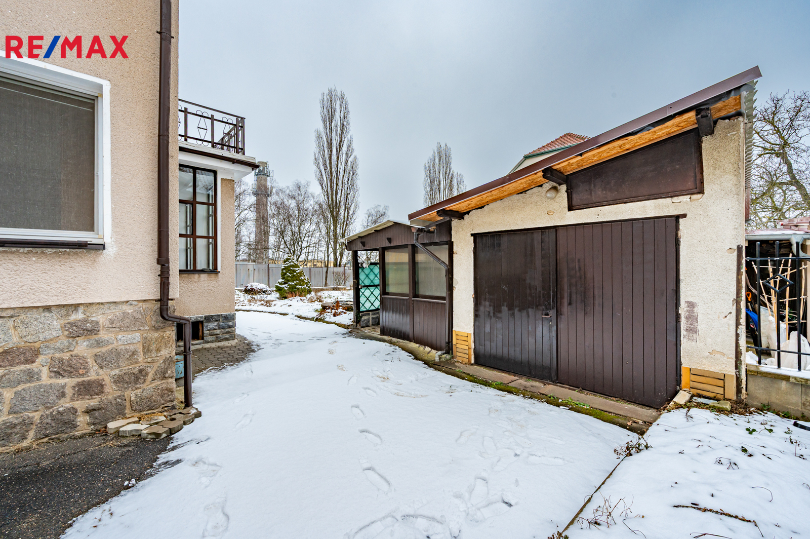 Dům se může pochlubit prostornou zahradou, v jejíž zadní části je garáž a zázemí pro zahradu a dům, které může sloužit jako úložné prostory. Parkování je možné na pozemku, v zadní garáži na zahradě nebo volně na ulici. Na zahradě je dále přístřešek s venkovním krbem.