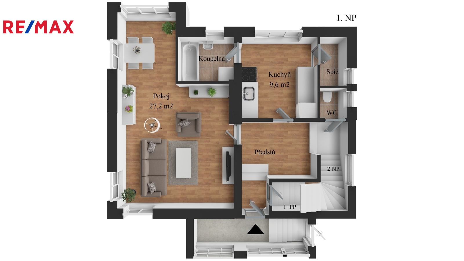 Přízemí: obývací pokoj, kuchyně, předsíň, spíž, koupelna a samostatné WC